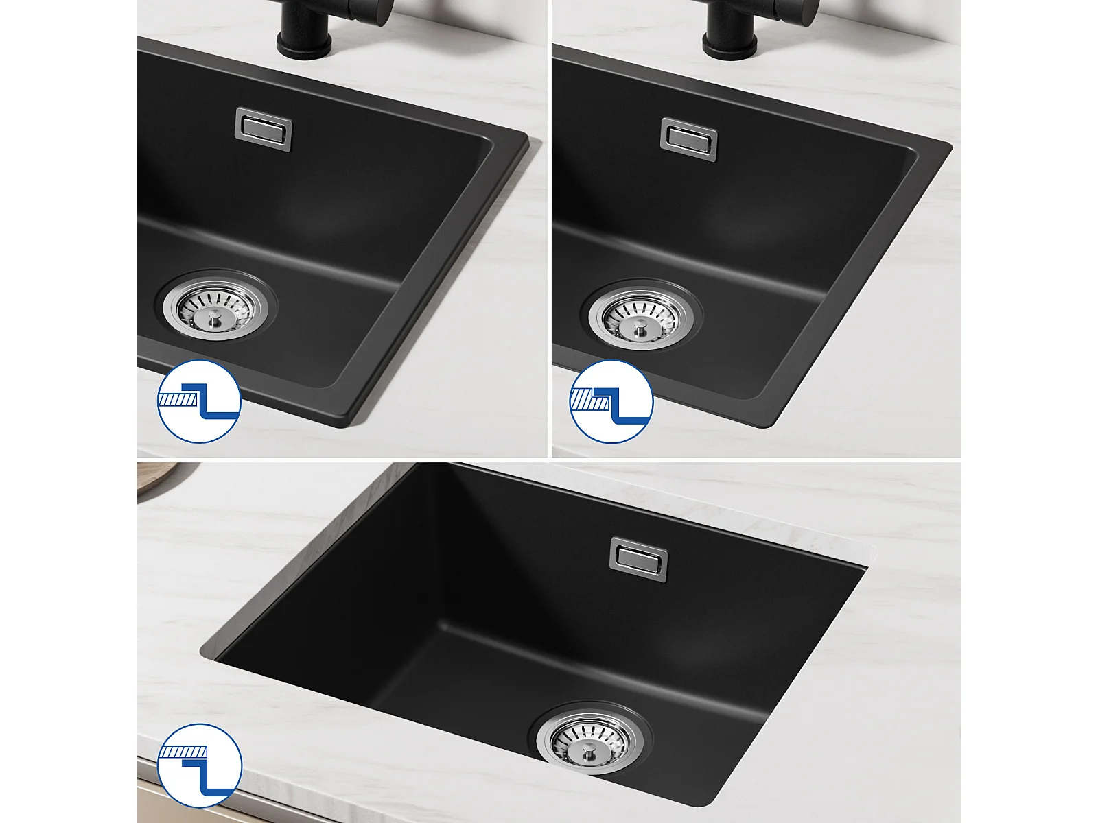 Kom Kwarts- en Harsgootsteen, 3 Montageopties, 50*44*20cm + Zwarte Opvouwbare Keukenmengkraan