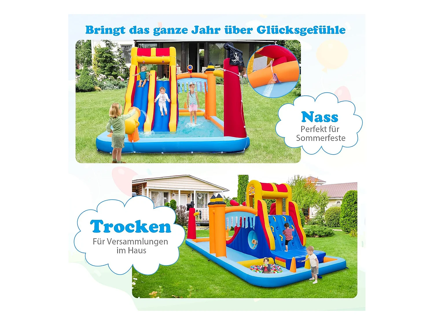 Springkasteel met droog-/waterglijbaan, springgebied, kinderbadje, waterkanon, basketbalkorf en boksspel, Bouncy Castle, 578 x 408 x 250 cm