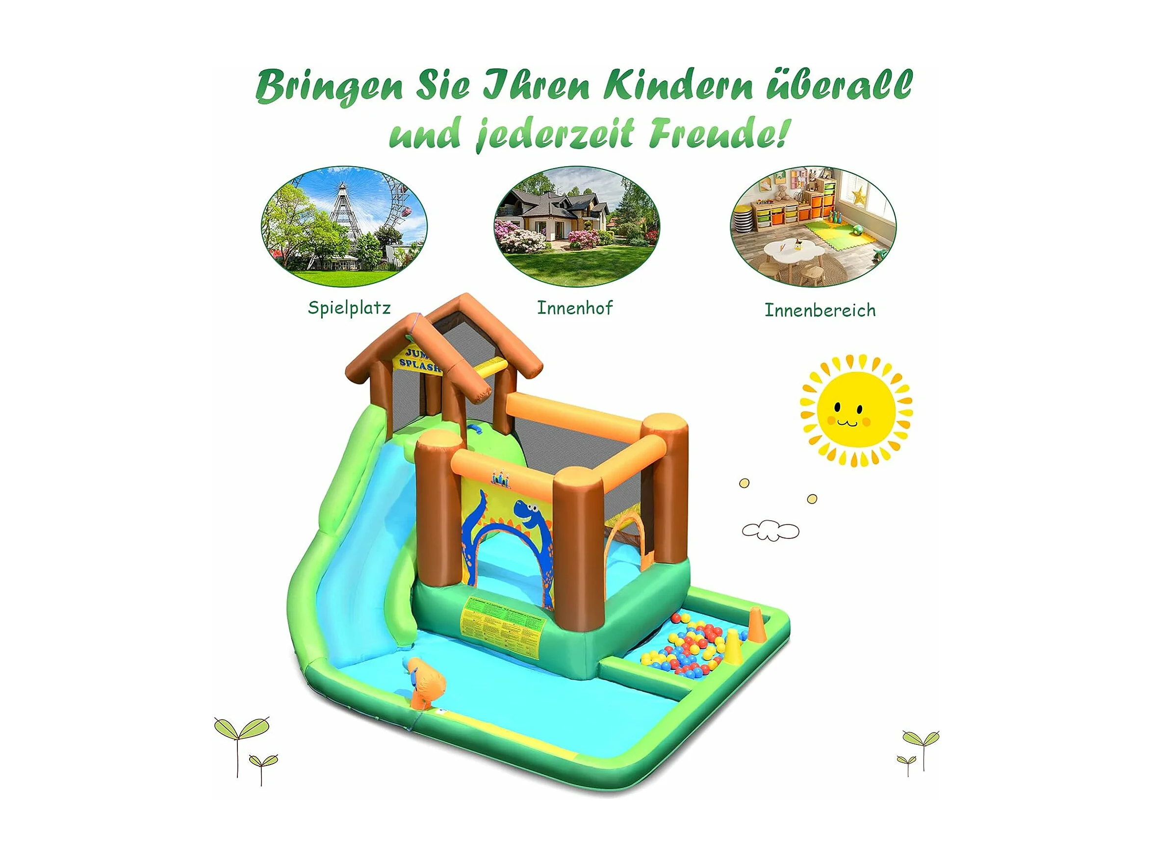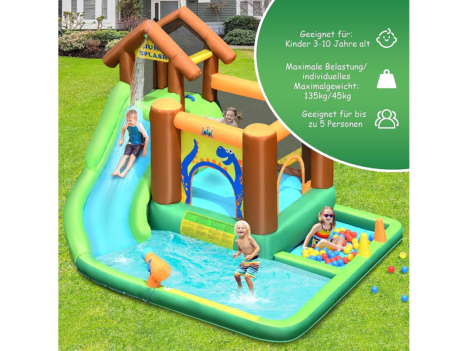 Springkasteel met ventilator, waterglijbaan, waterspeelcentrum met glijbaan, waterpark, kinderbadje, 368 x 303 x 230 cm AB92918