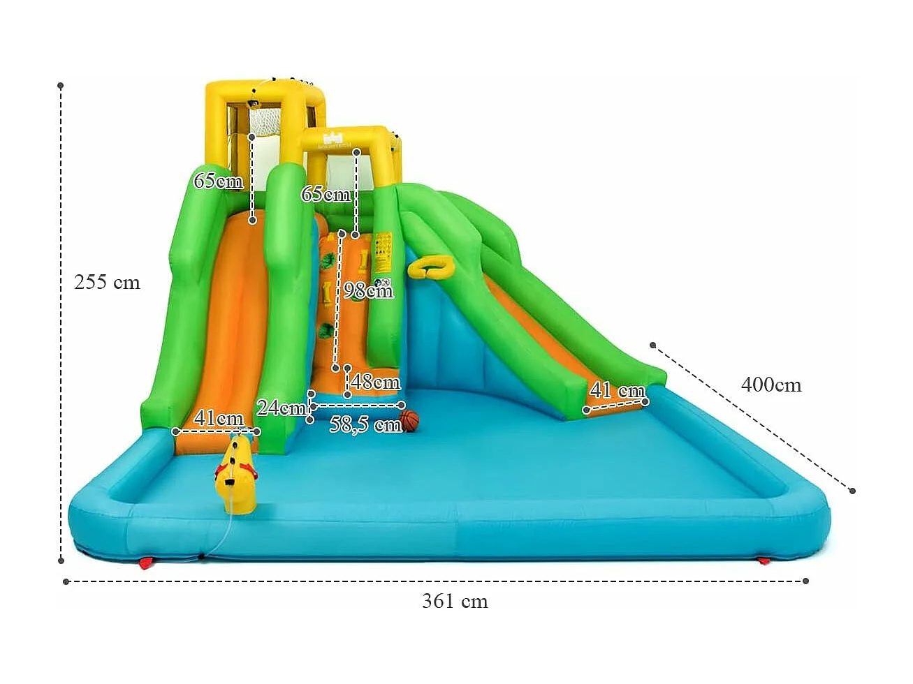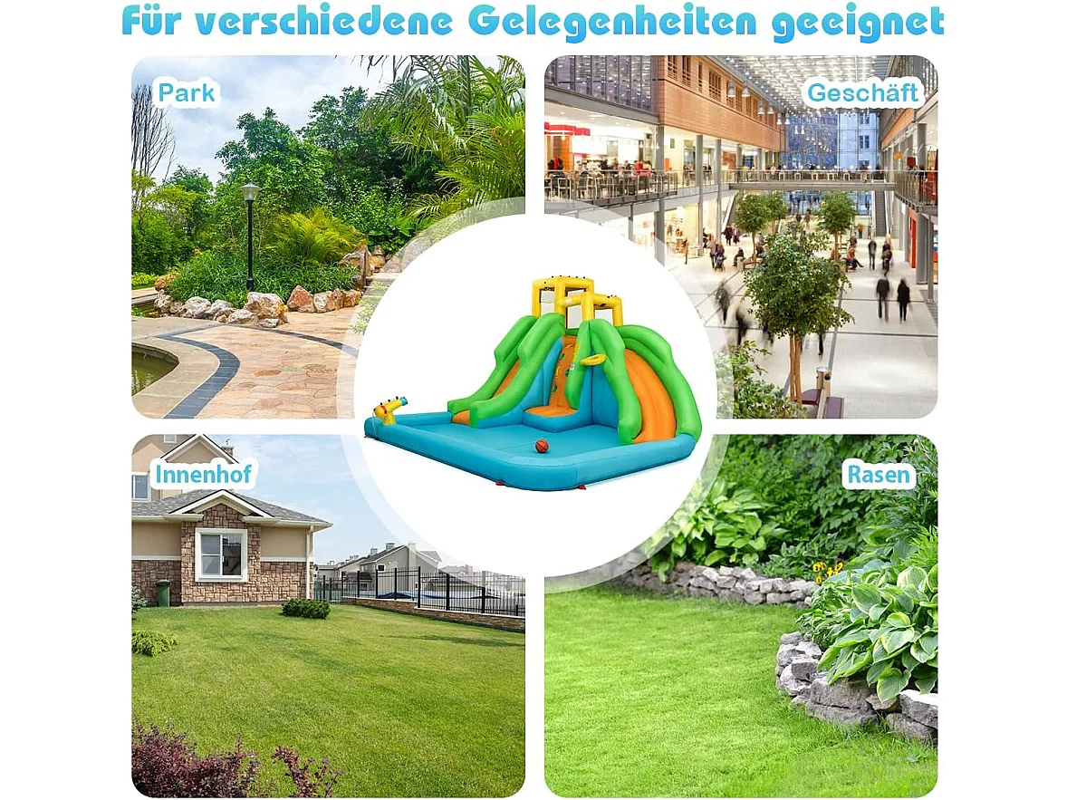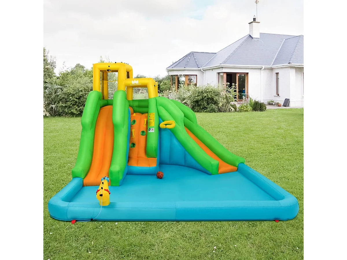 Springkasteel, waterpark met twee glijbanen, klimwand, basketbalmand, kinderbadje en waterkanon, haringen, 400 x 361 x 255 cm