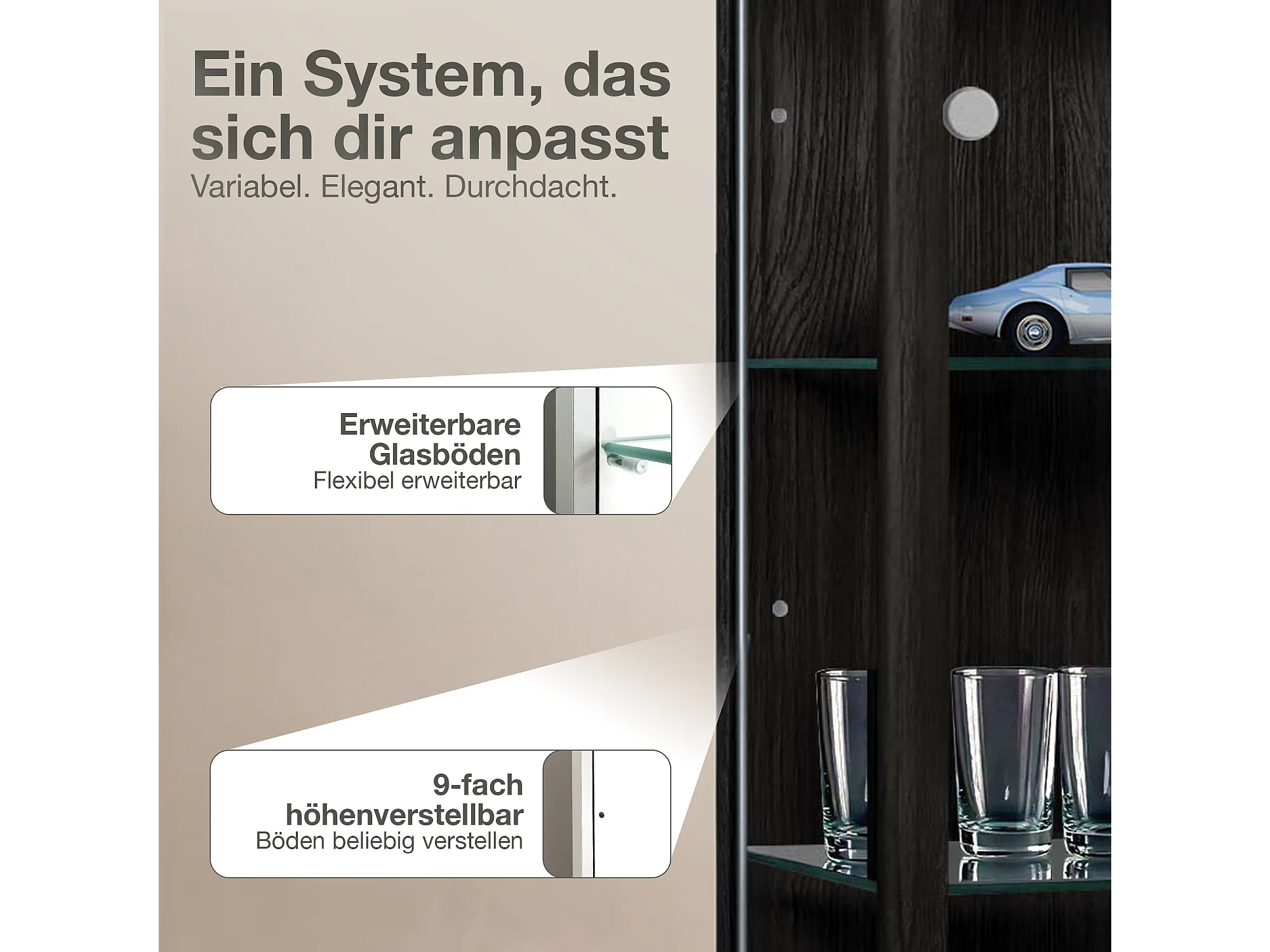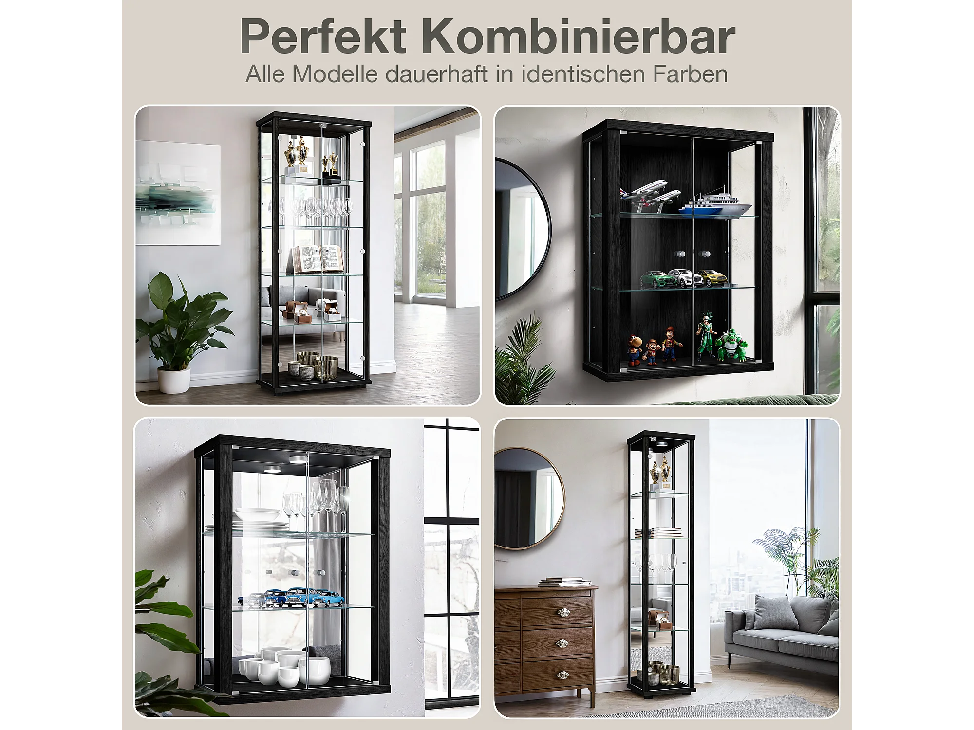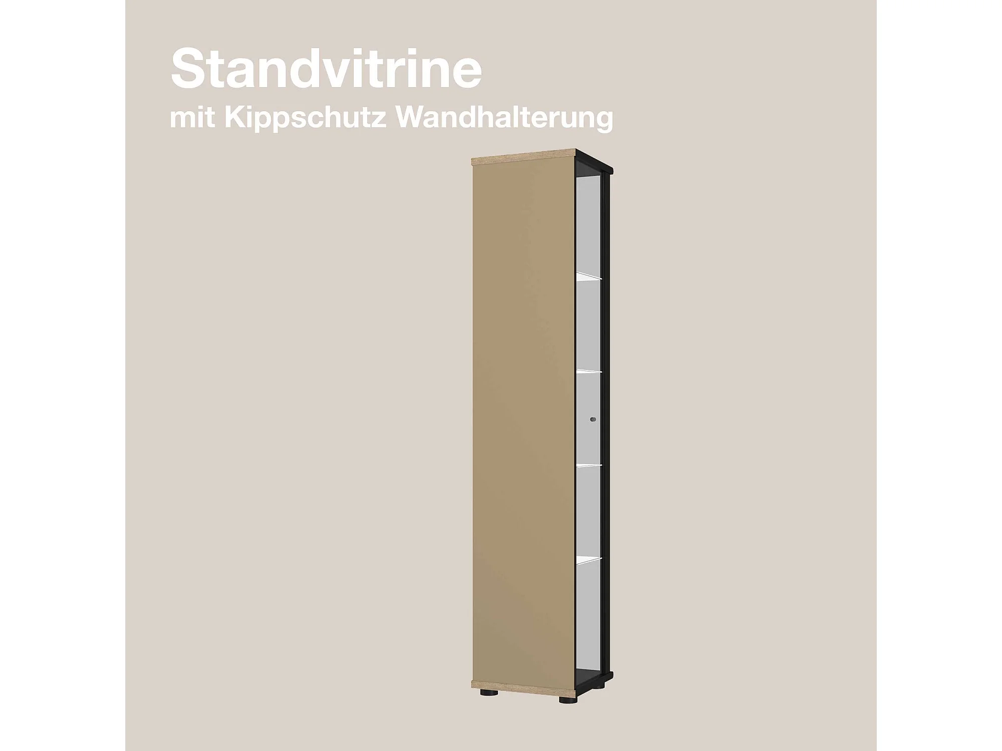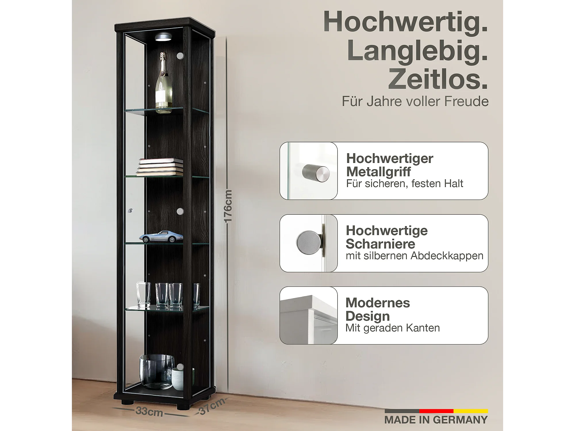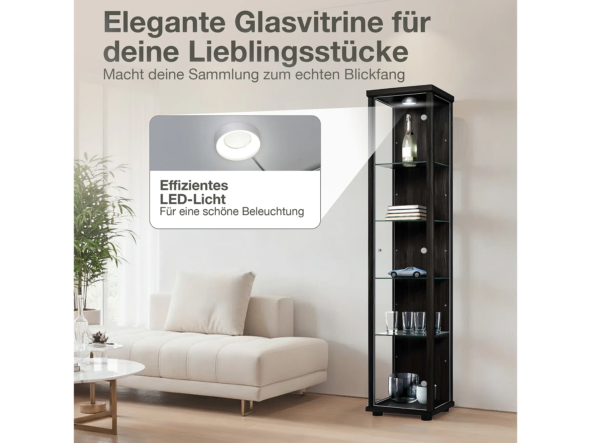Staande vitrine met 1 deur, 4 in hoogte verstelbare glasplanken - Met LED-verlichting - 176x37x33 cm - Zwart