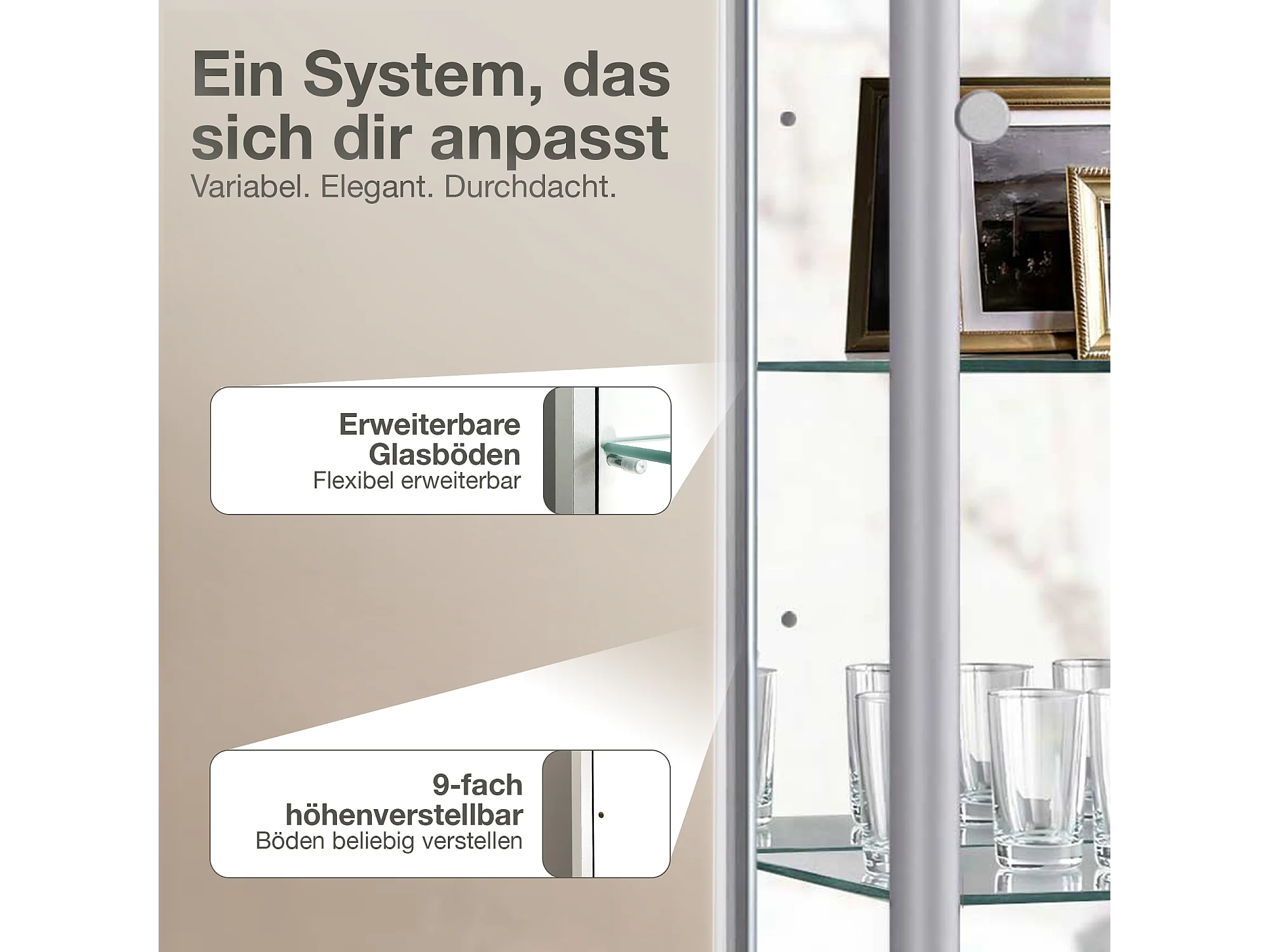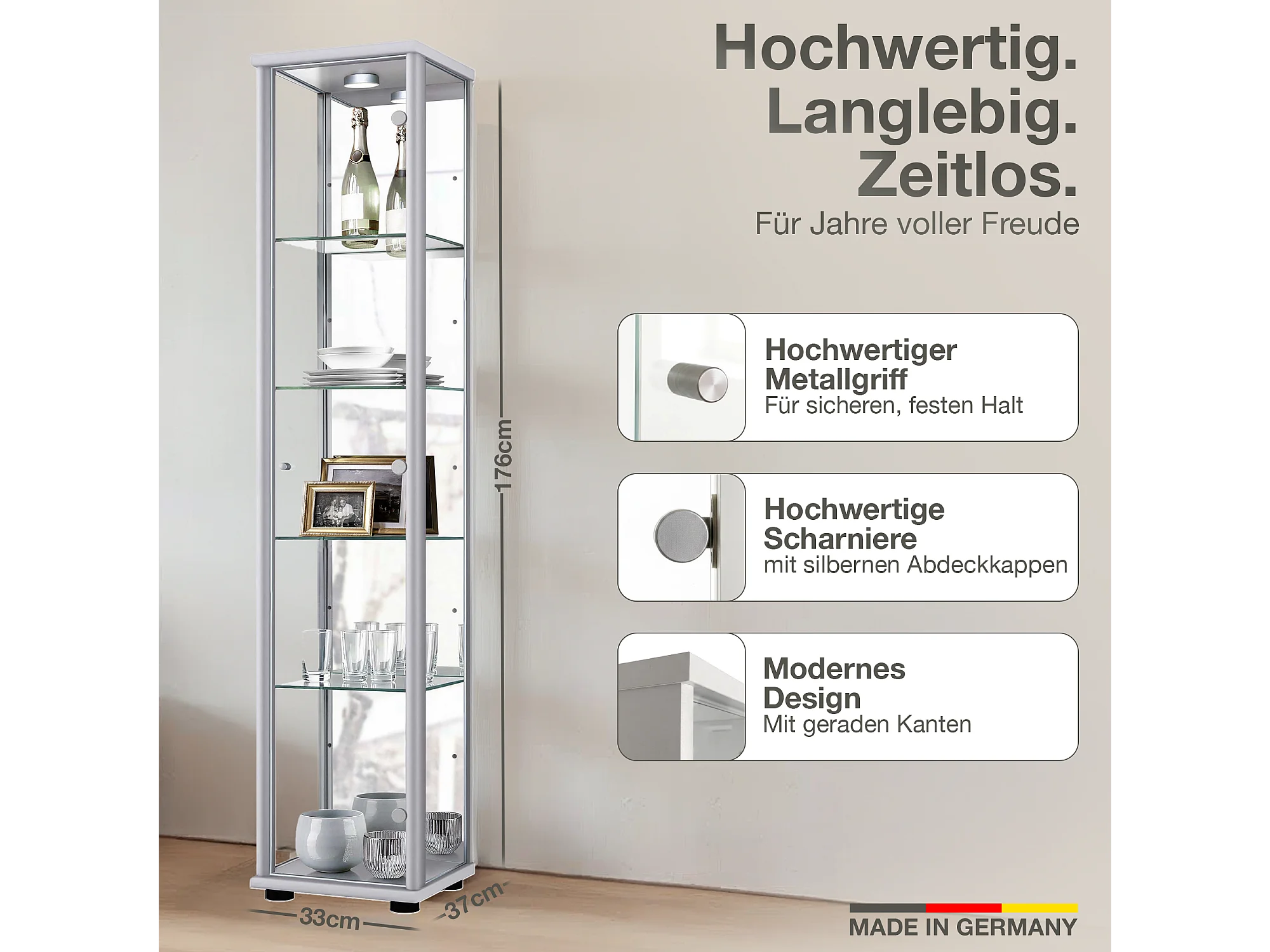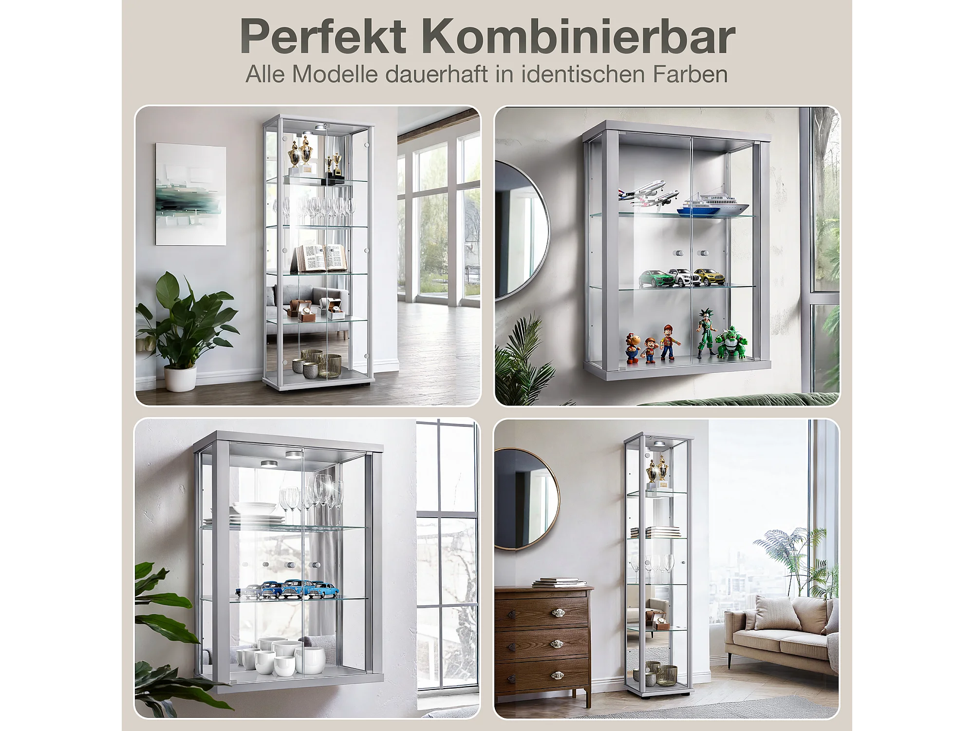 Staande vitrine met 1 deur, 4 in hoogte verstelbare glasplanken & spiegel - Met LED-verlichting - 176x37x33 cm - Zilverkleurig