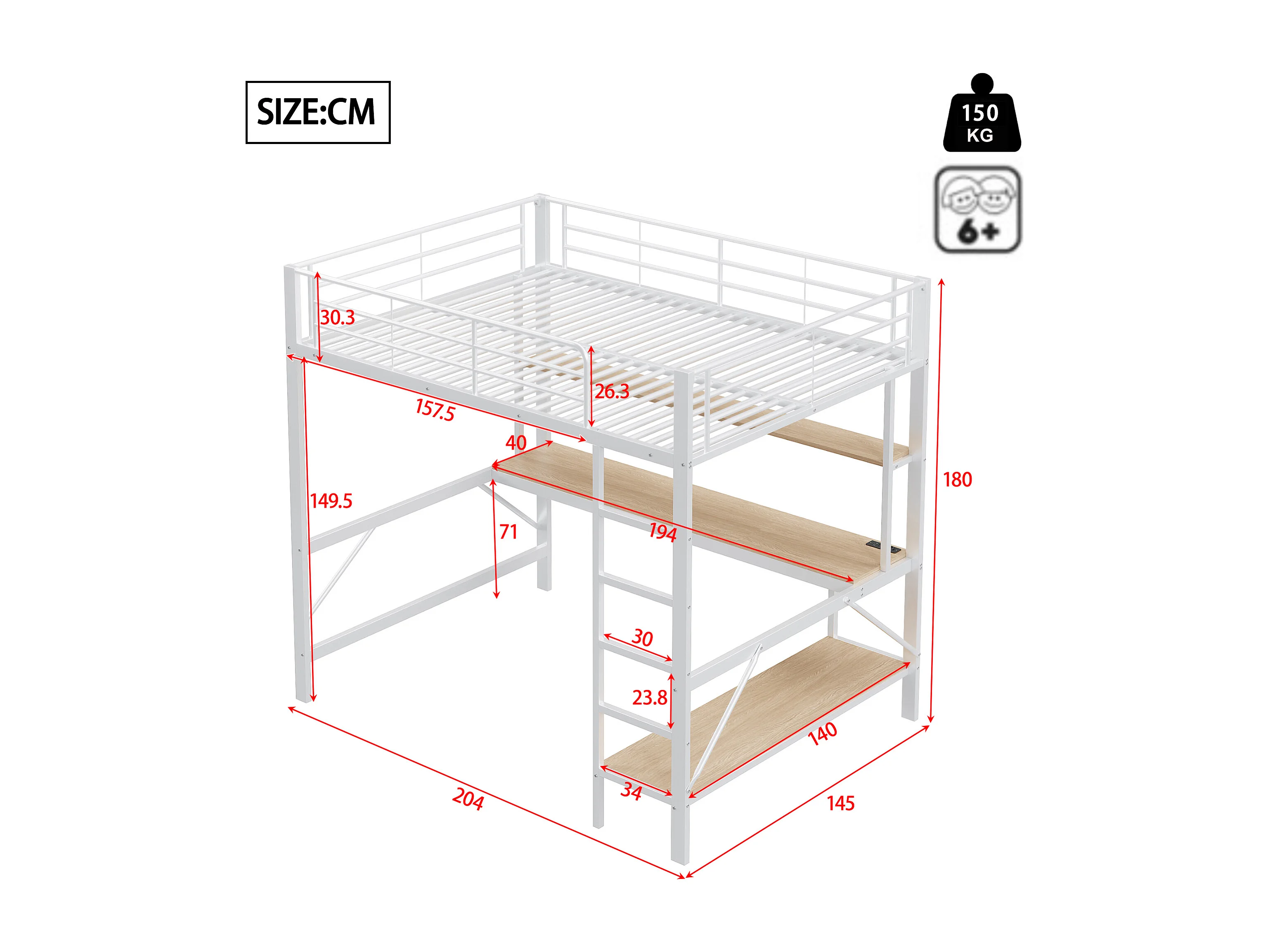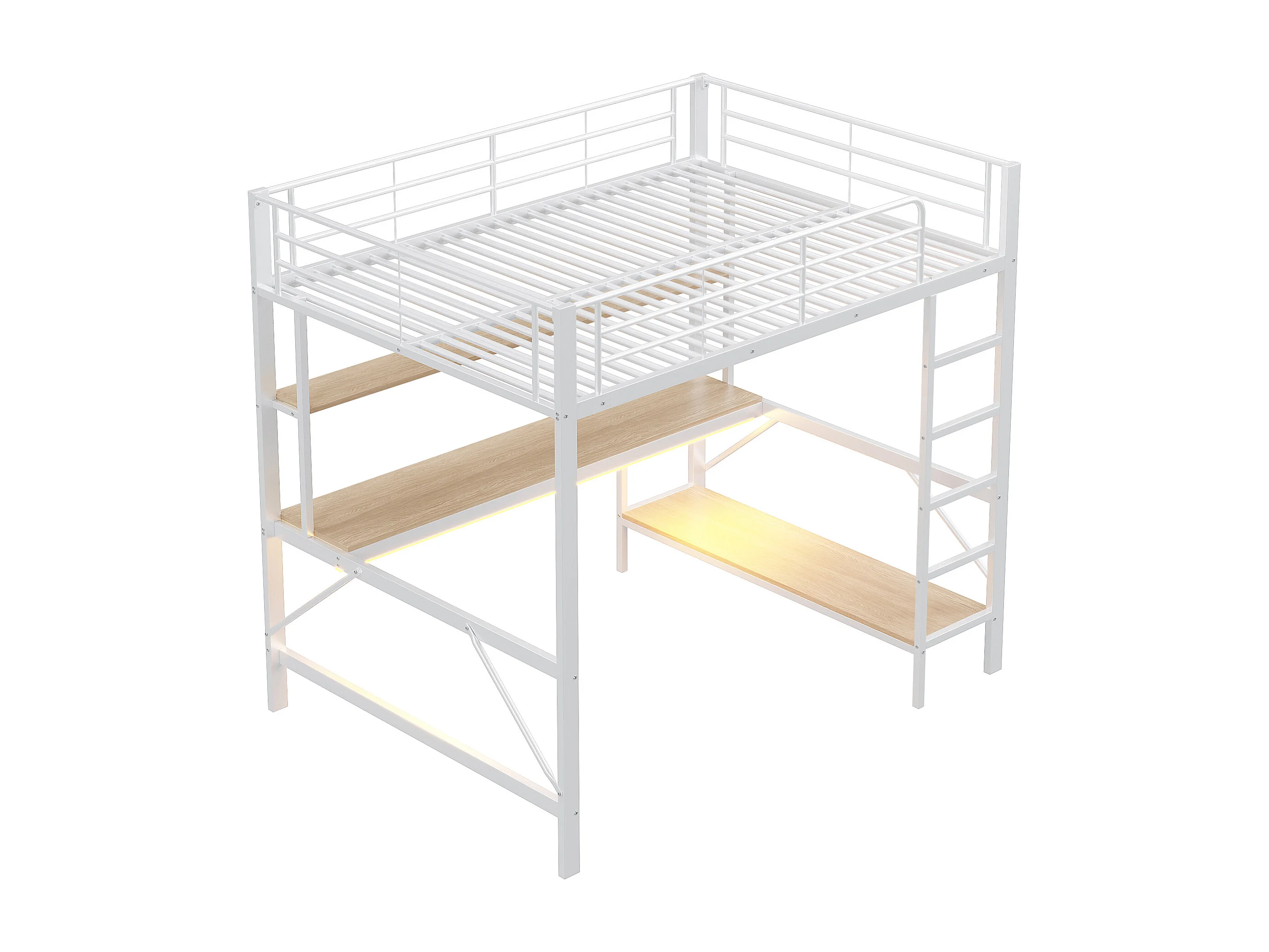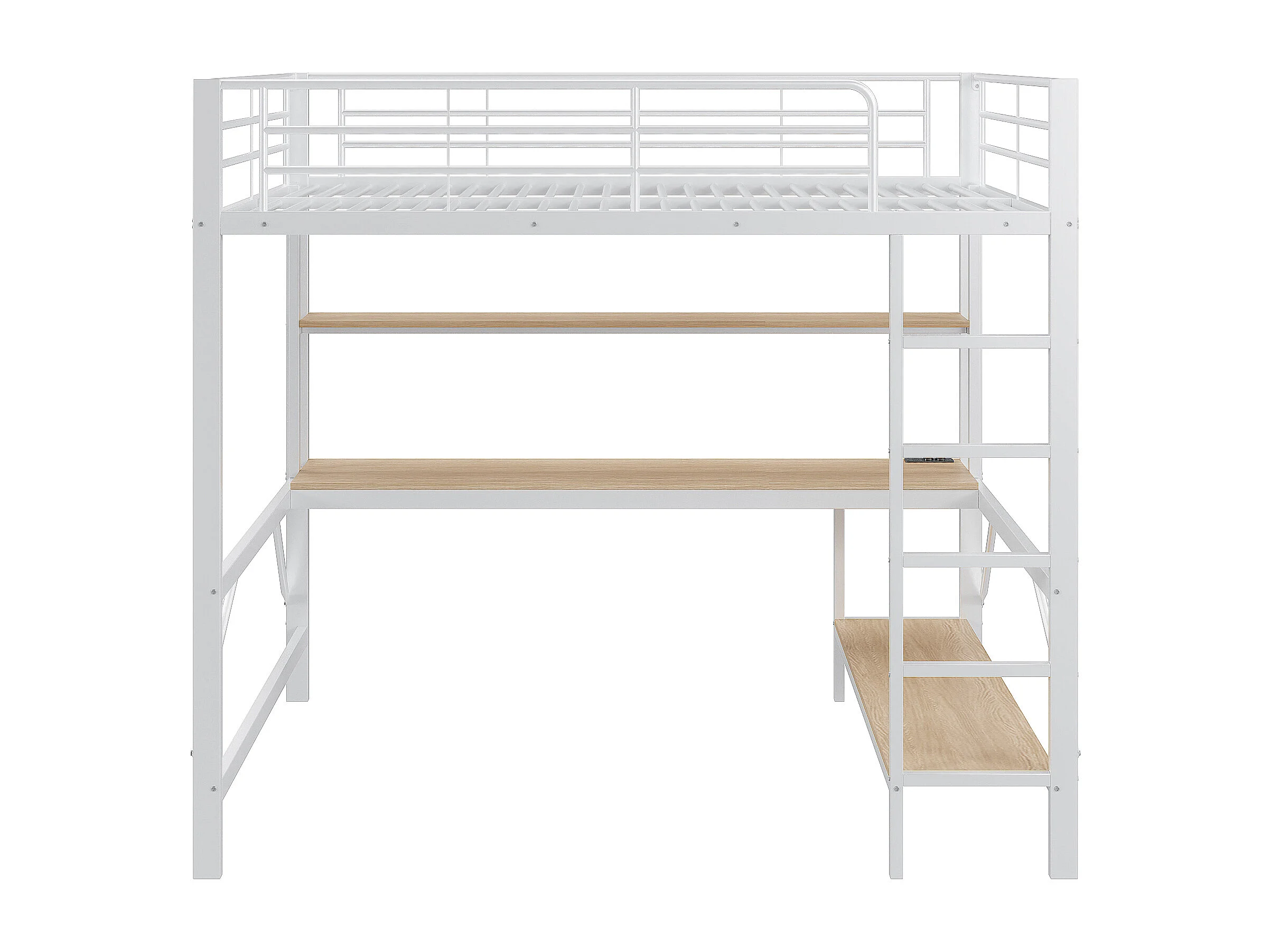 Stapelbed 140x200cm, met veiligheidshekje, ladder, USB-poorten, LED-verlichting, bureau, plank, metaal, wit, matras niet inbegrepen