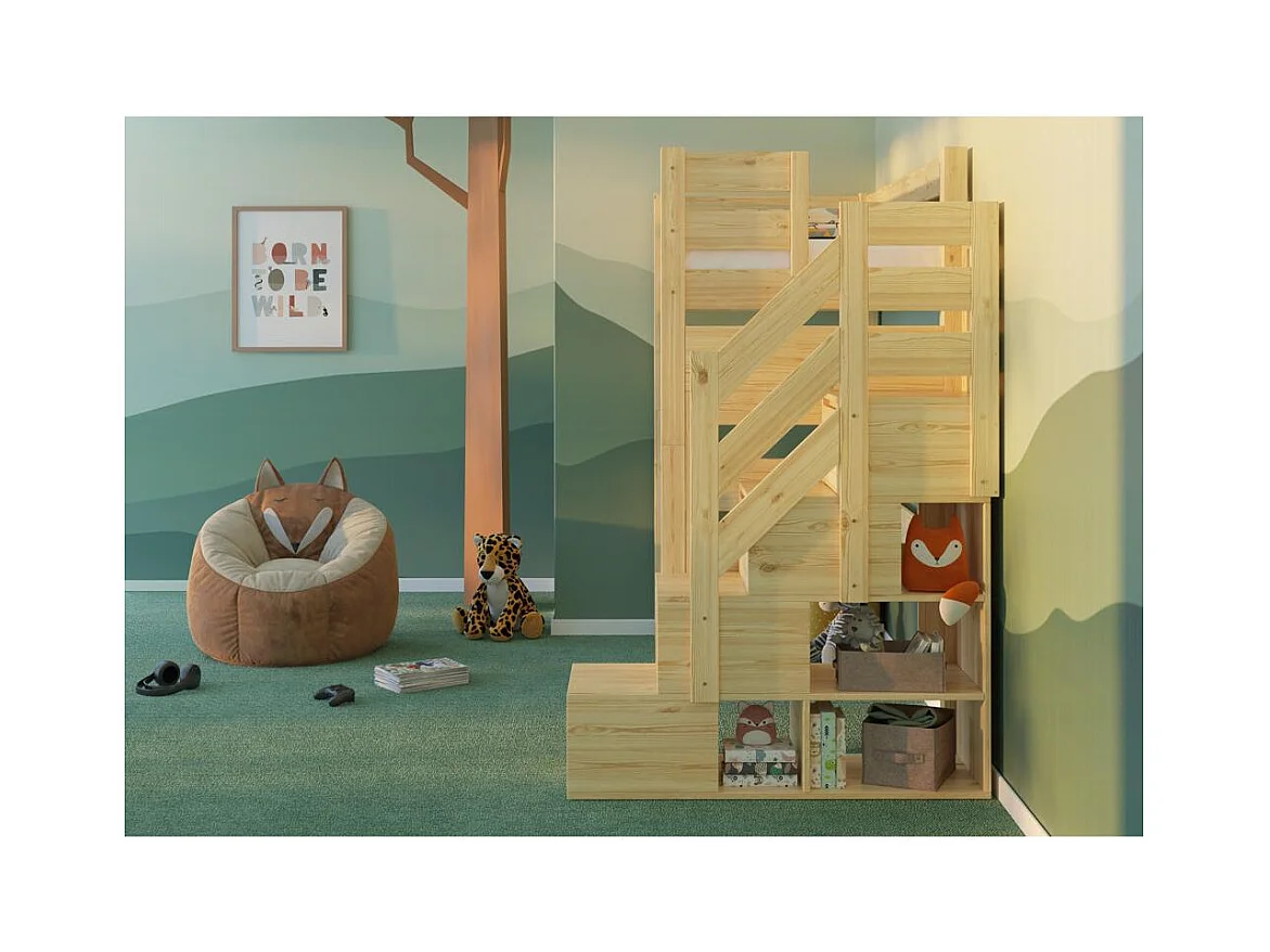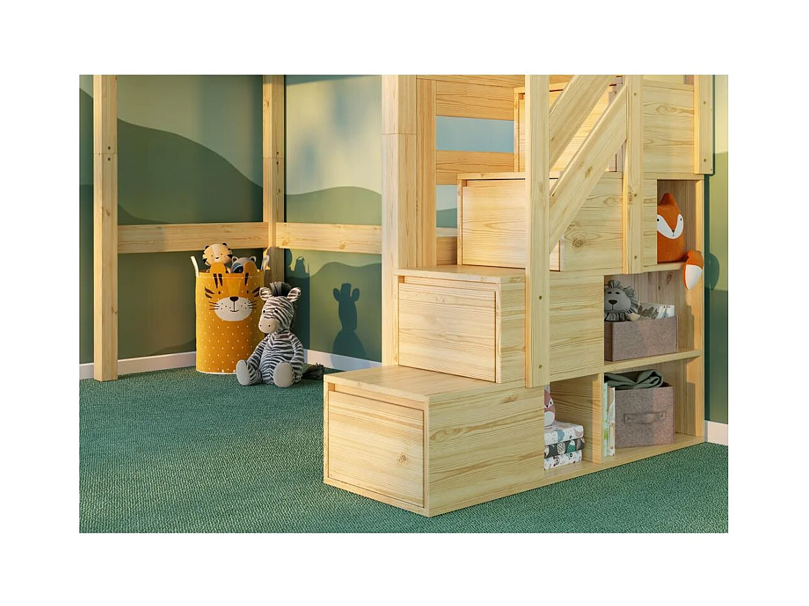 Hoogslaper 90 x 200 cm met bureau, planken en opbergruimte, veiligheidsladder met lades, frame van natuurlijk hout (205 x 126 x 180 cm)
