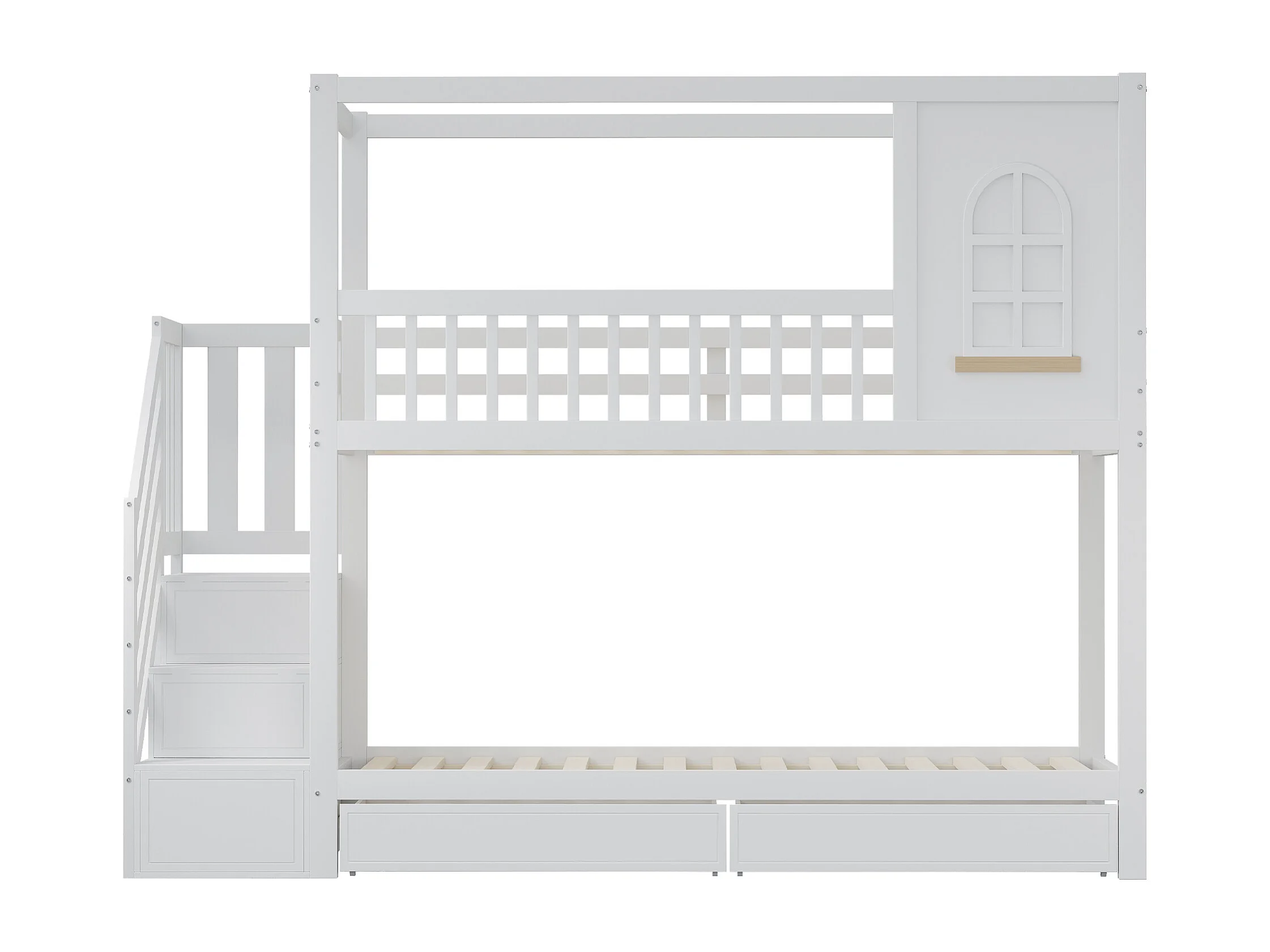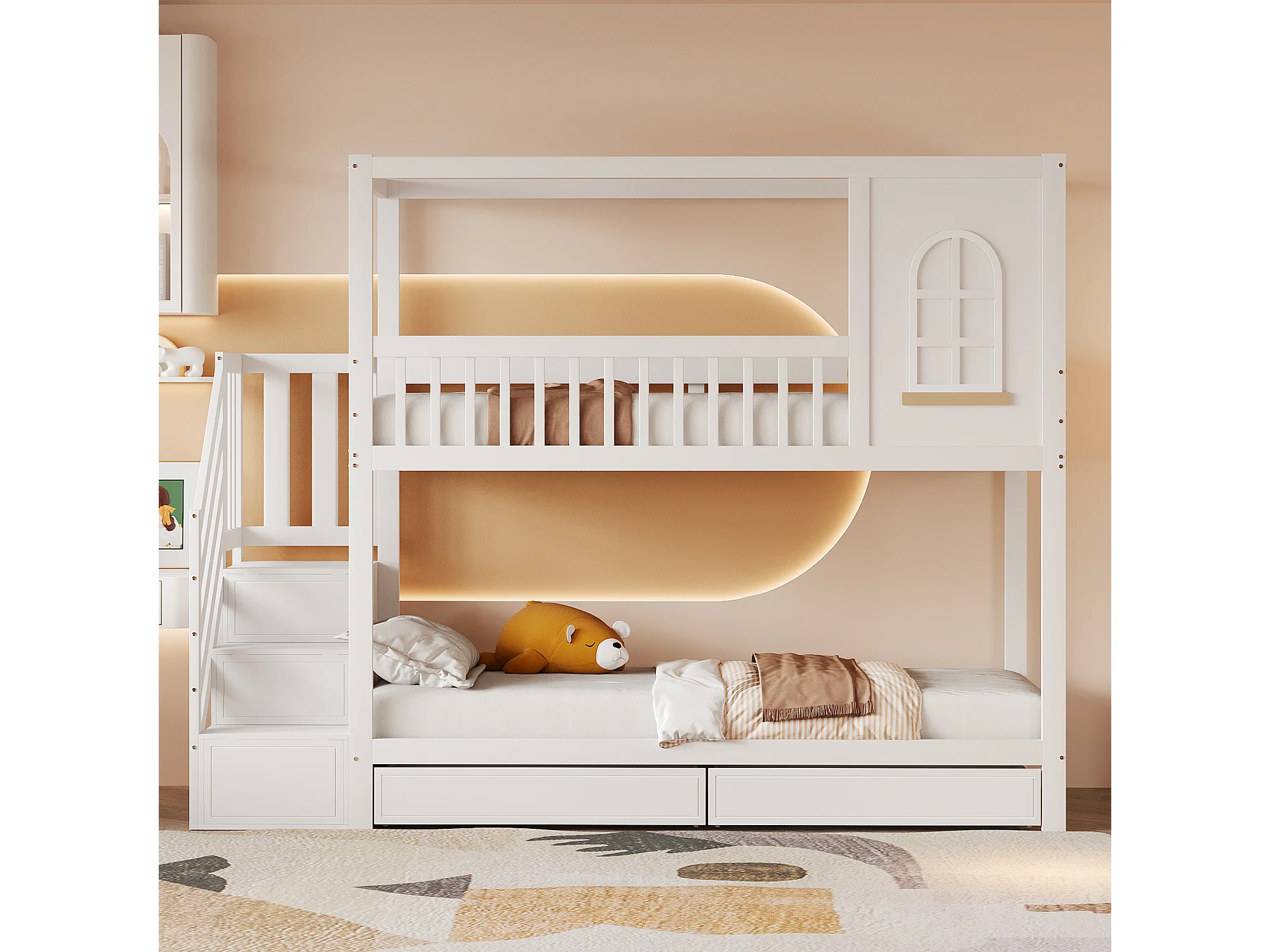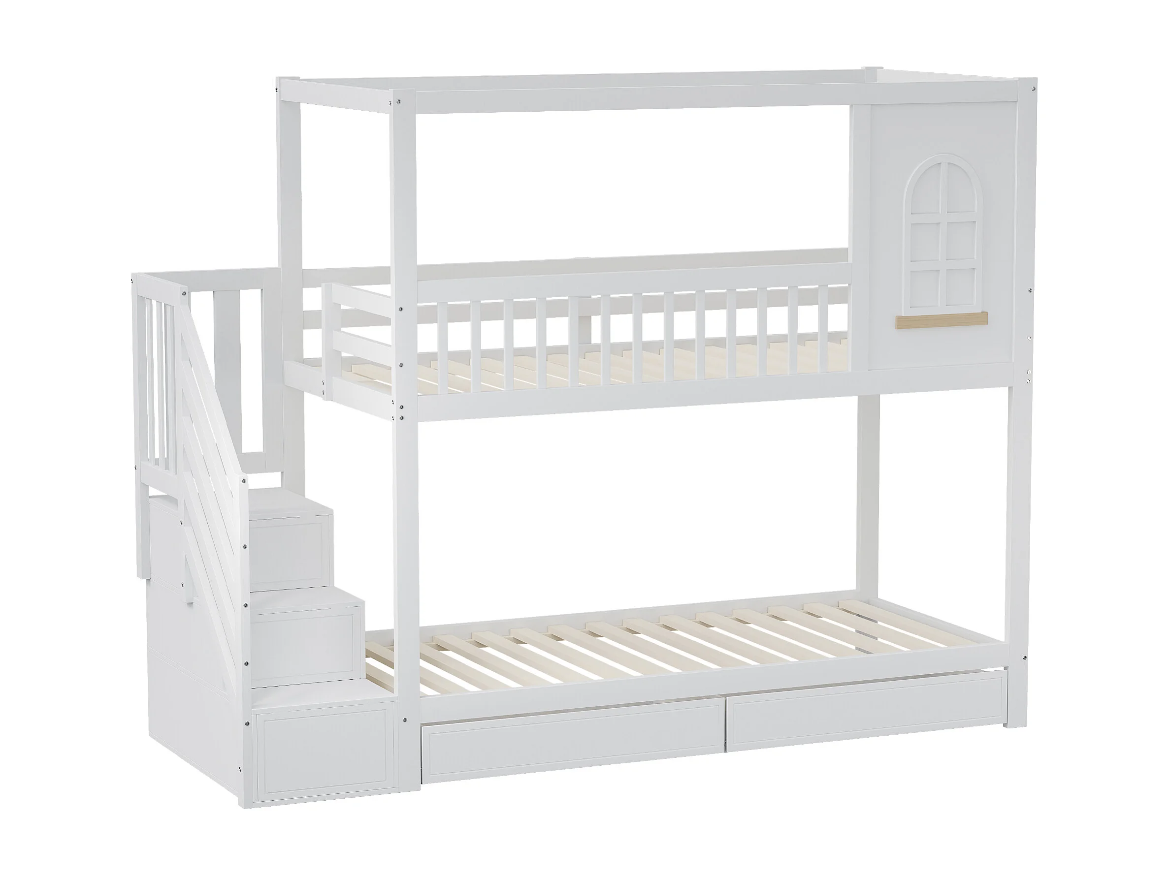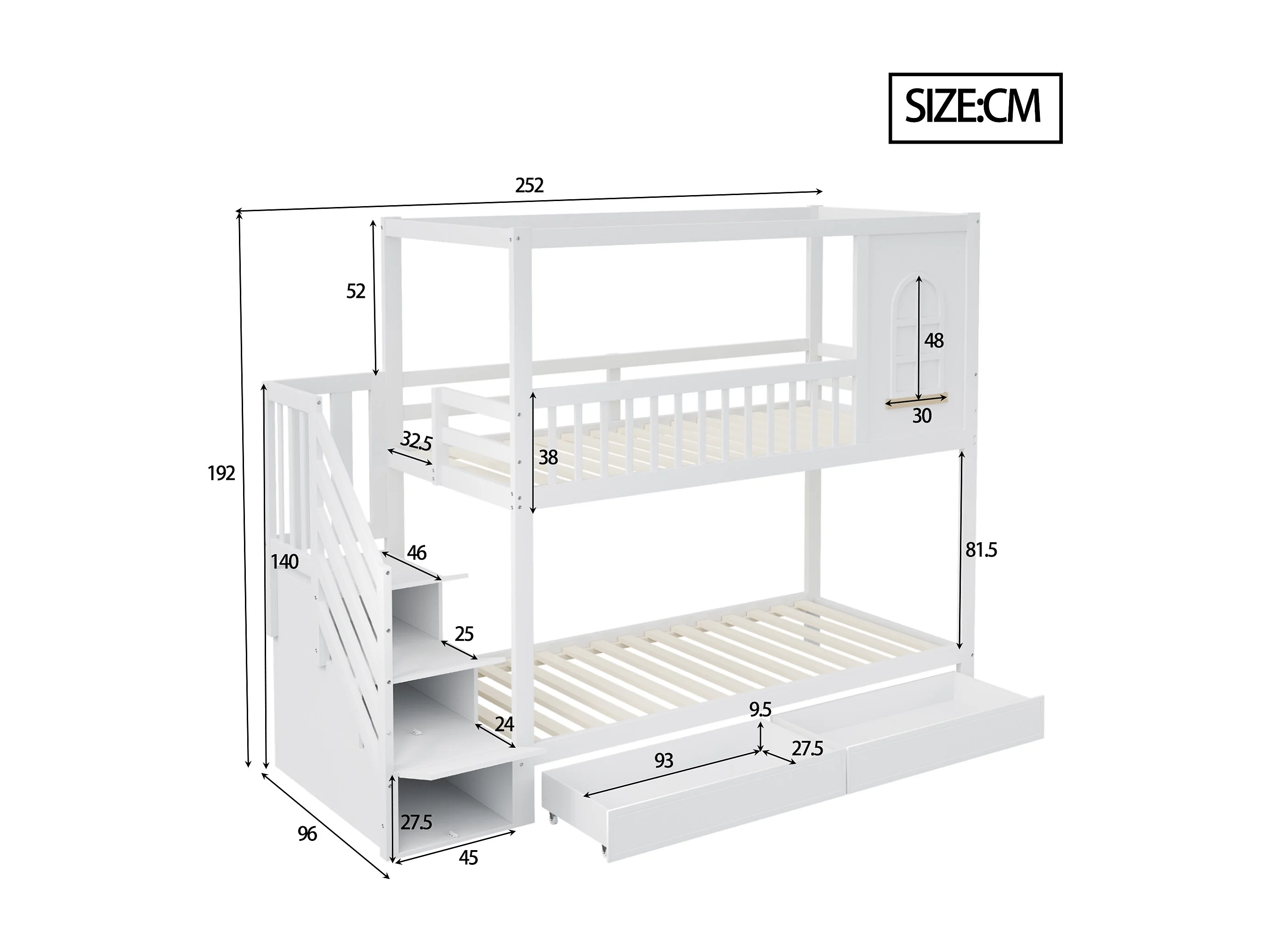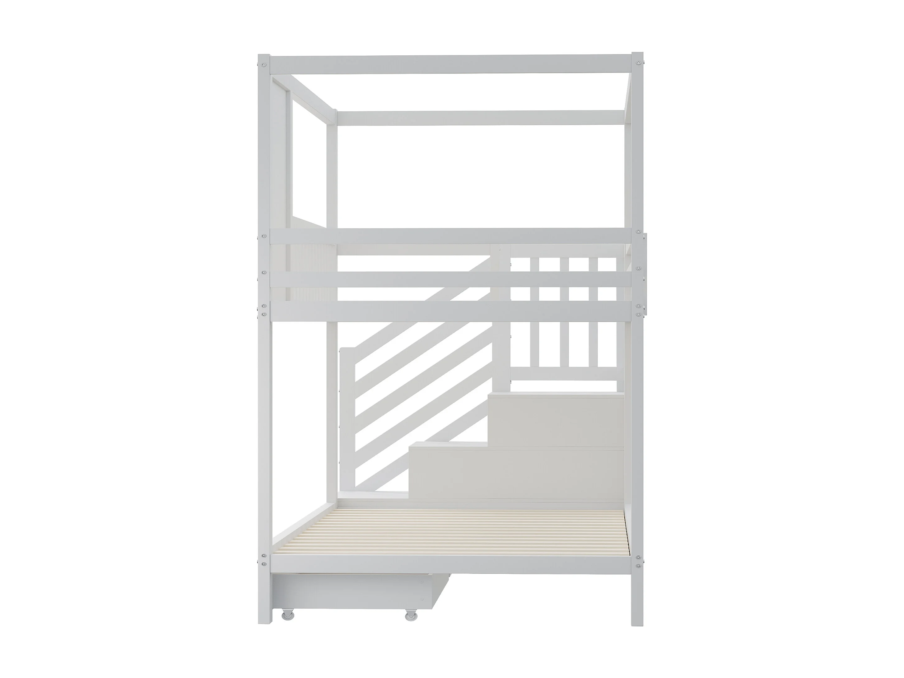 Stapelbed 90x200cm, kinderhutbed met trap en 1x lattenbodem bovenaan, massief houten frame, hout wit