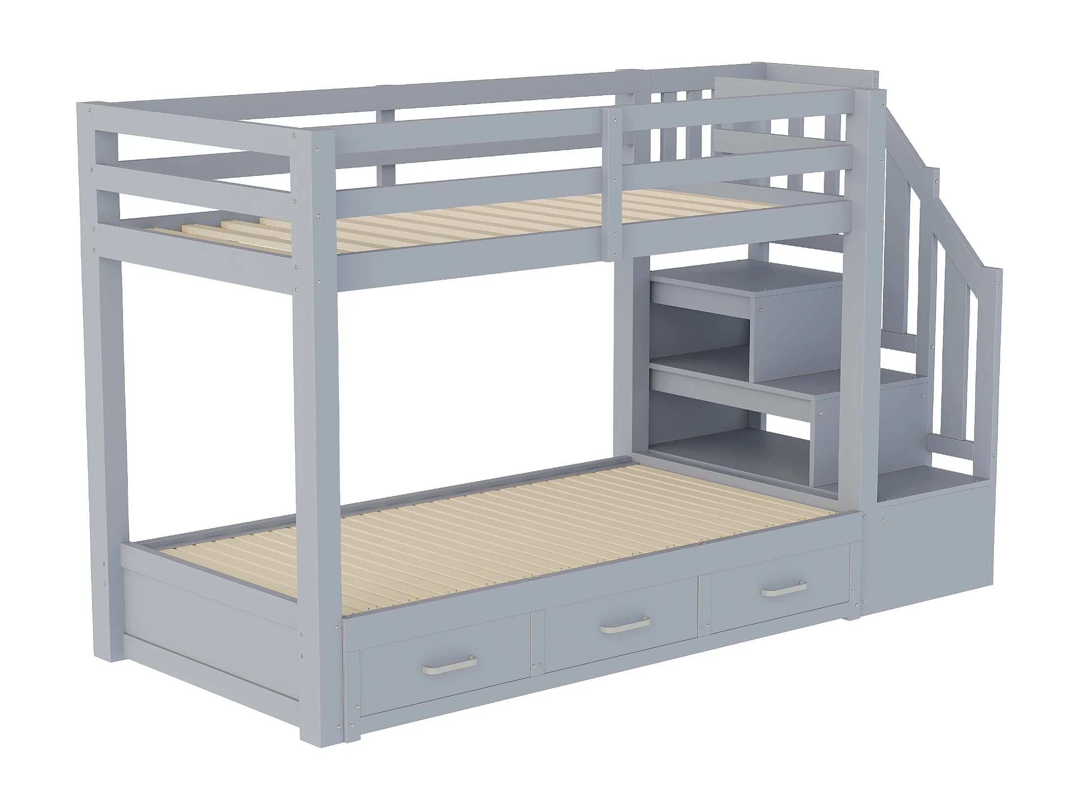 Stapelbed 90 x 200 cm met uitschuifbed 90/180 x 190 cm en 3 lades - houten bed, grijs