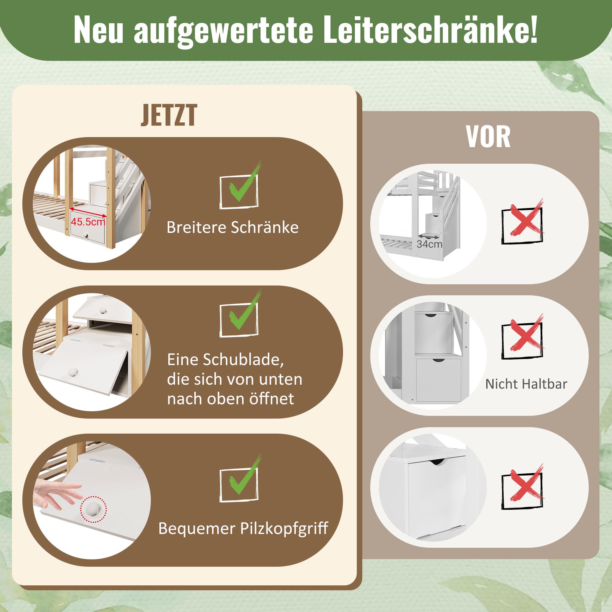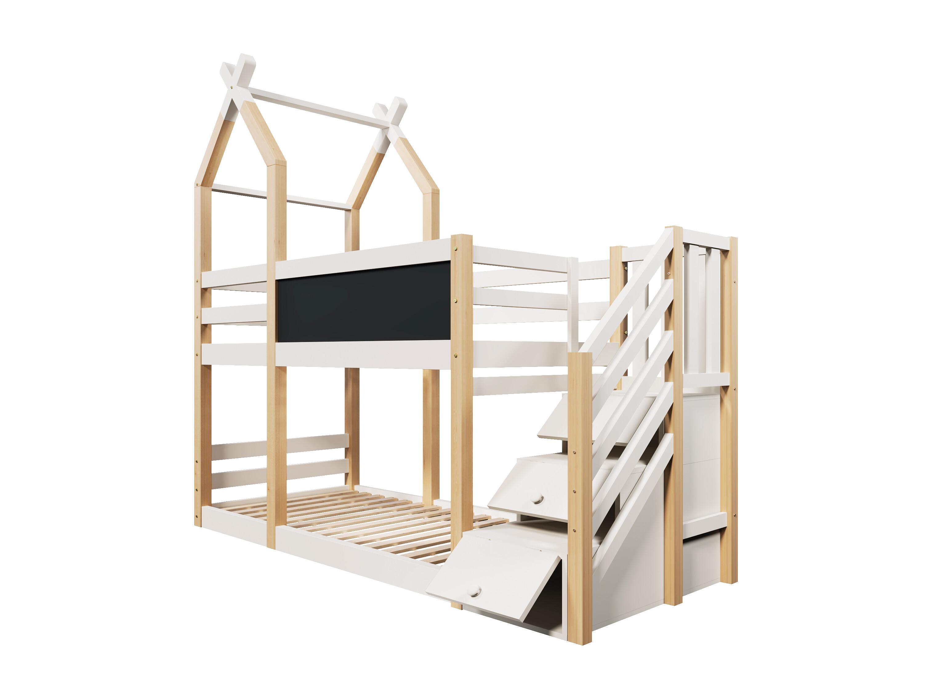 Stapelbed met opbergtrap, hoogslaper, met uitvalbeveiliging, ramen en dak, constructie van grenen en MDF, wit en naturel, (90x200cm en 90x190cm)