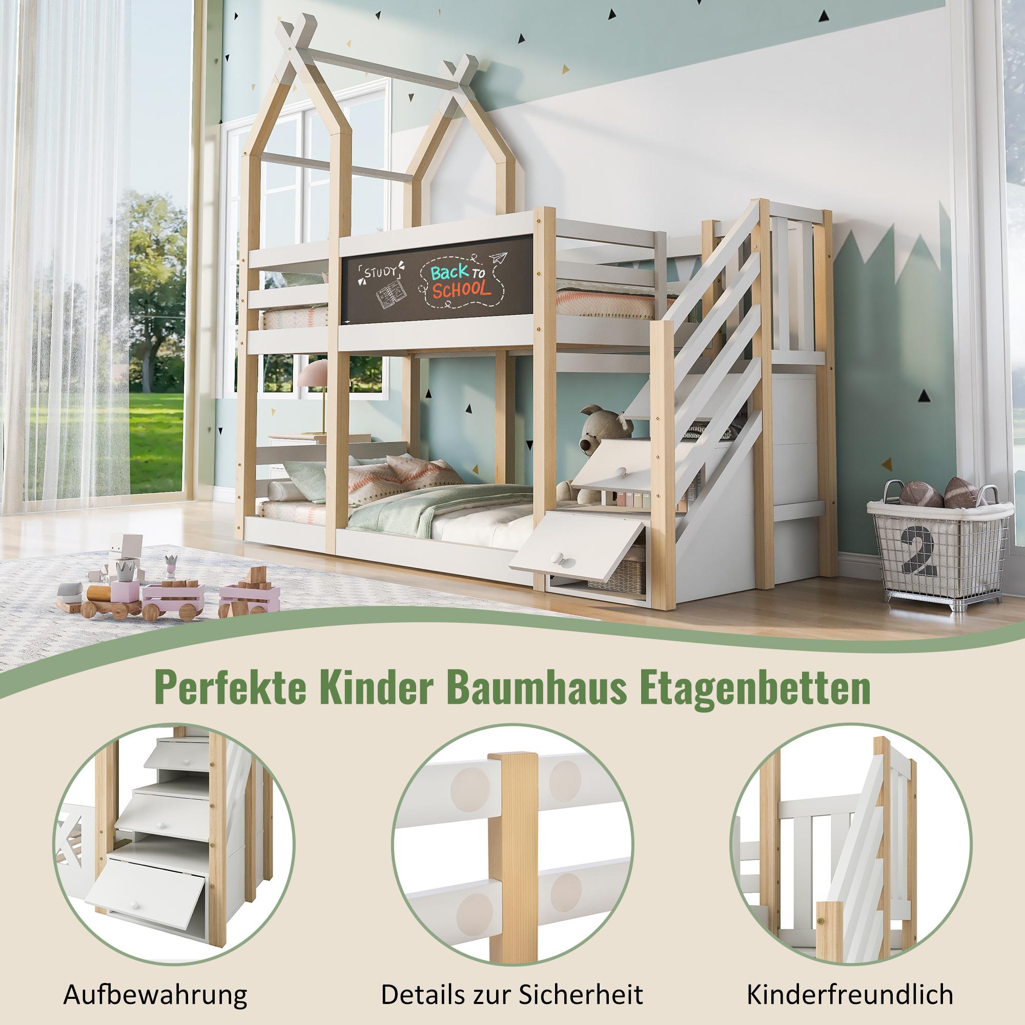 Stapelbed 90x200 cm, boomhutdesign met tafel, opbergruimte en valbeveiliging, massief hout en MDF, wit en naturel (257x96x209 cm)