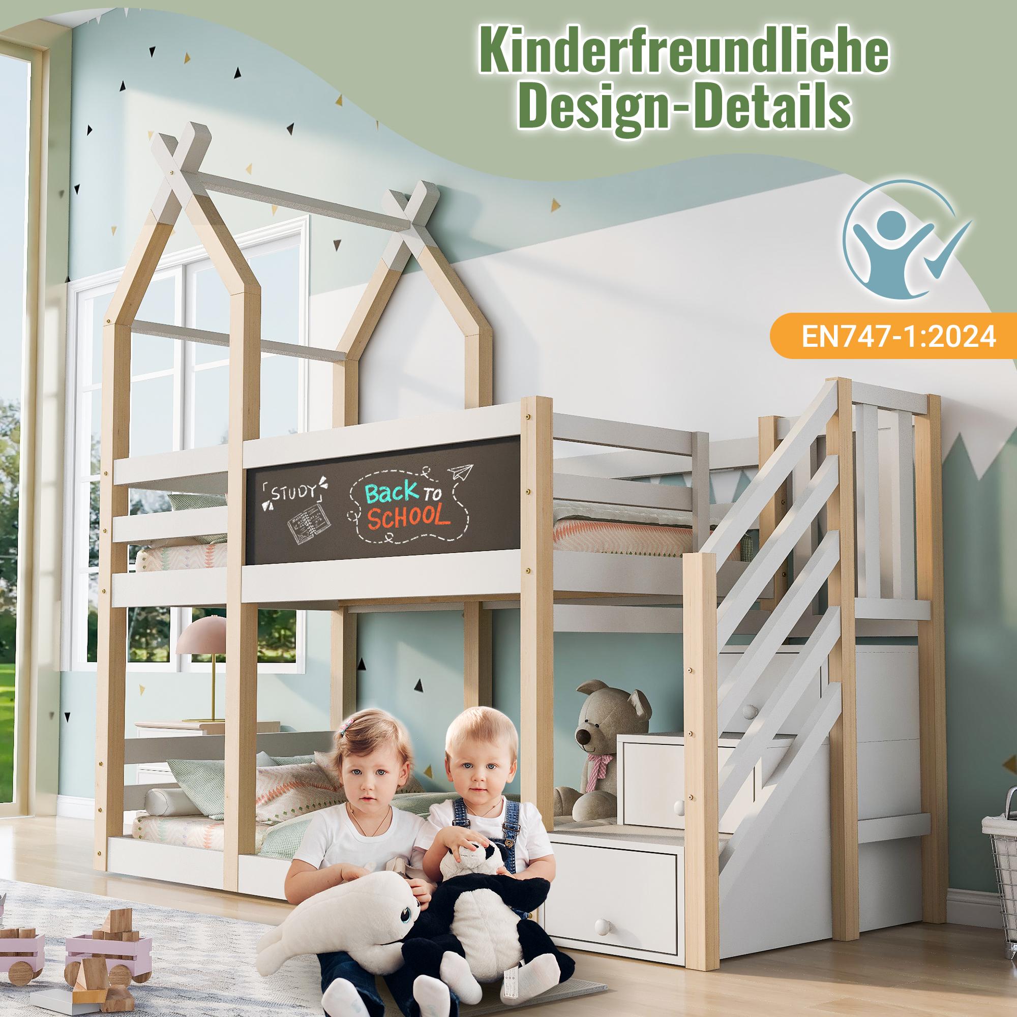 Kinderstapelbed 90x200 cm, huisvormig bed met opbergruimte en valbeveiliging, naturel en wit, met tafel (256x96x192 cm)