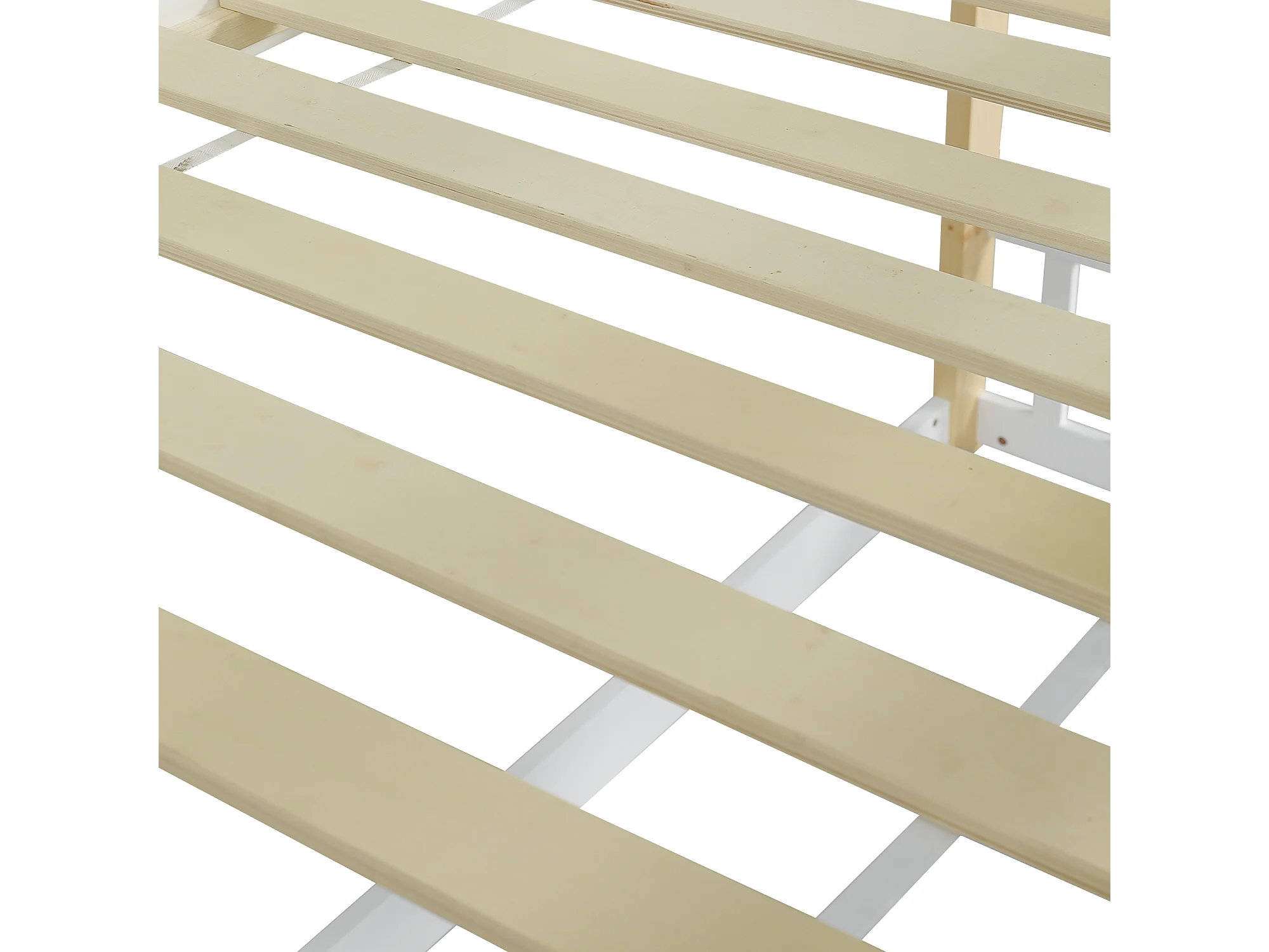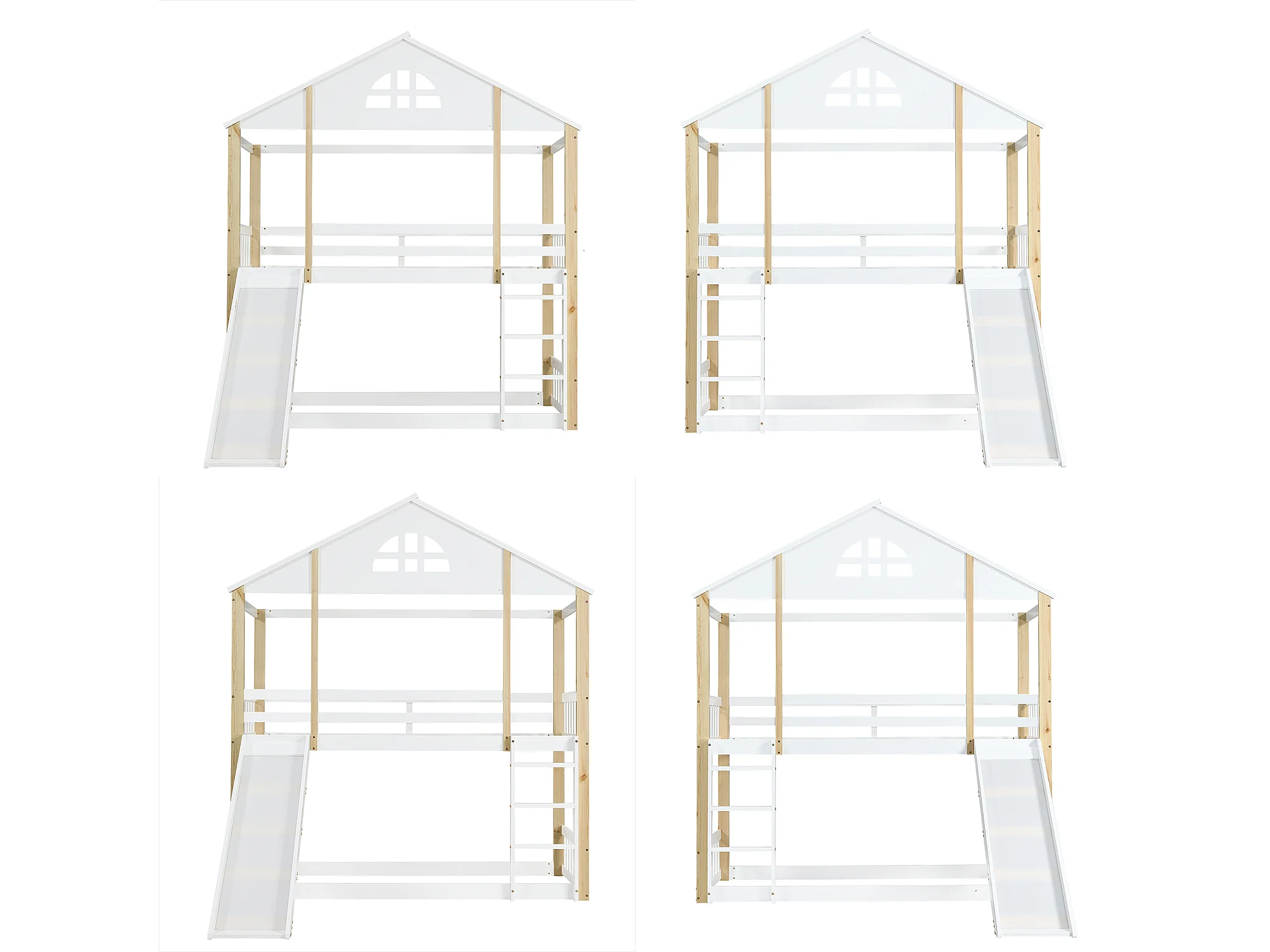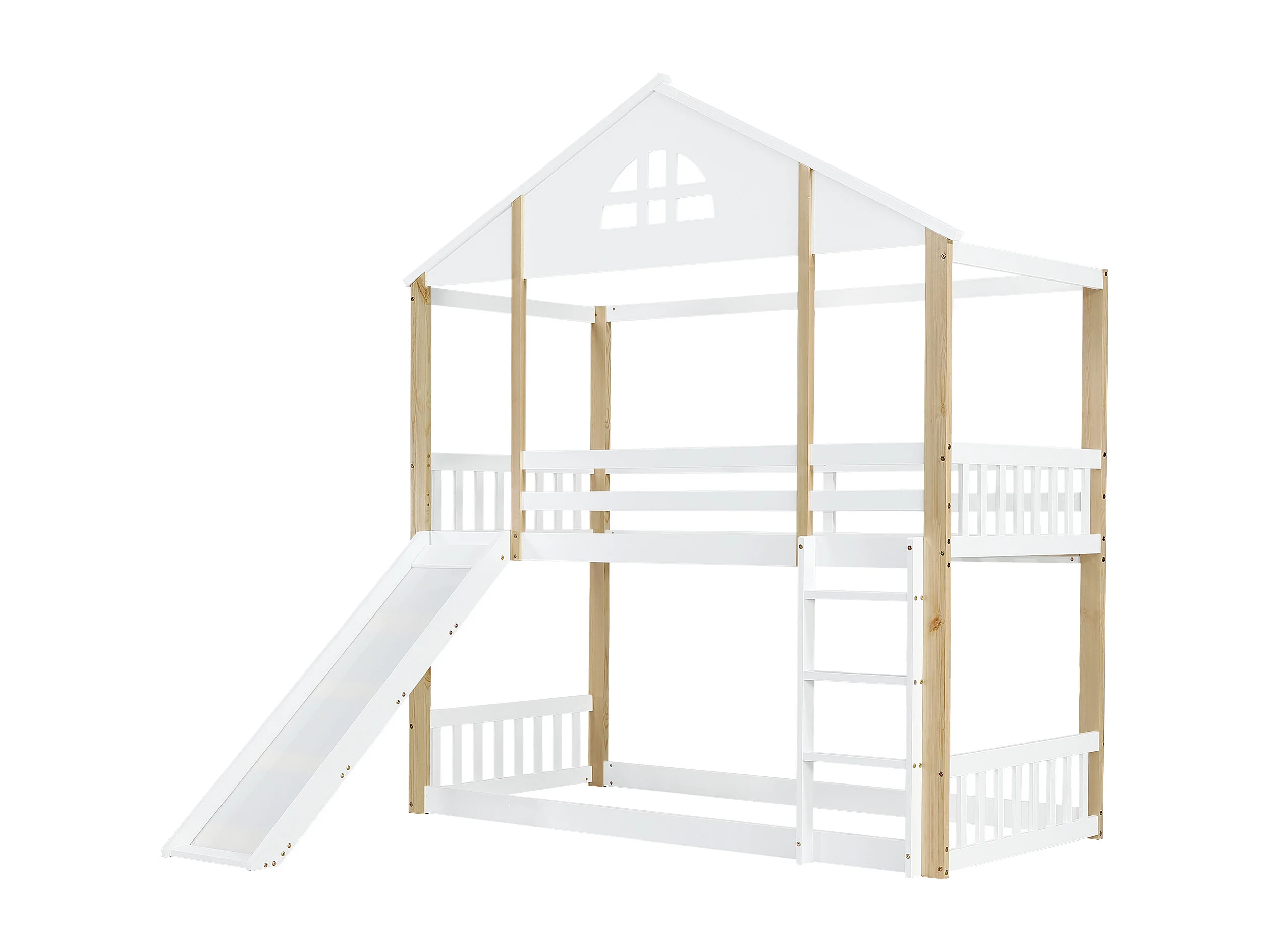 Stapelbed 90x200 cm – Met Trap En Glijbaan – Met Raamdetails En Valbeveiliging – Met Lattenbodem – Zonder matras – Massief Hout – Wit Naturel