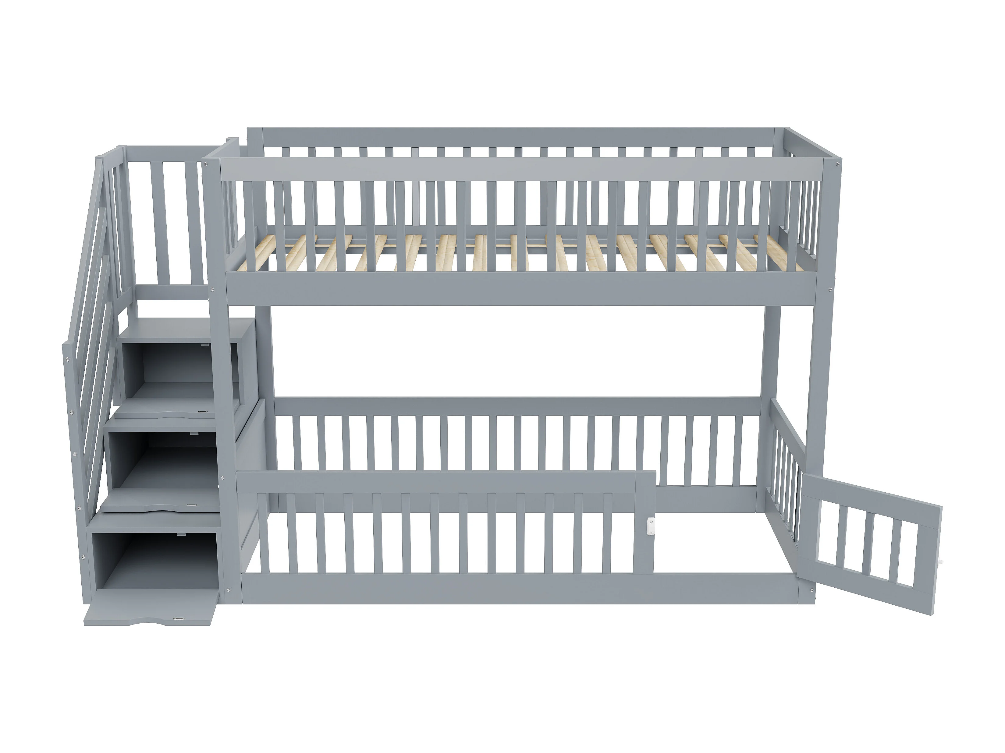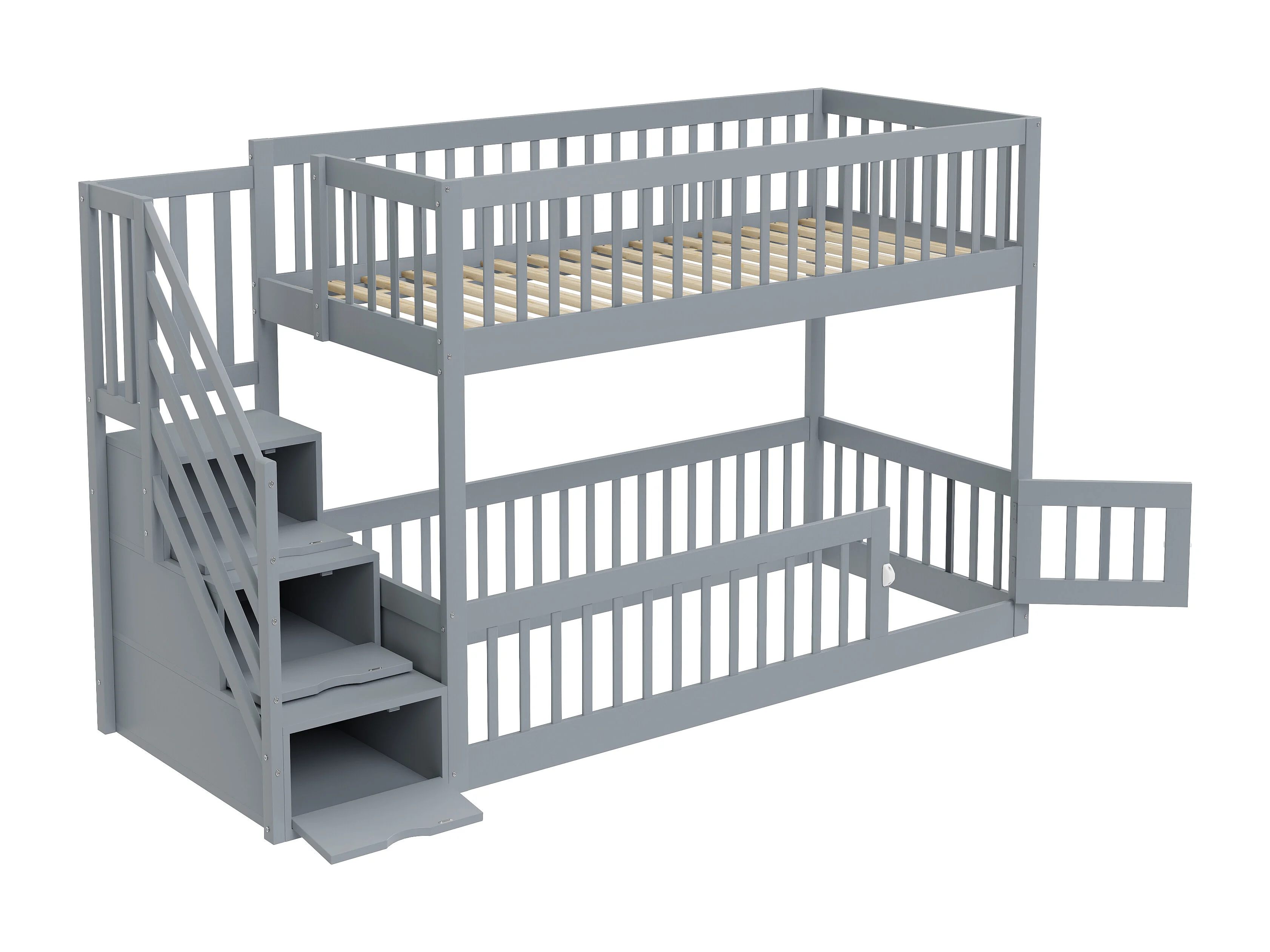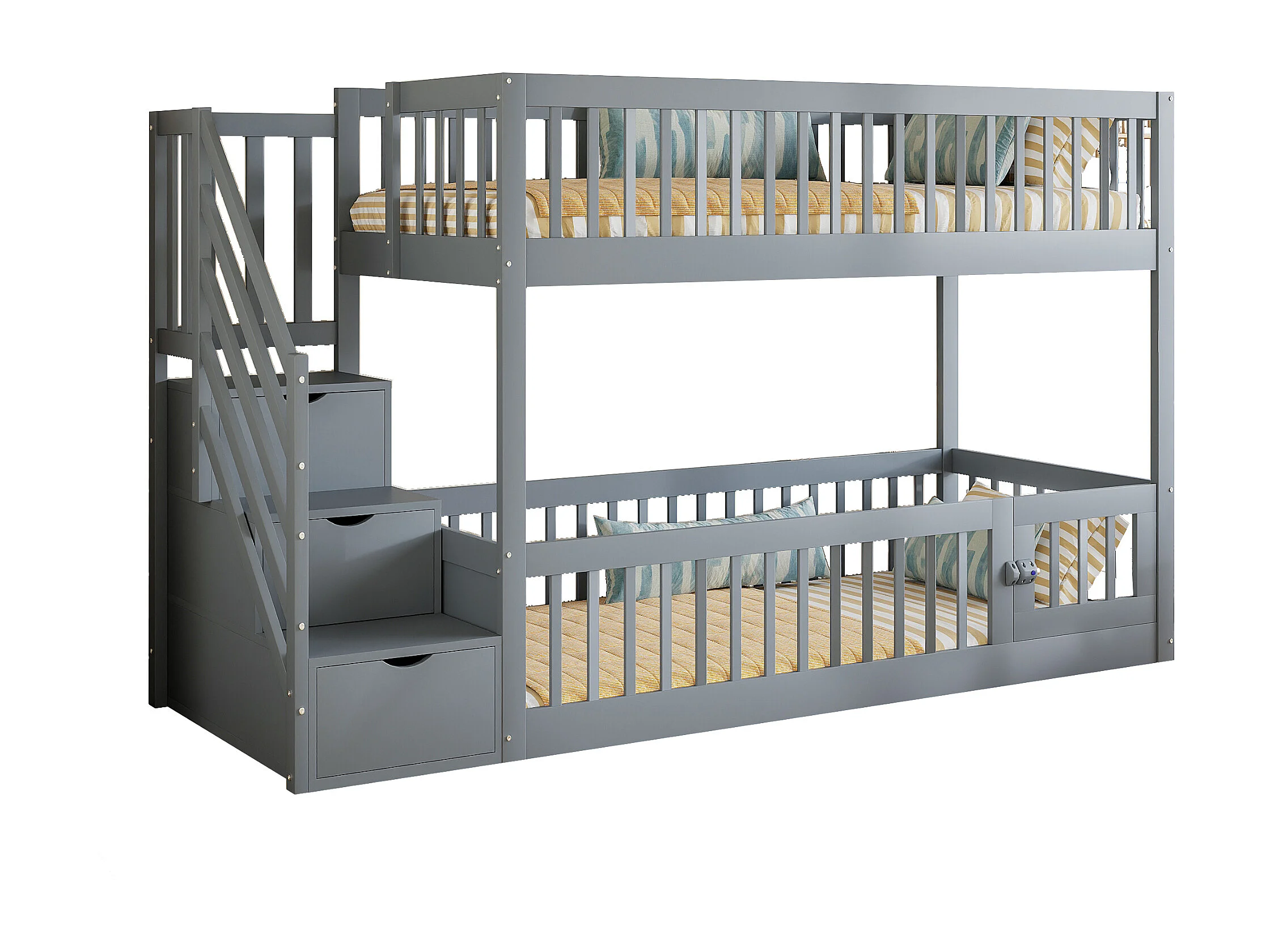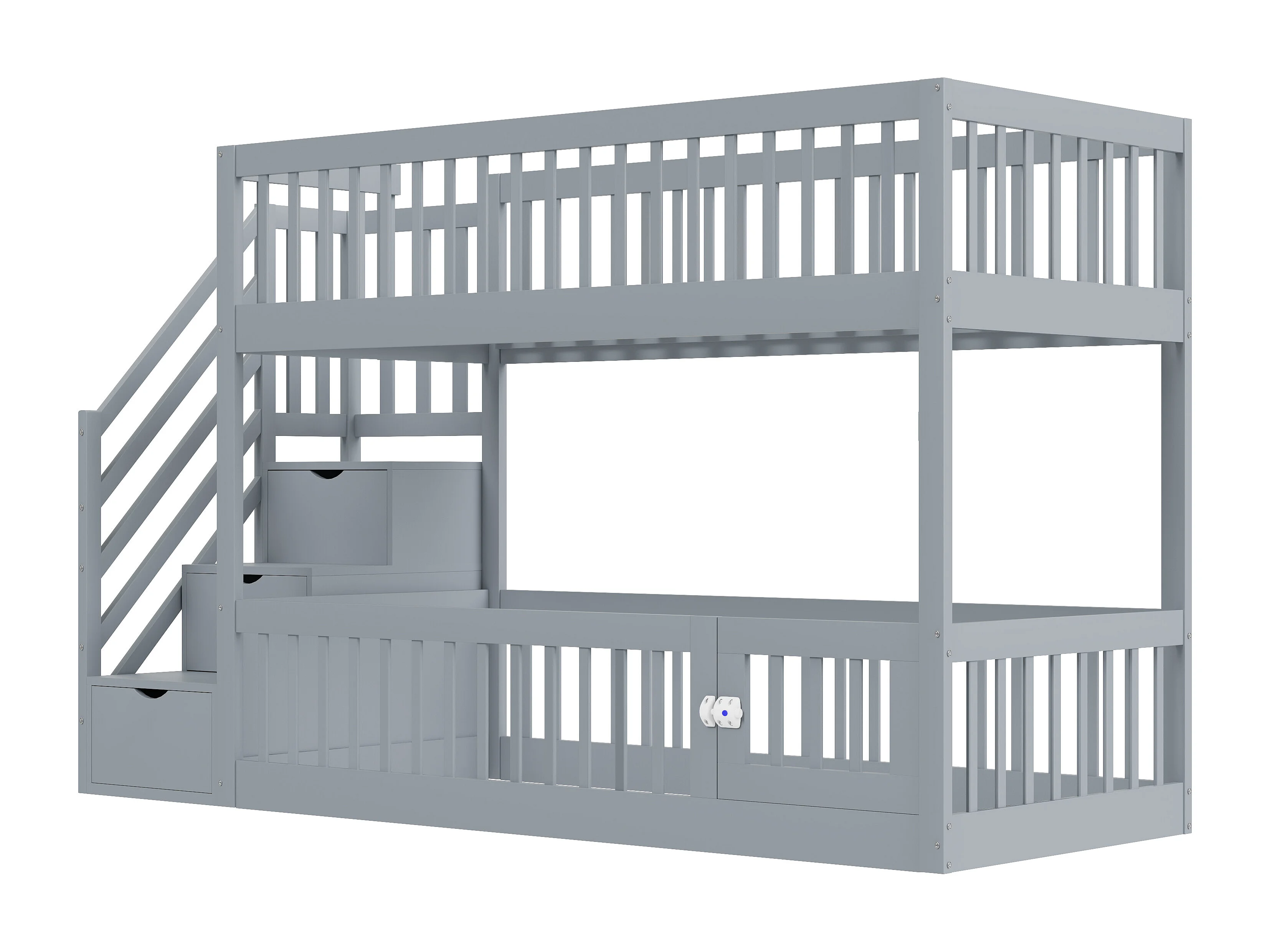Stapelbed 90x200 cm met veilige trap en opberglades, massief hout, grijs (253x91x130cm)