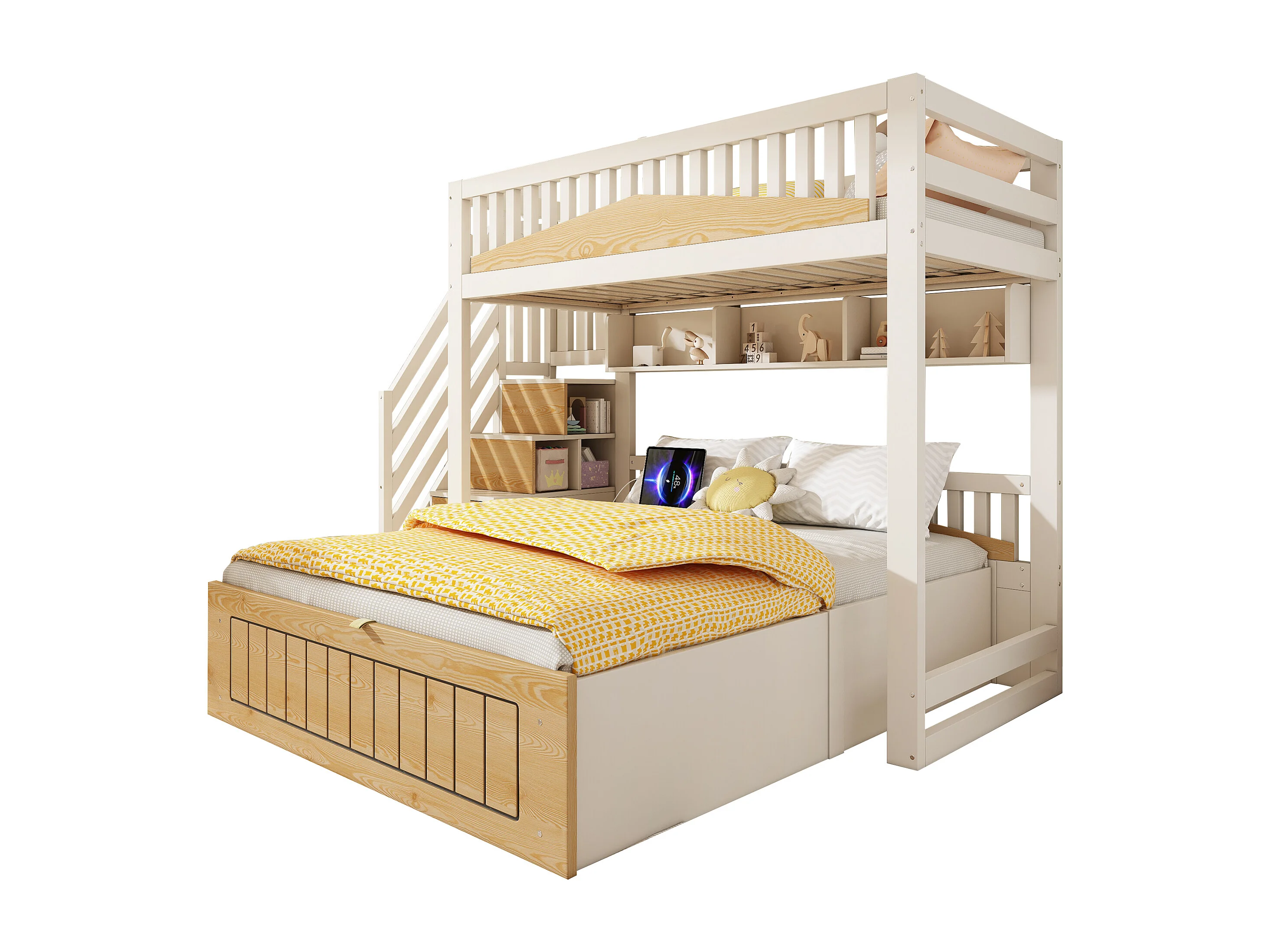 Stapelbed 90x200 en 140x200 cm met opbergruimte en USB/Type-C-poorten - Wit en hout