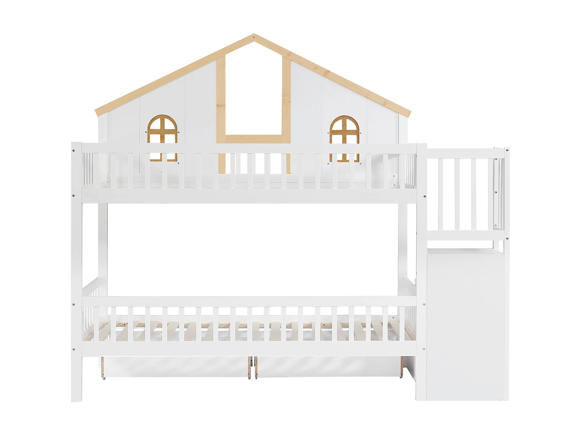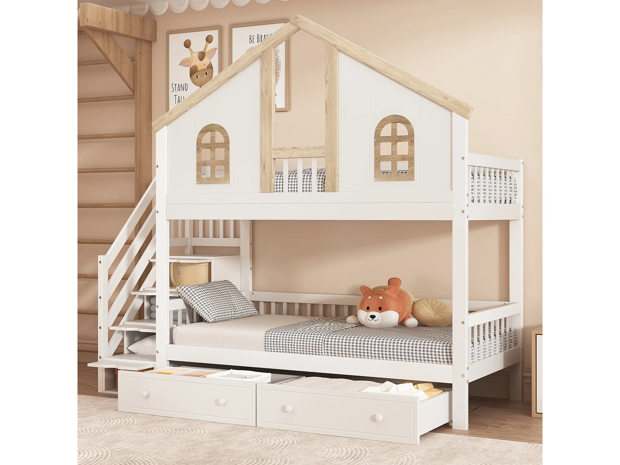 Stapelbed - 90x200 - Kinderbed met Viertraps Ladder - Met Twee Schubladen en Opbergruimte - Grenen - Wit