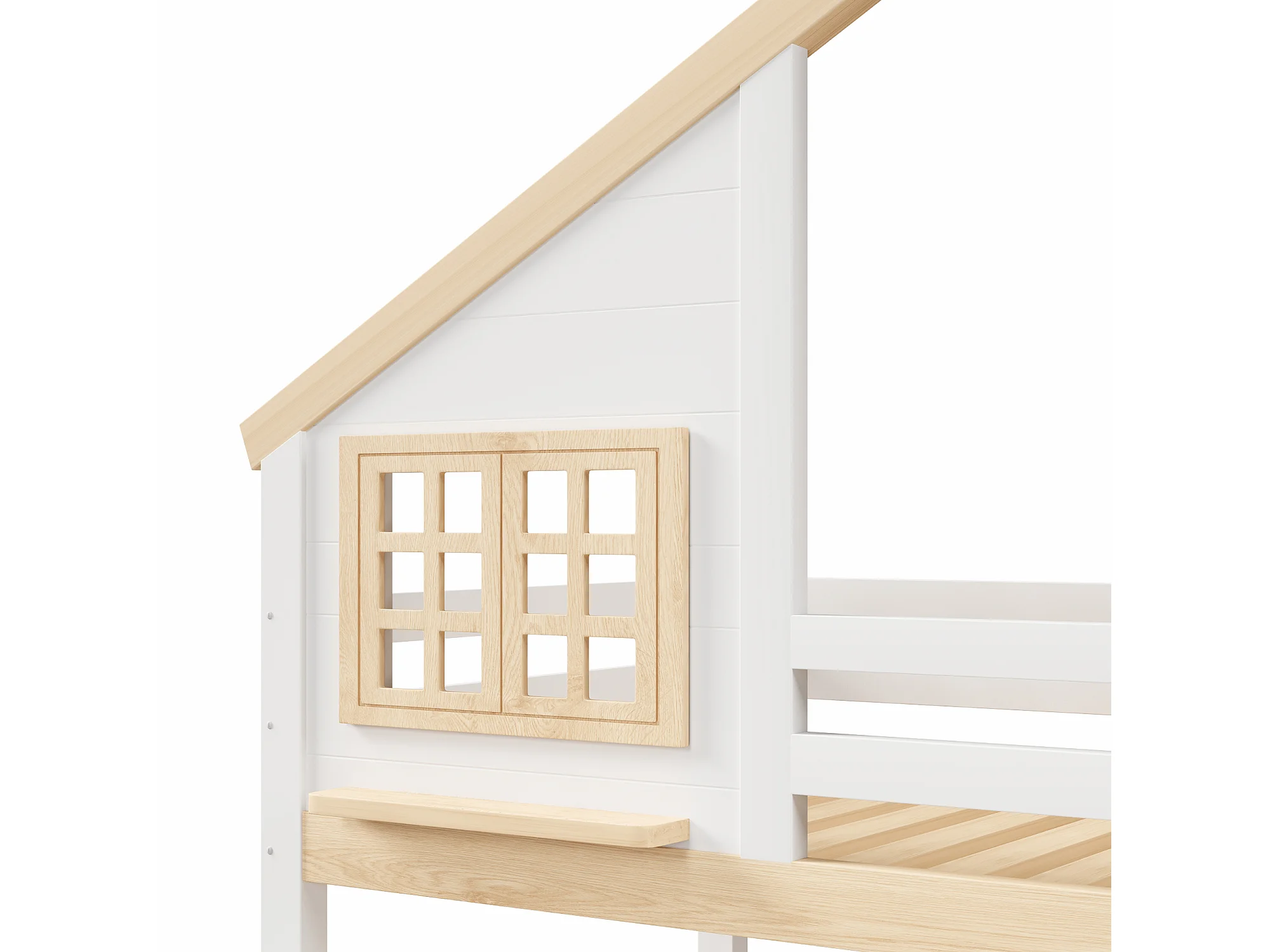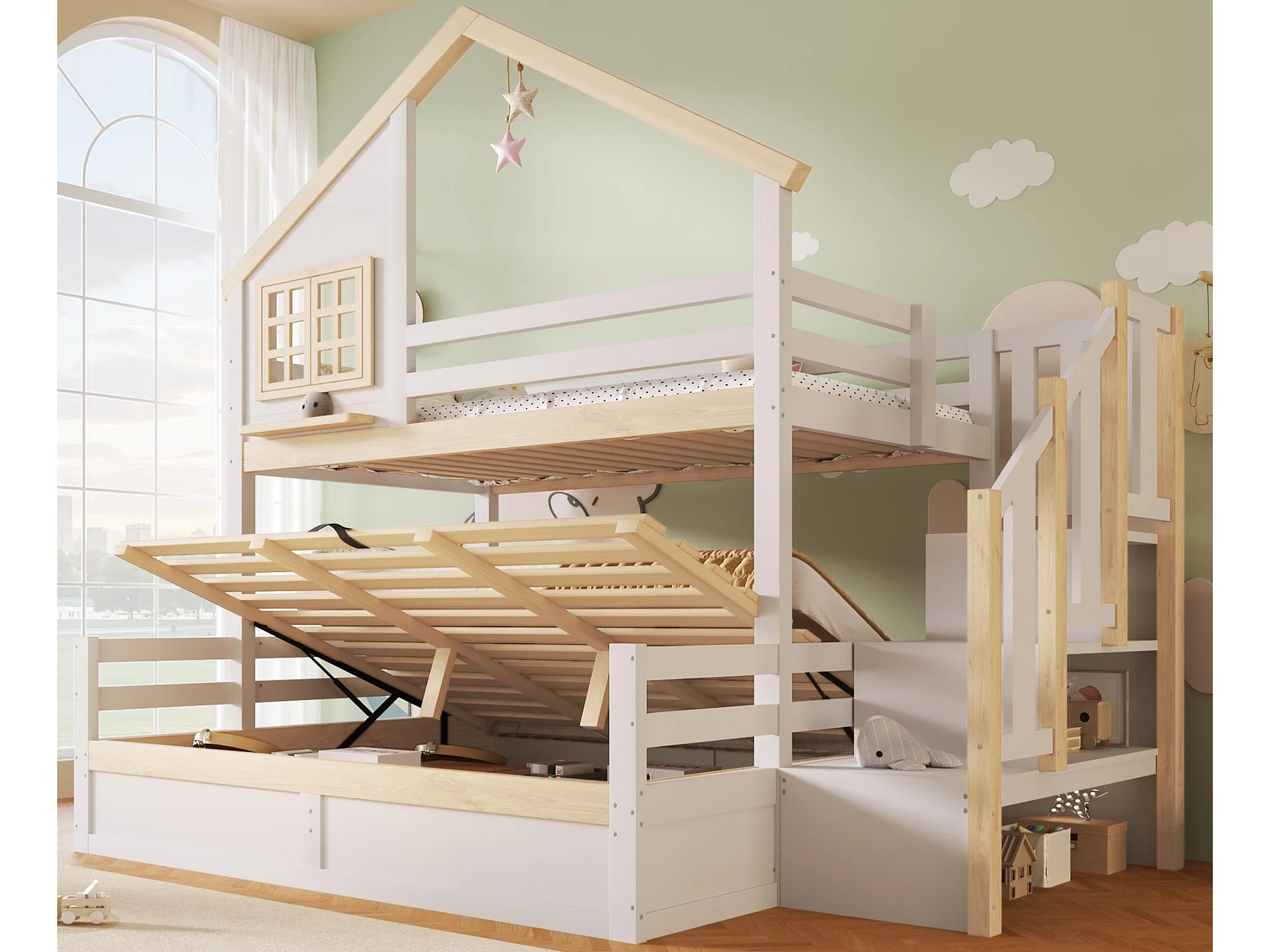 Stapelbed 90x200cm + 140x200cm - met veiligheidshekken - met opbergtrap - wit + natuurlijke kleur​ (matras niet inbegrepen)