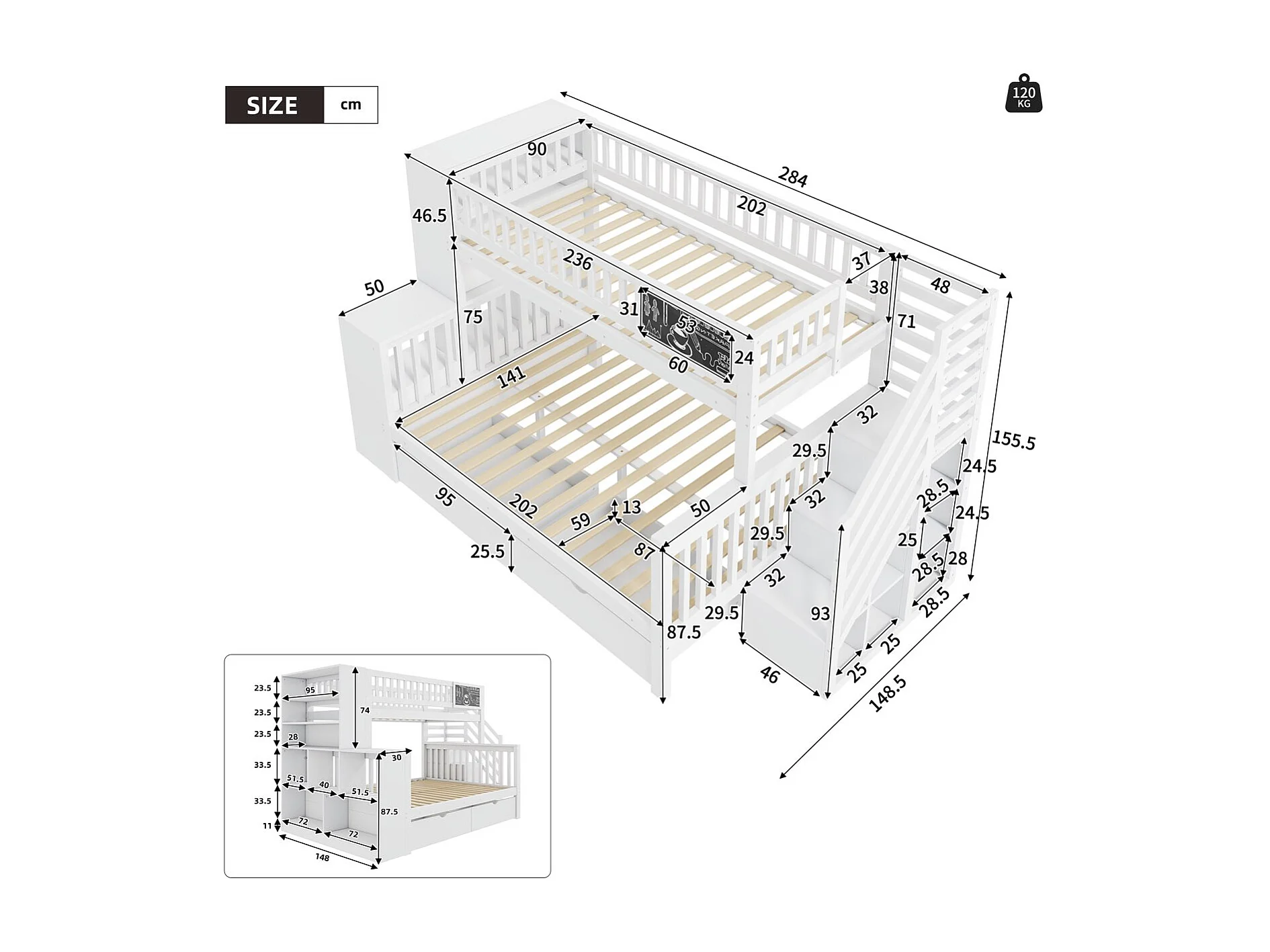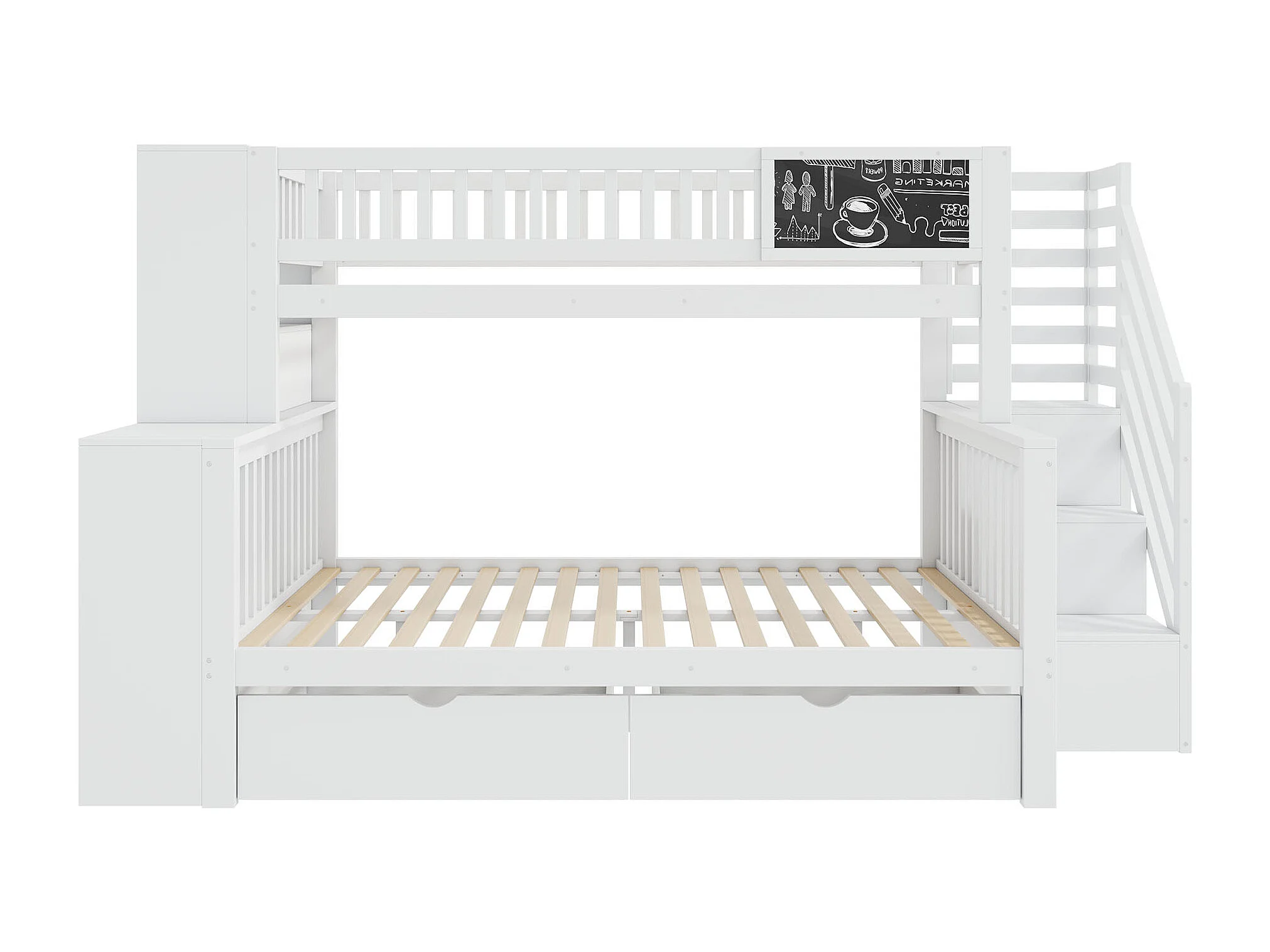 Stapelbed 90x200cm en 140x200cm - Kinderbed met krijtbord, 2 lades en planken - Wit