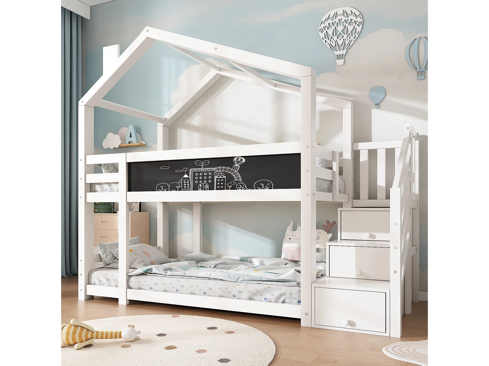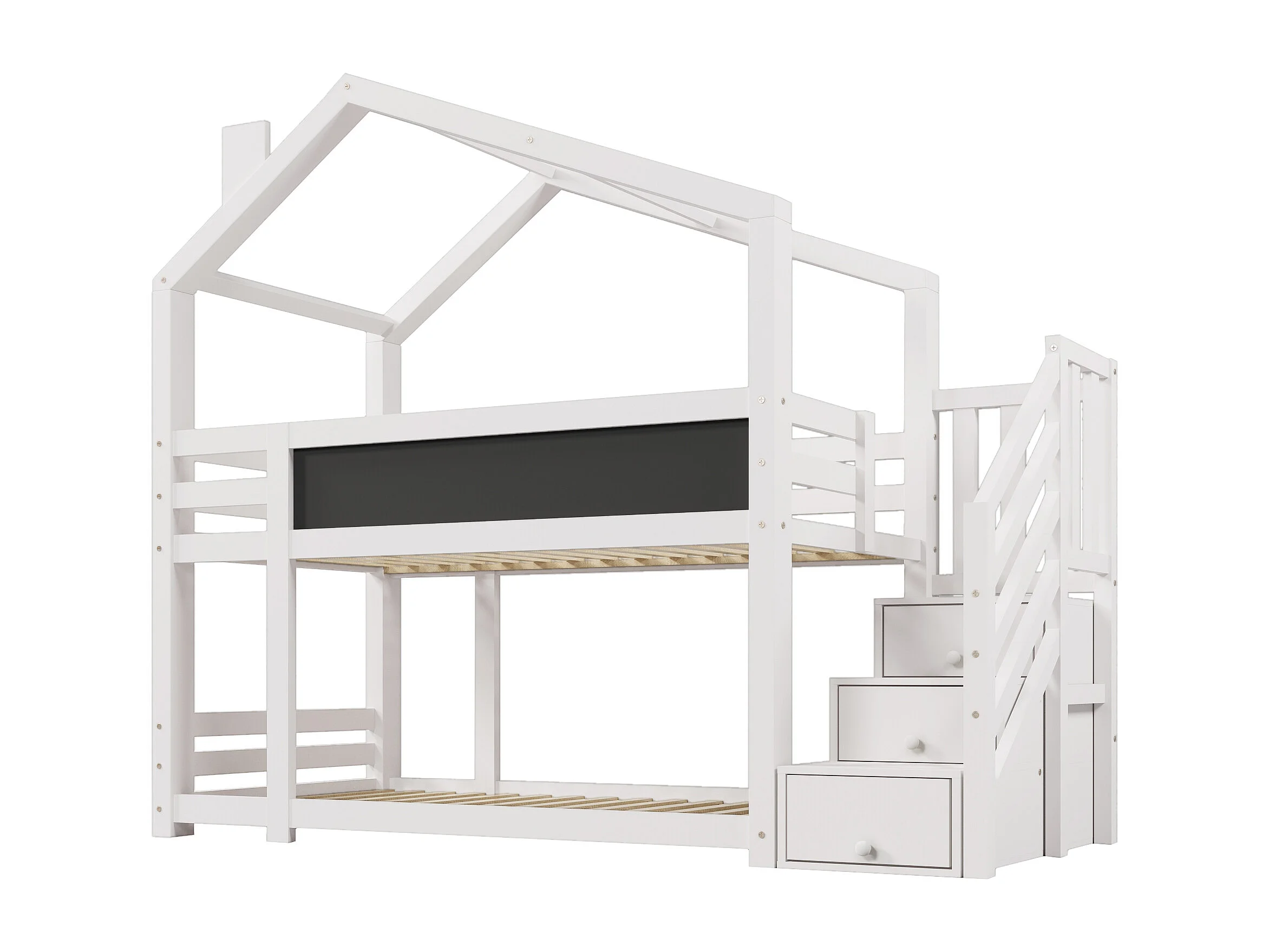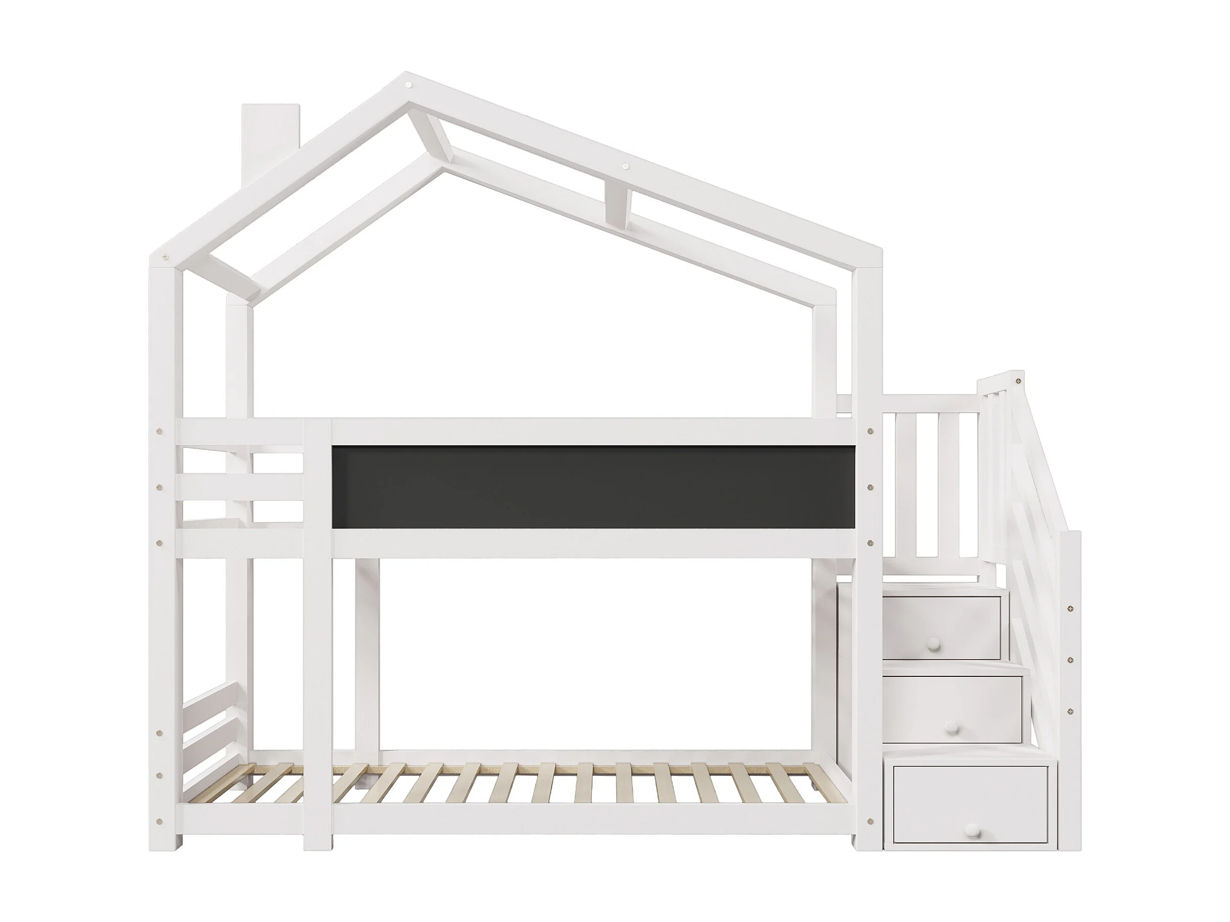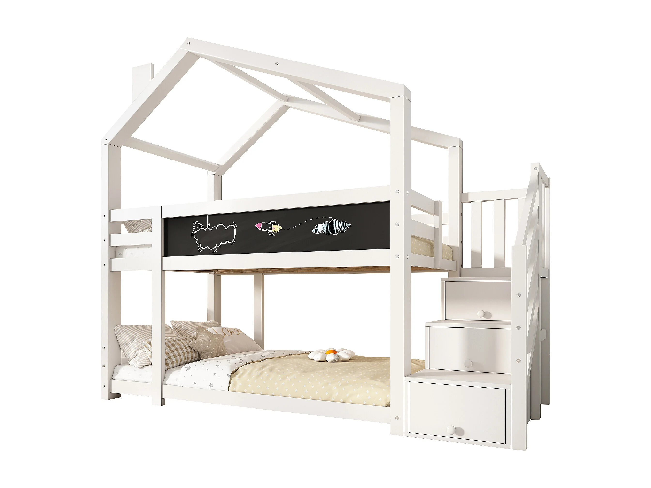 Stapelbed 90x200cm Huisjesontwerp met opbergruimte en schoolbord Hout en MDF Wit (Zonder matras)