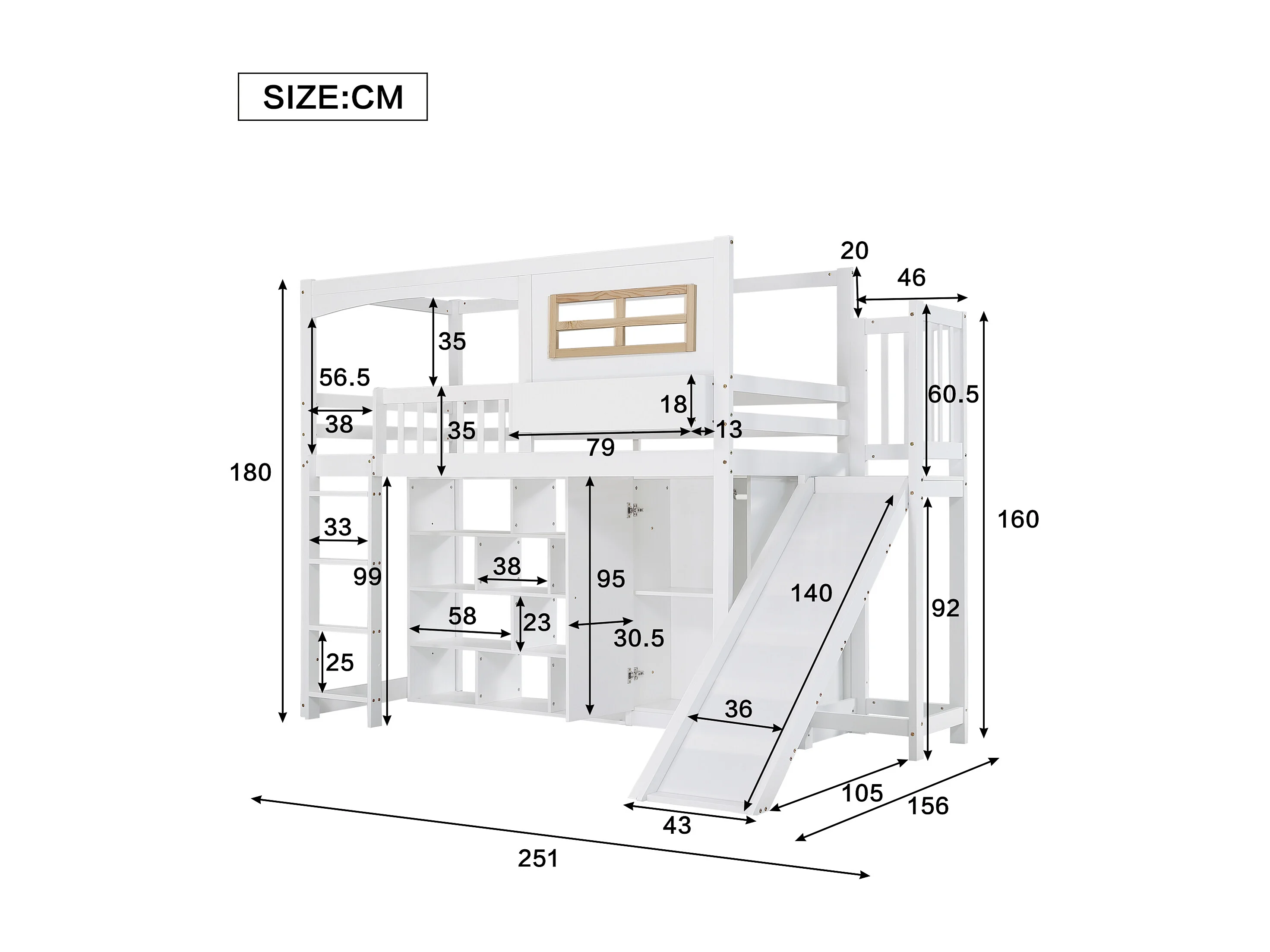 Stapelbed 90x200cm, kinderbed, met veiligheidshekje, glijbaan, kledingkast en ladder, grenenhout, wit, zonder matras