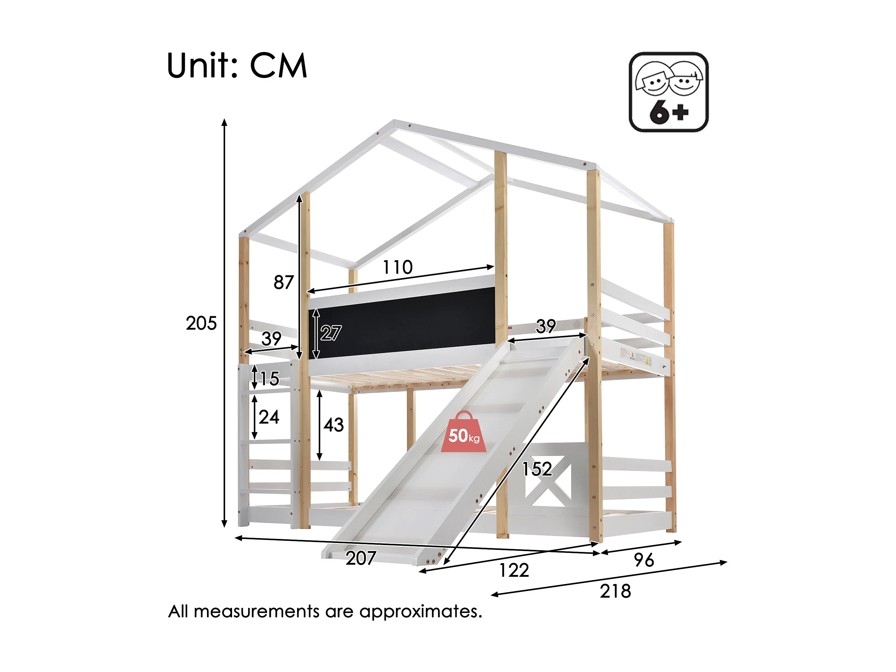 Stapelbed 90x200cm met glijbaan en krijtbord - Wit houten kajuitbed
