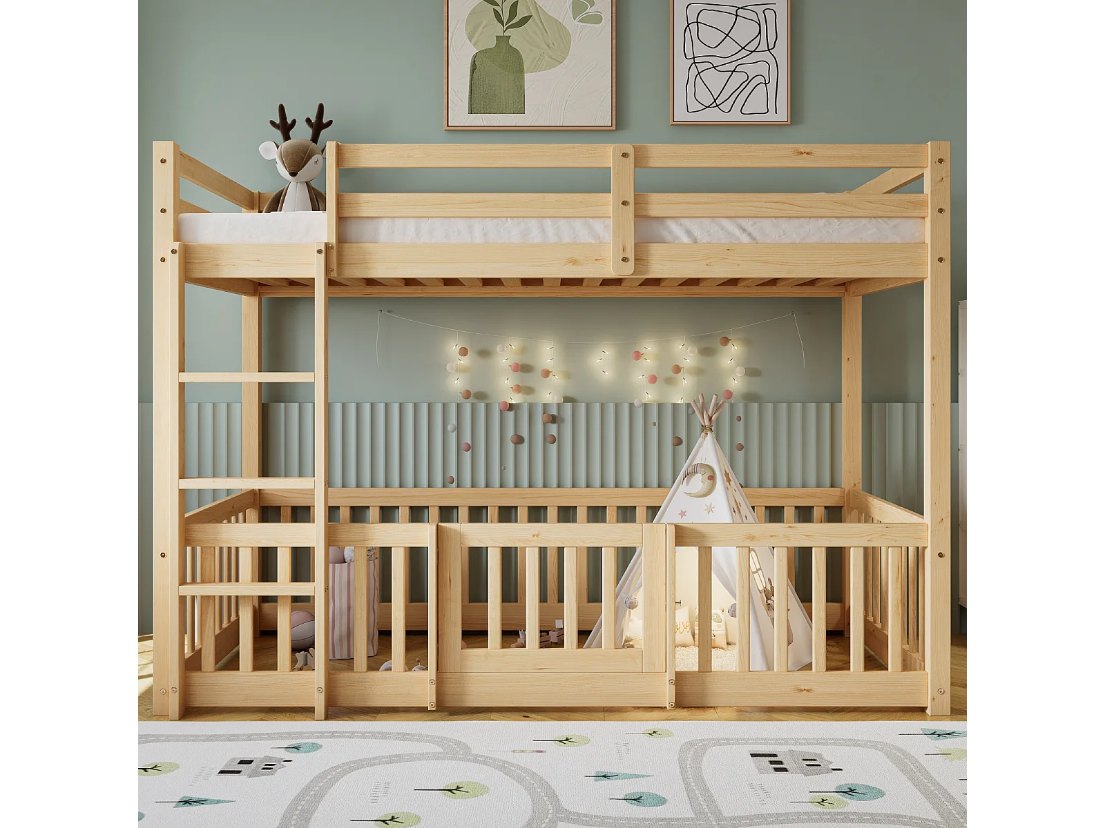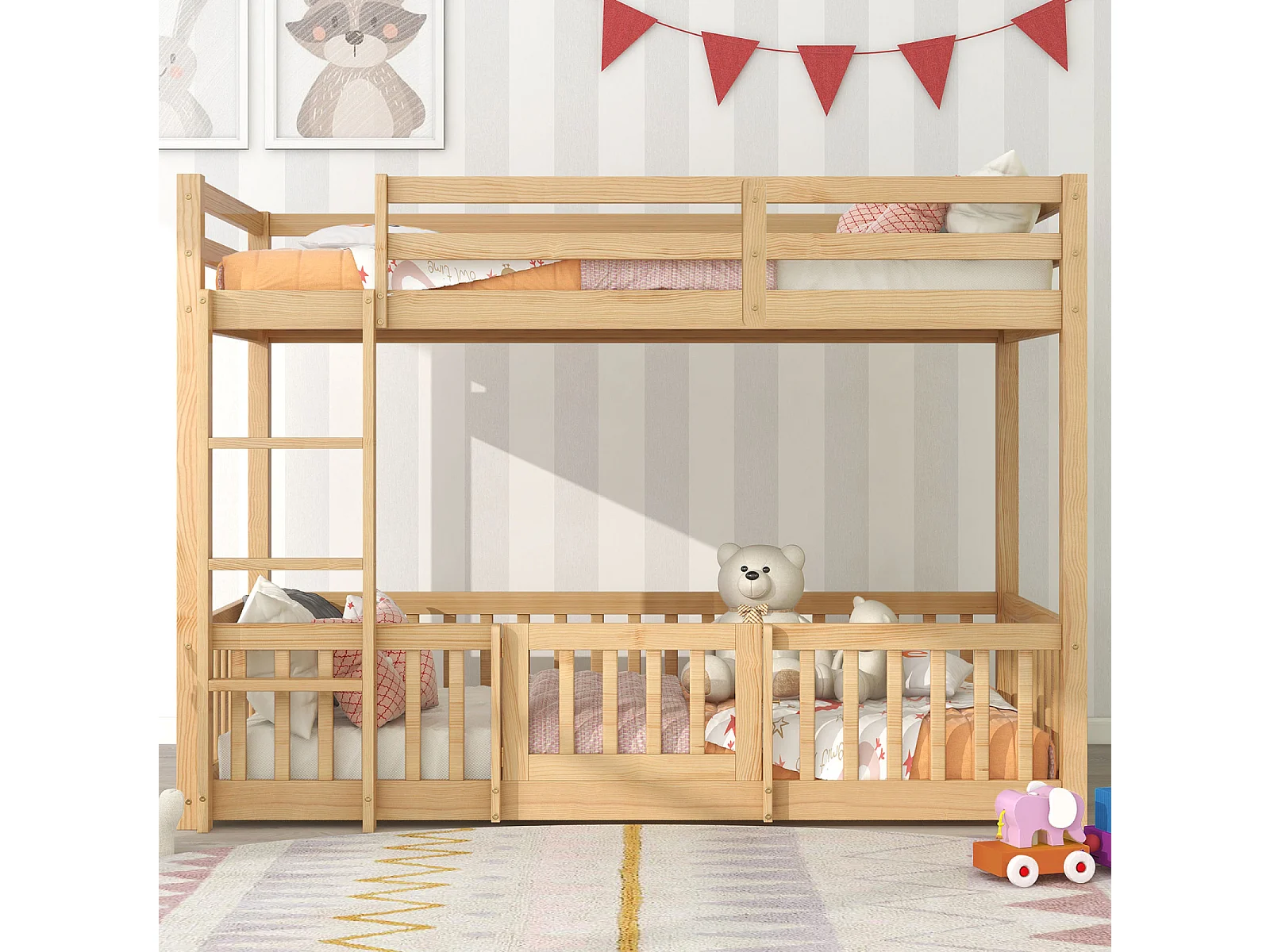 Stapelbed met haakse ladder, bed met hekken en poorten, kinderbed met valbeveiliging en spijlen, massief hout, naturel (200x90cm)