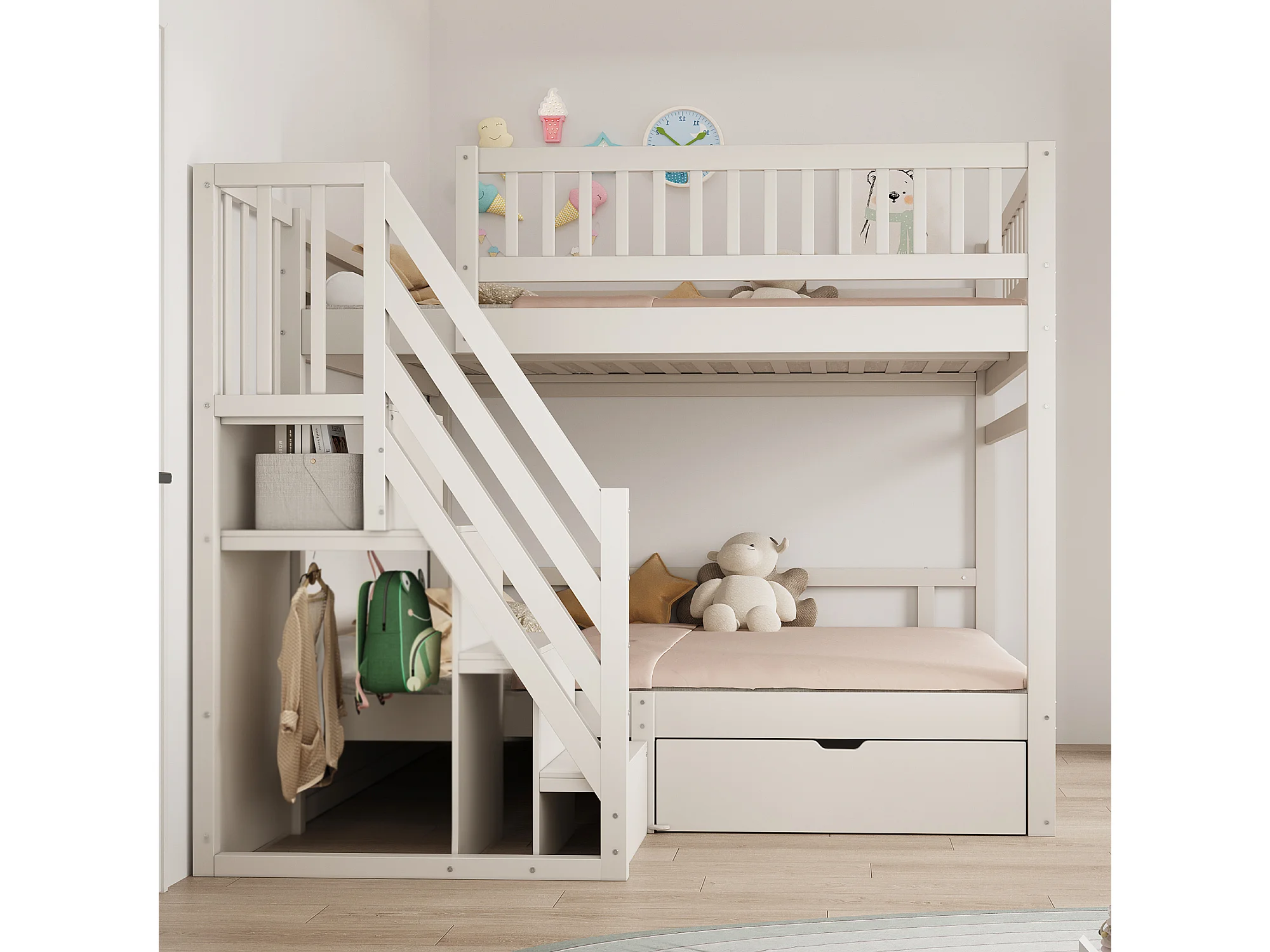 Stapelbed van massief hout 140x200 cm, met hoge leuning, veiligheidsladder met opbergruimte, opberglades, grijs (205x145x173,5 cm)