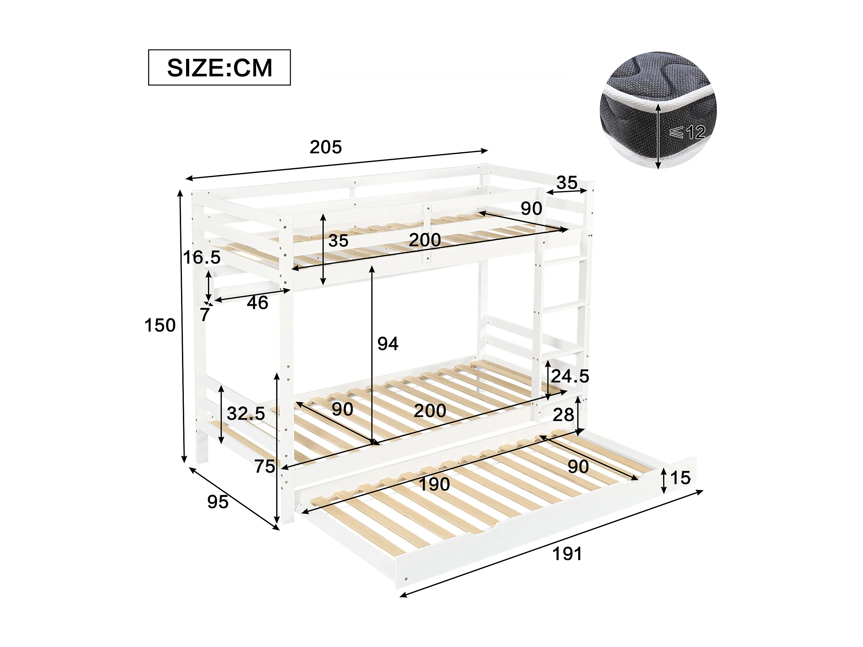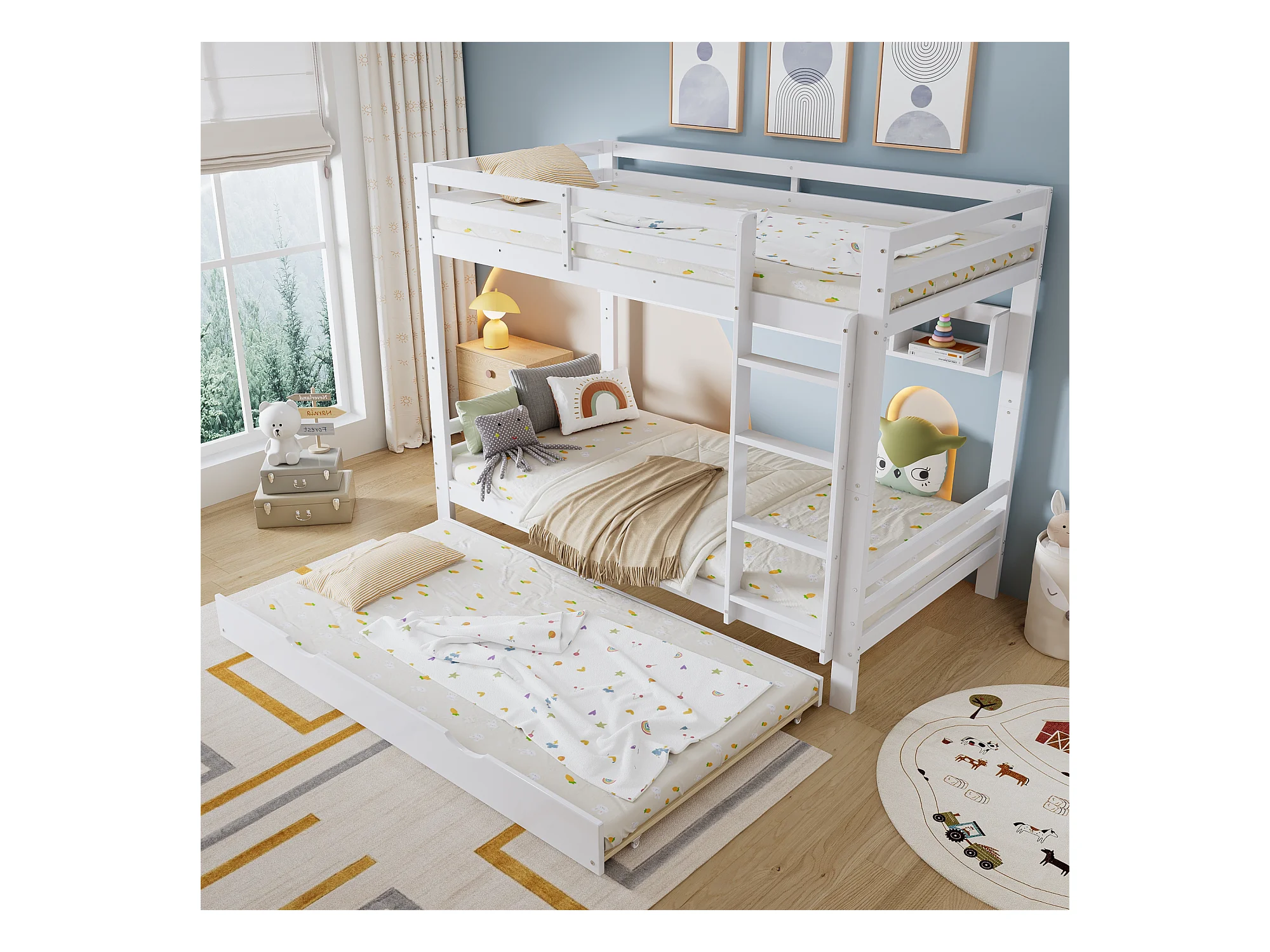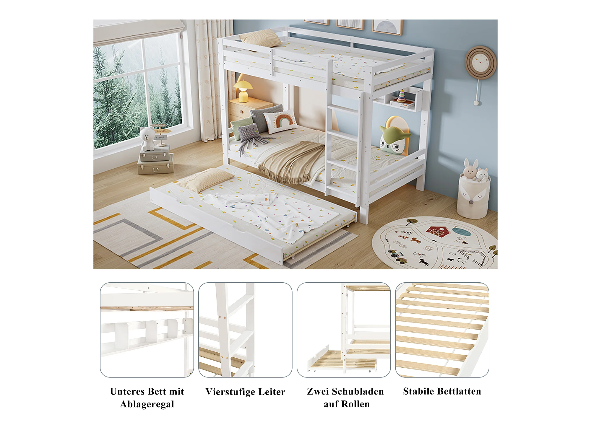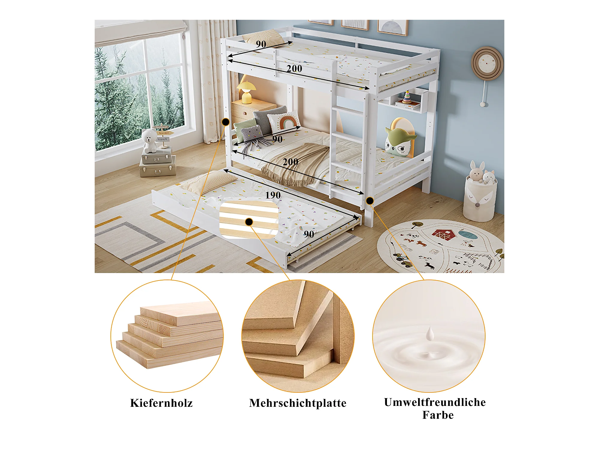 Stapelbed voor kinderen - 2 x 90 x 200 cm - met uitschuifbed 90 x 190 cm + planken - grenen + MDF + multiplex - wit