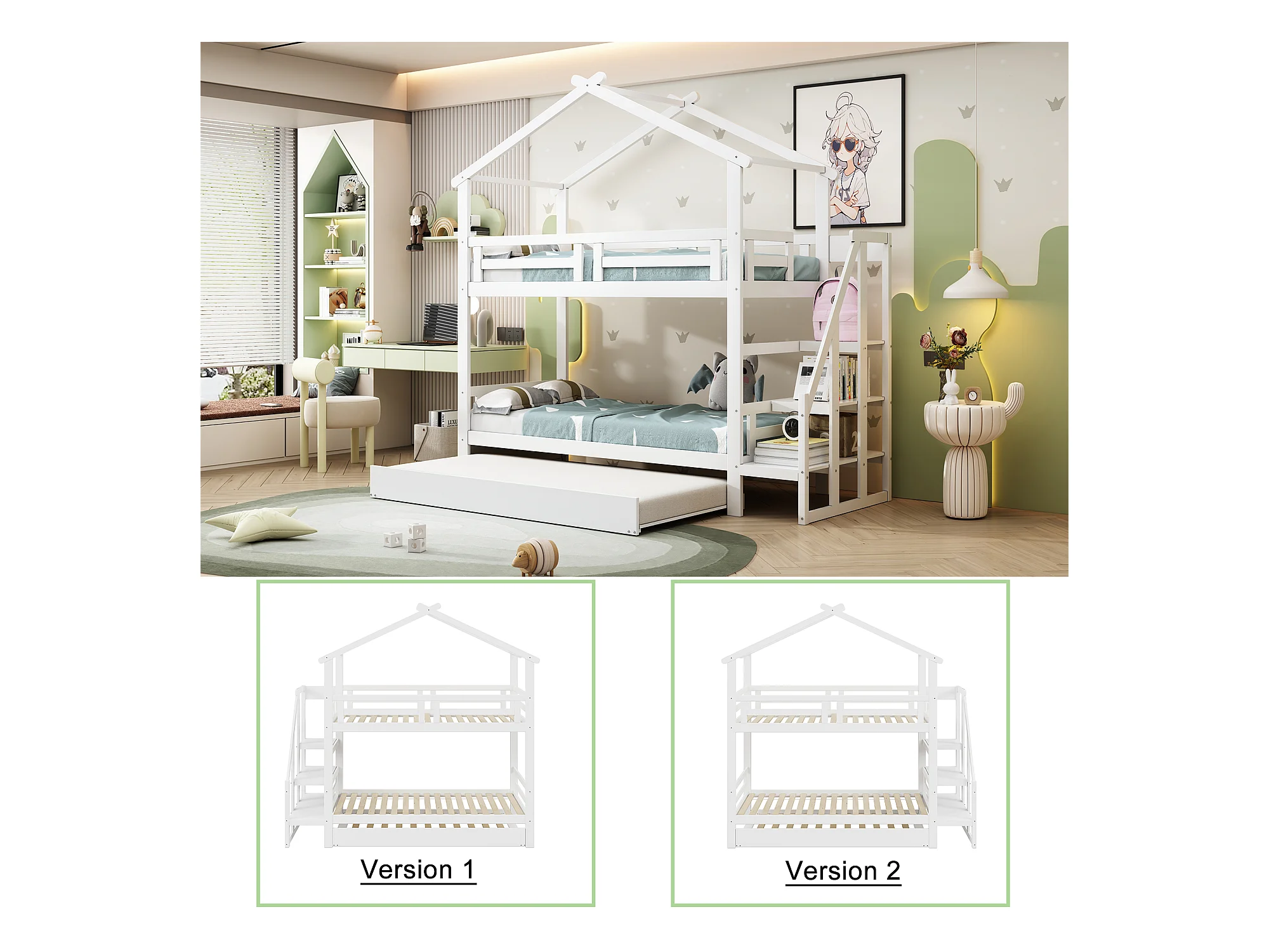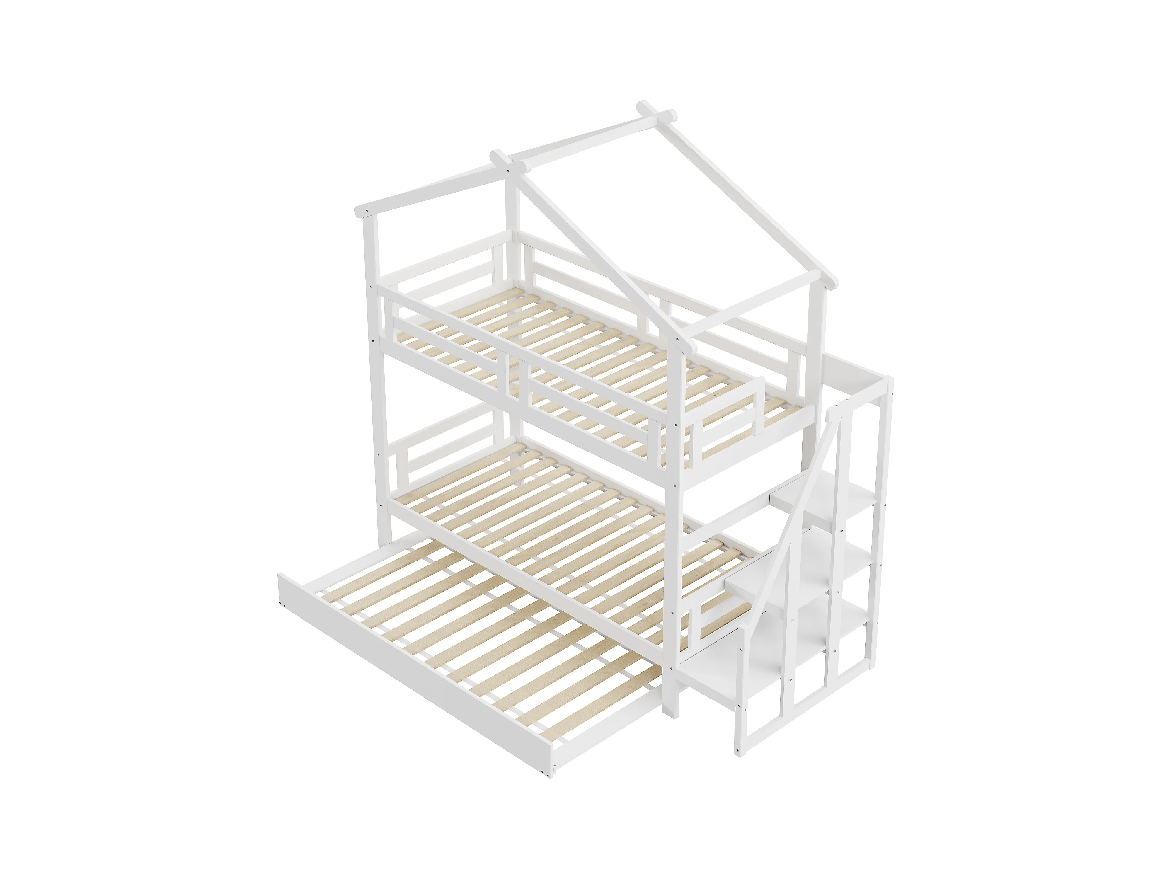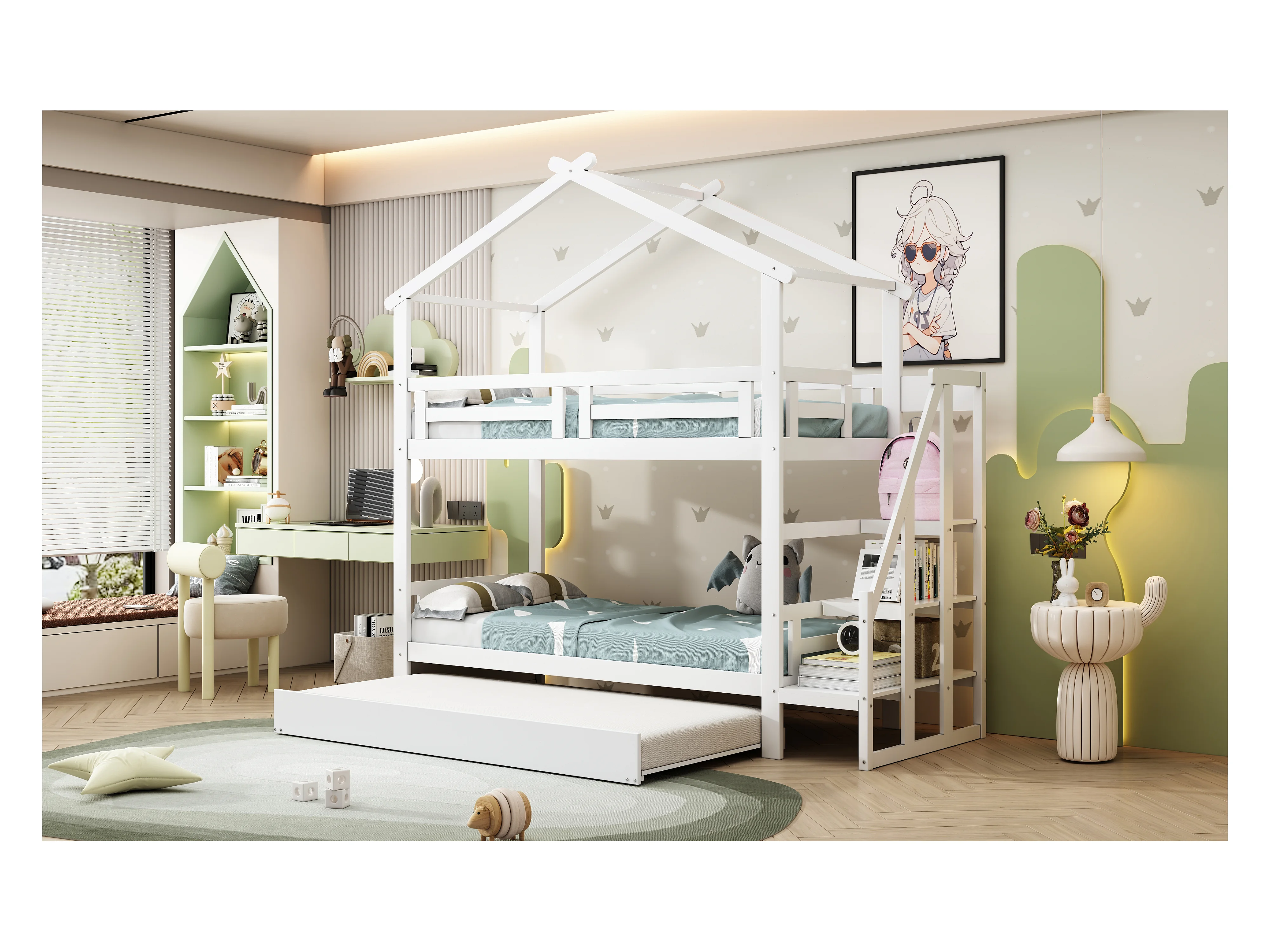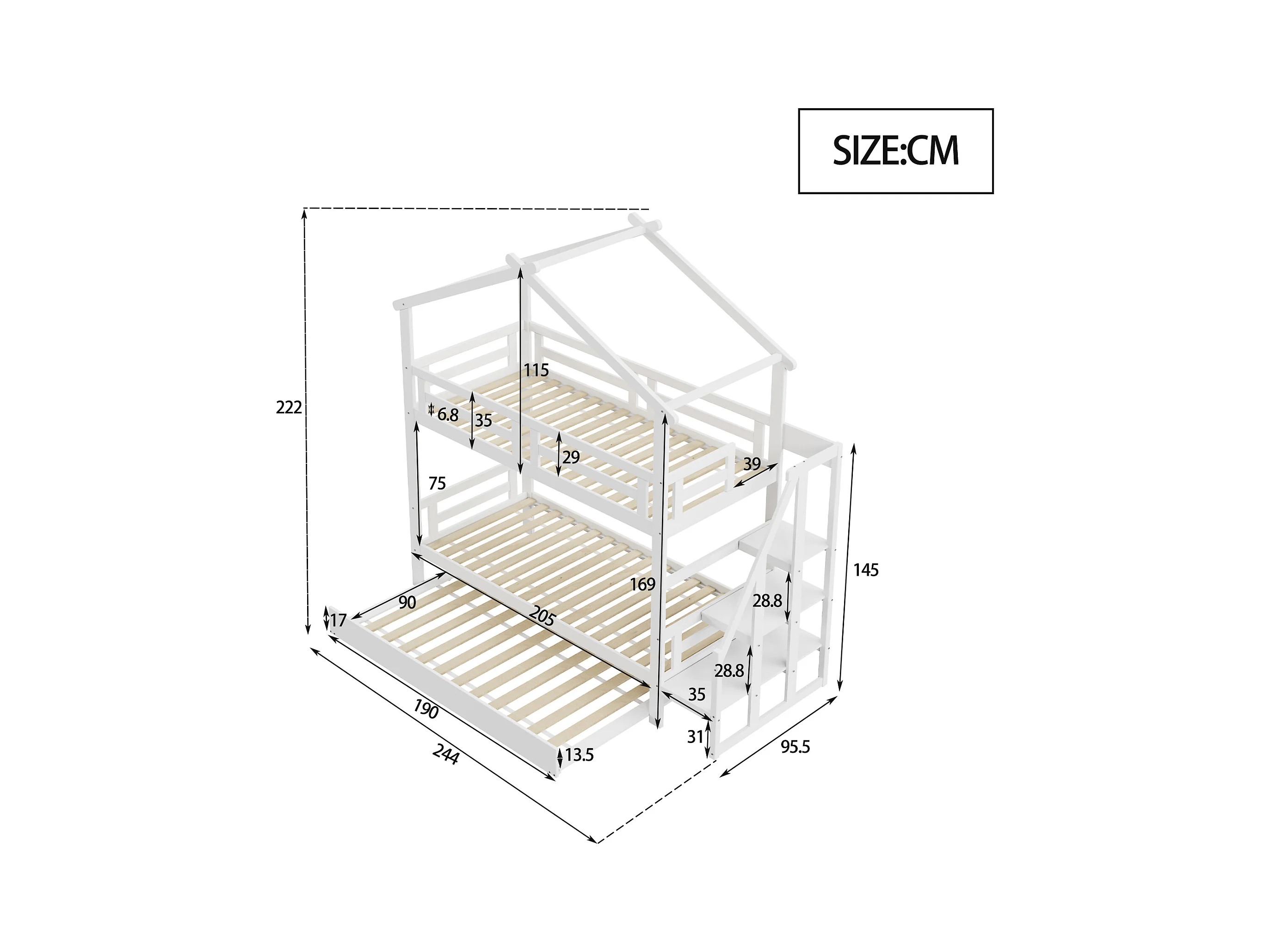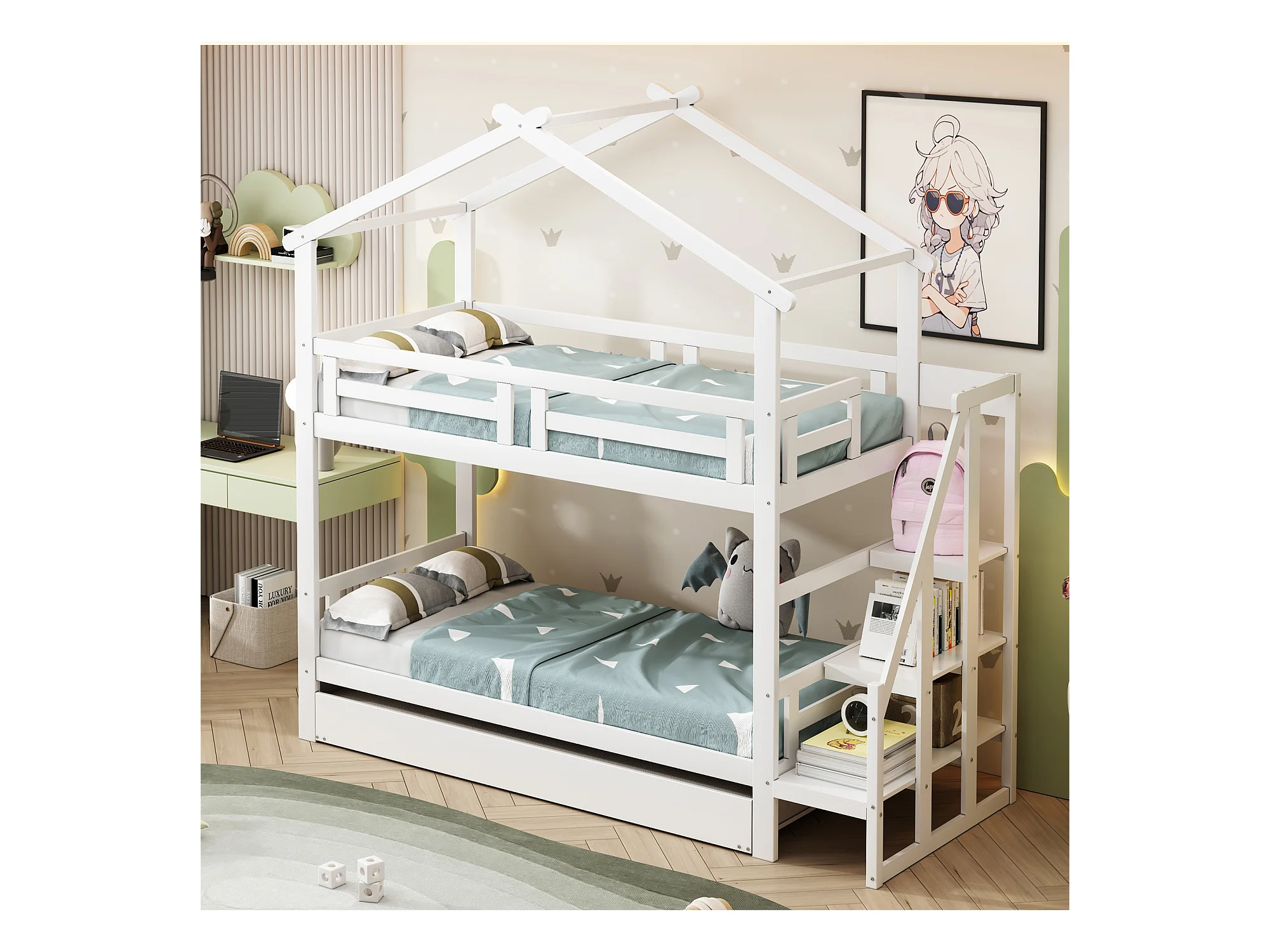Stapelbedden 2 x 90 x 200 cm met onderschuifbed 90 x 190 cm - Opbergplanken - Grenenhout + multiplex + MDF - Wit