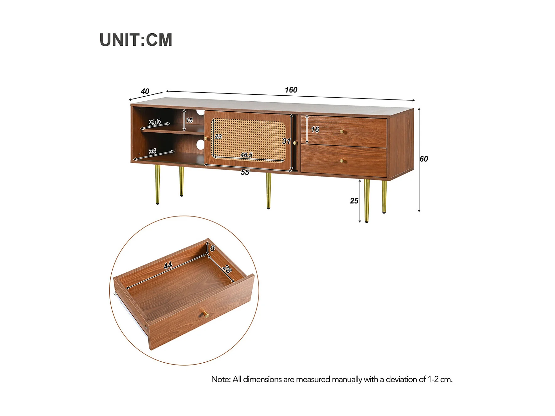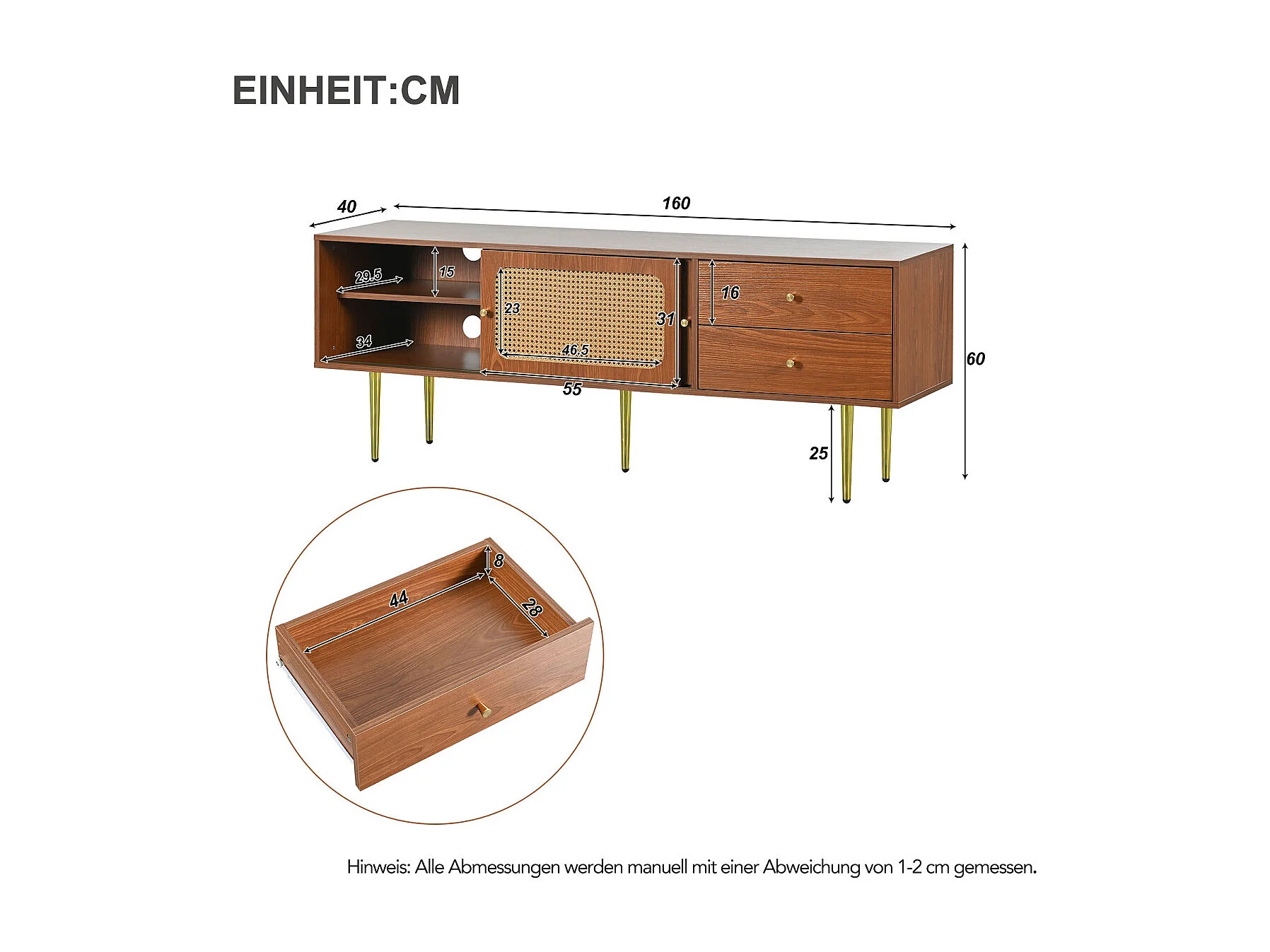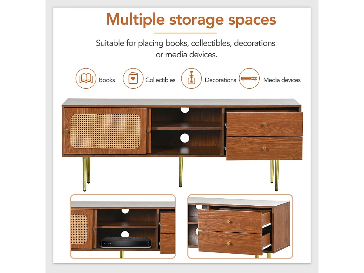 Stijlvolle tv-meubel van walnoothout met rotandeuren en lades - 160x40x60cm