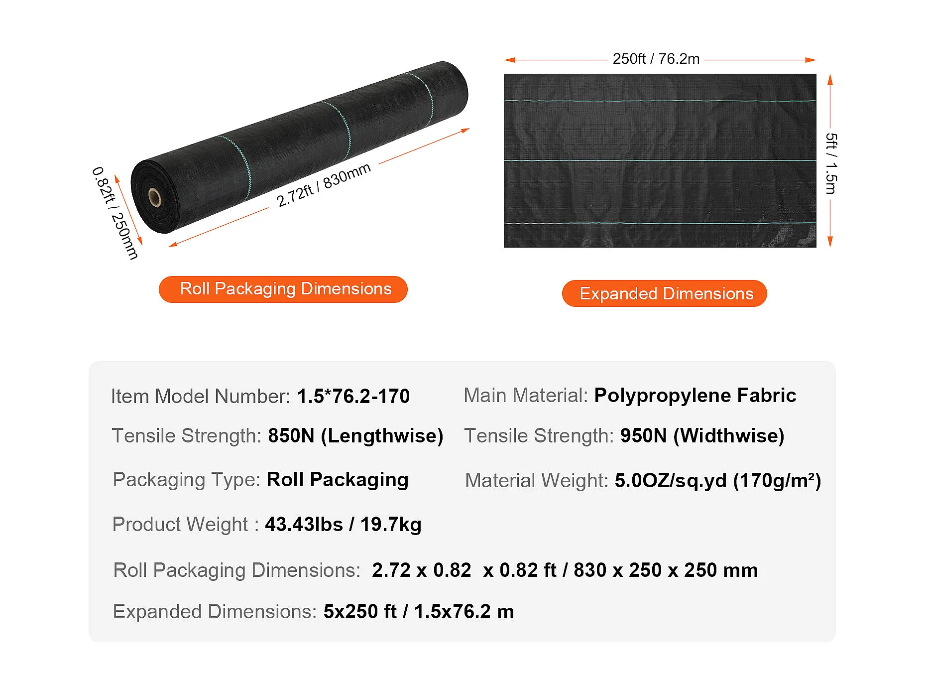 SucceBuy Onkruidbestrijdingsdoek Heavy Duty 5 x 250ft - Geweven PP Onkruidbestrijdingsmat