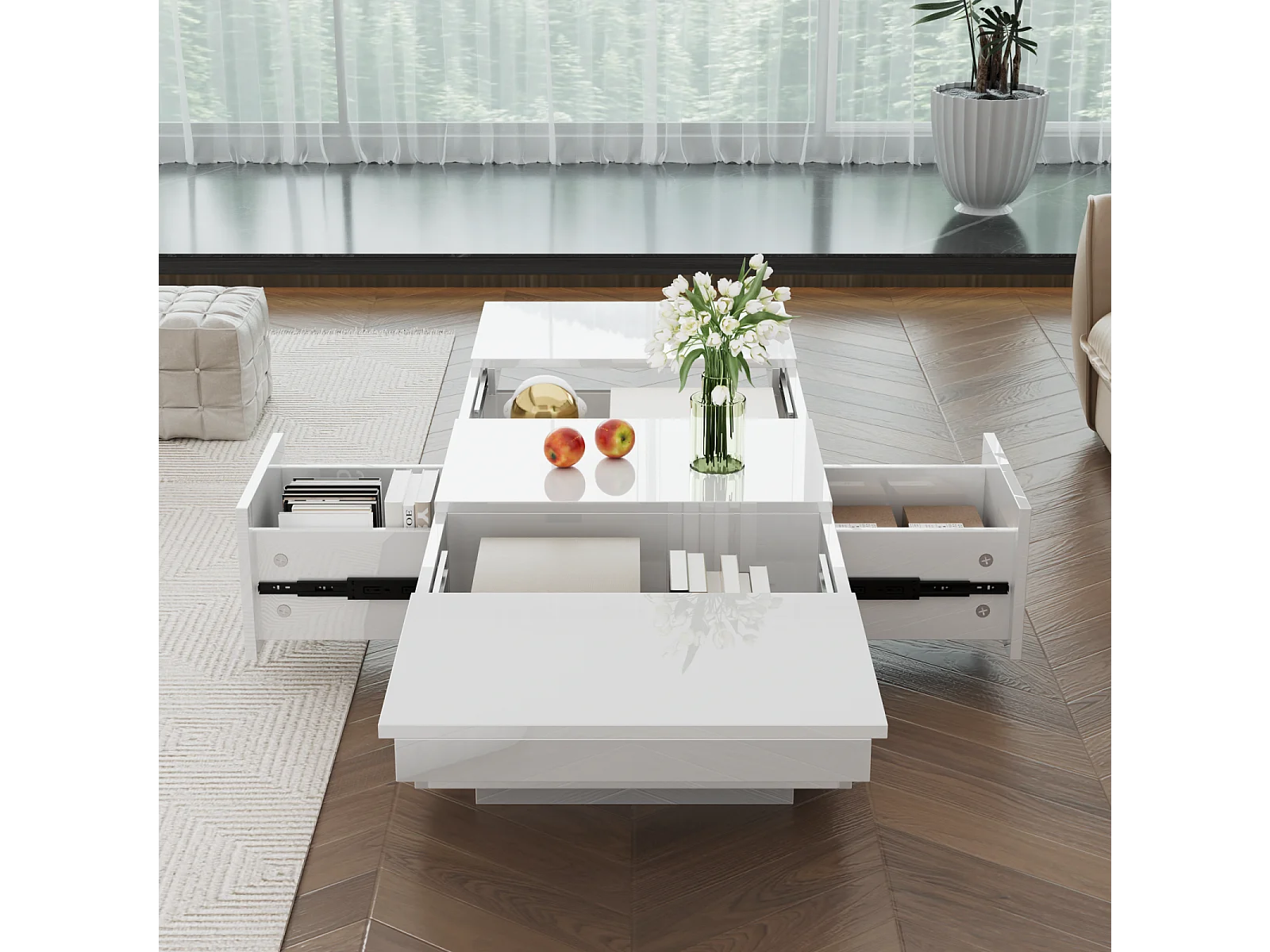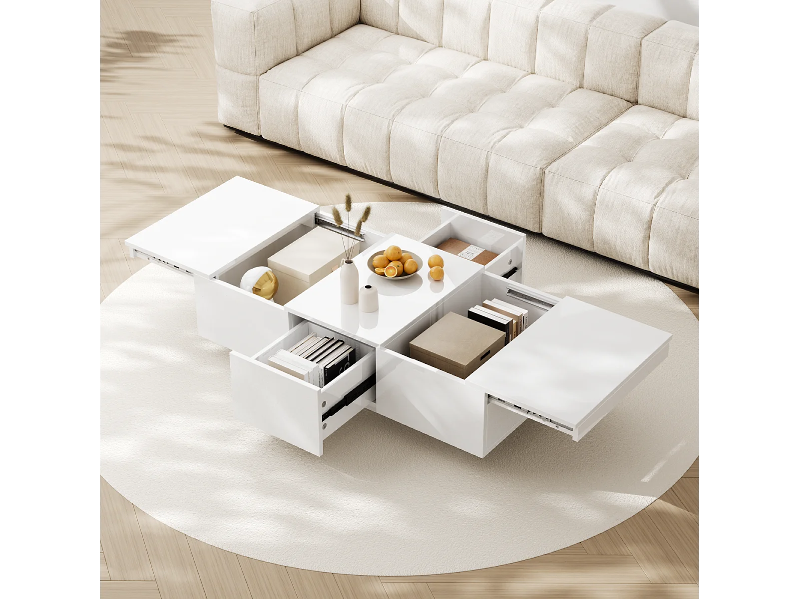 Salontafel 100x50x31cm, hoogglans woonkamertafel met push-pull opbergstructuur, dubbelzijdige lades, wit