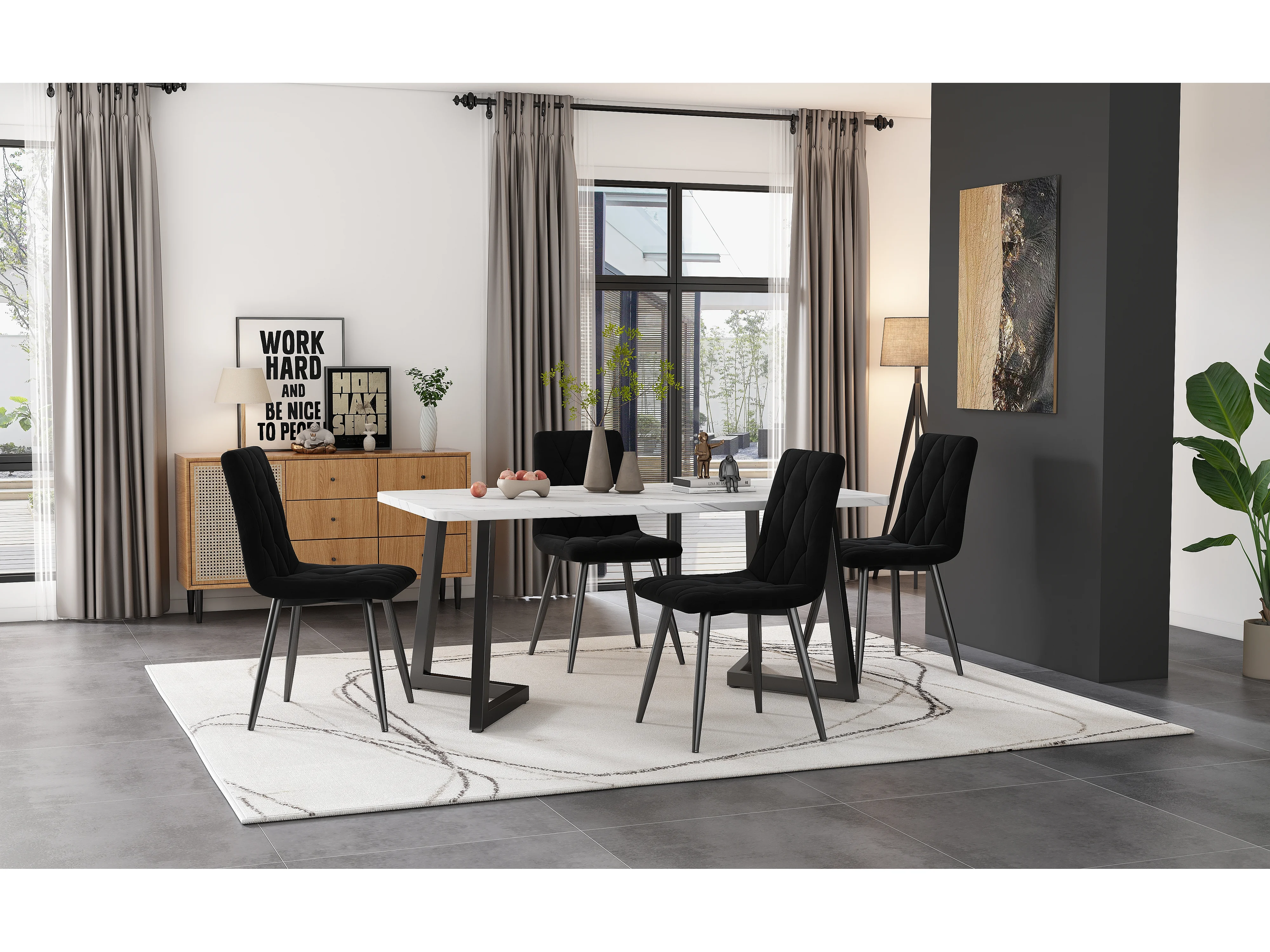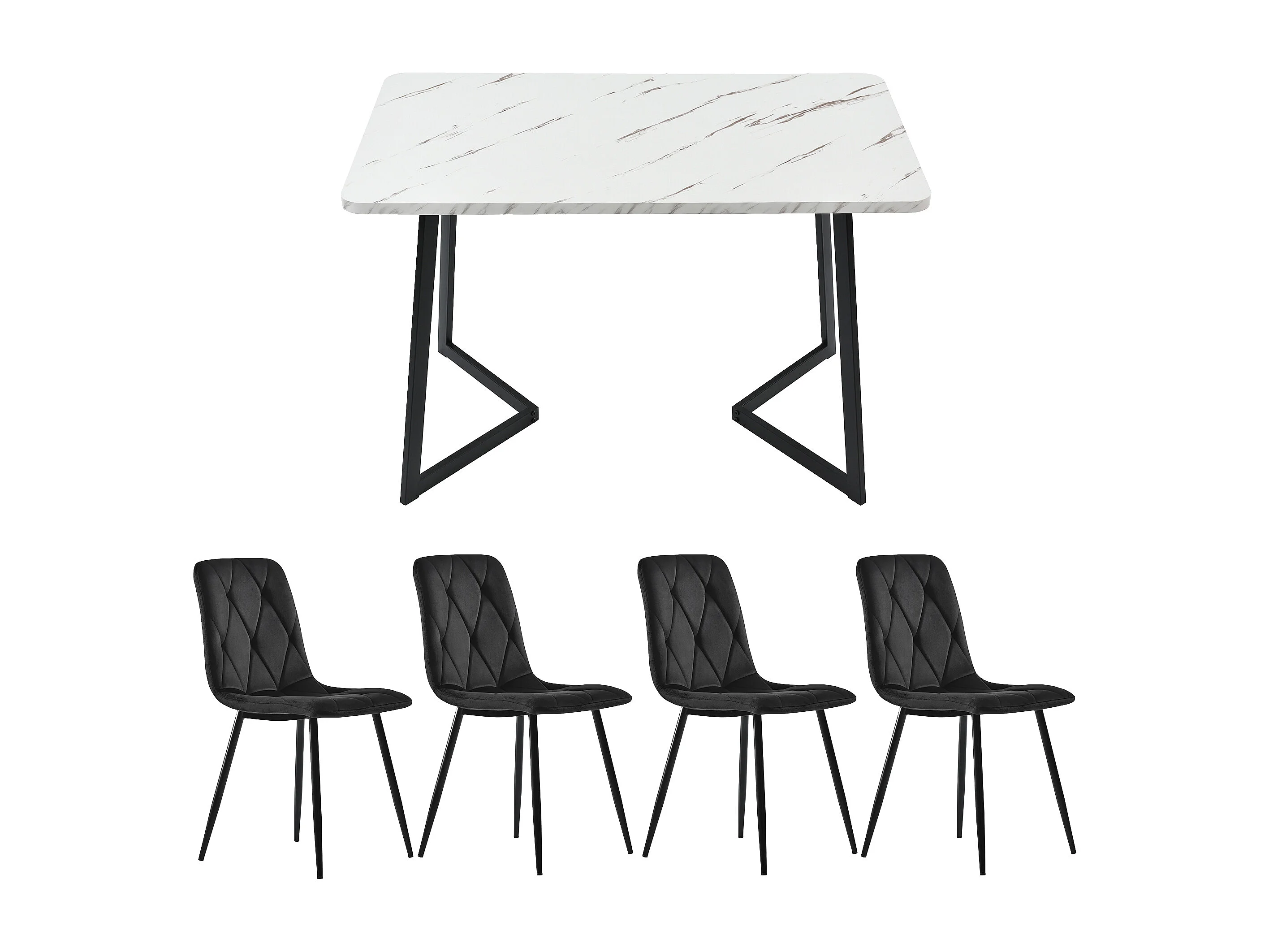 Tafelset + 4 fluwelen stoelen - metalen poten - zwart en wit
