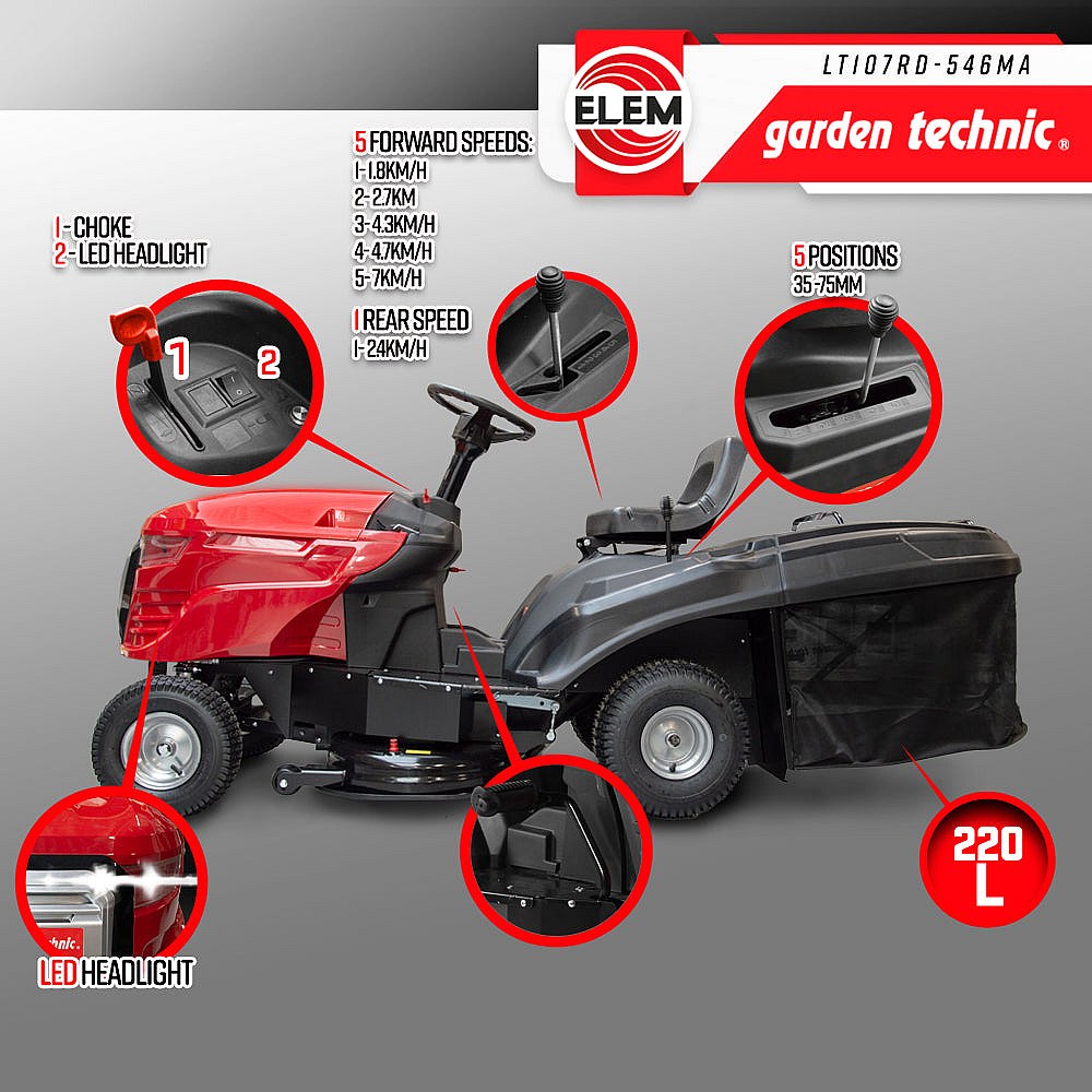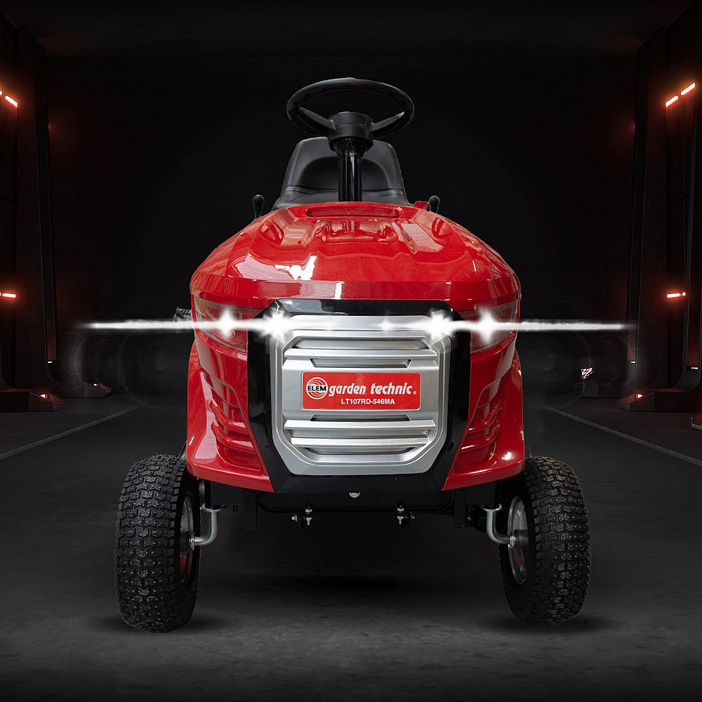 De Loncin 546cc – 11 kW bij 2650 t/min motor zorgt voor efficiënt maaien, zelfs op hellingen tot 17%. Met zijn 5 versnellingen vooruit en 1 achteruit houdt u altijd de controle. Het verhoogde stuur en het ophangingssysteem bieden optimaal rijcomfort.