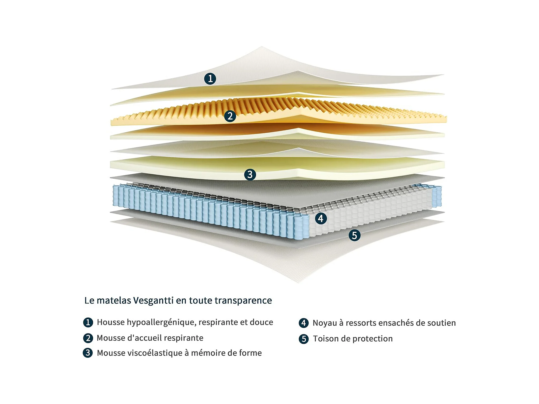 Vesgantti matras 120x190cm, 24cm dik, hybride pocketveren en traagschuim, 7 comfortzones, meerlaags, Oeko-Tex gecertificeerd