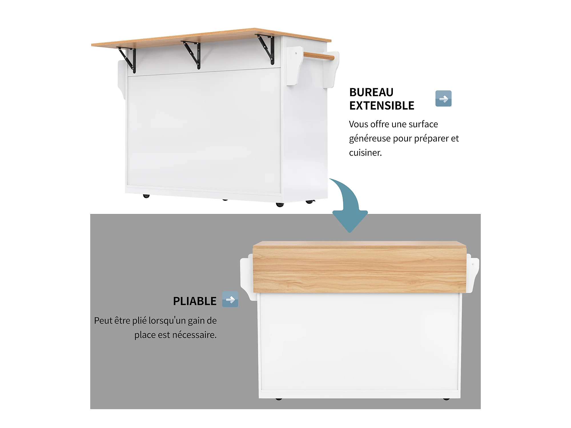 Keukeneiland met 2 laden - Uitschuifbaar werkblad - poten met wielen of massief hout - Wit