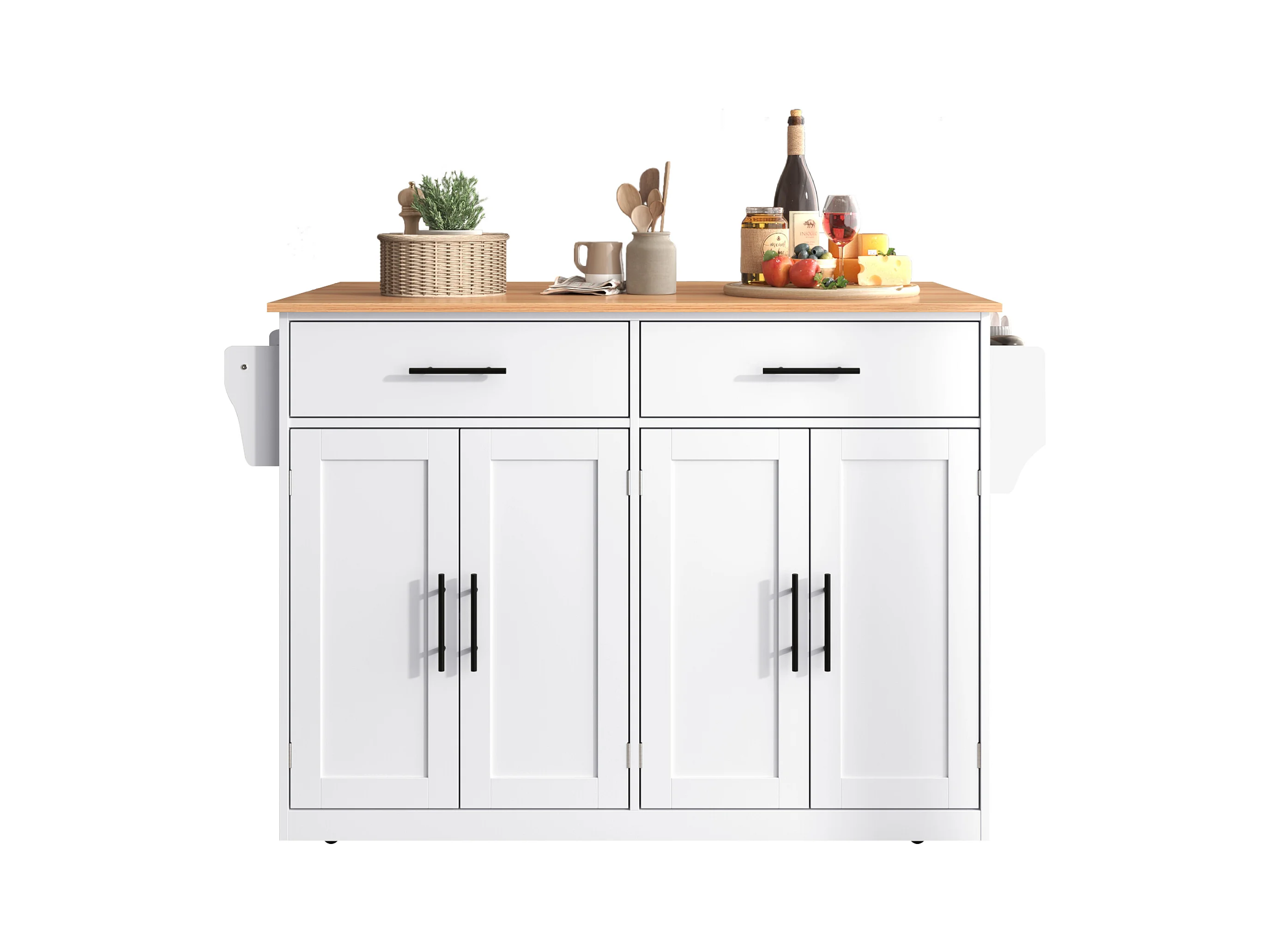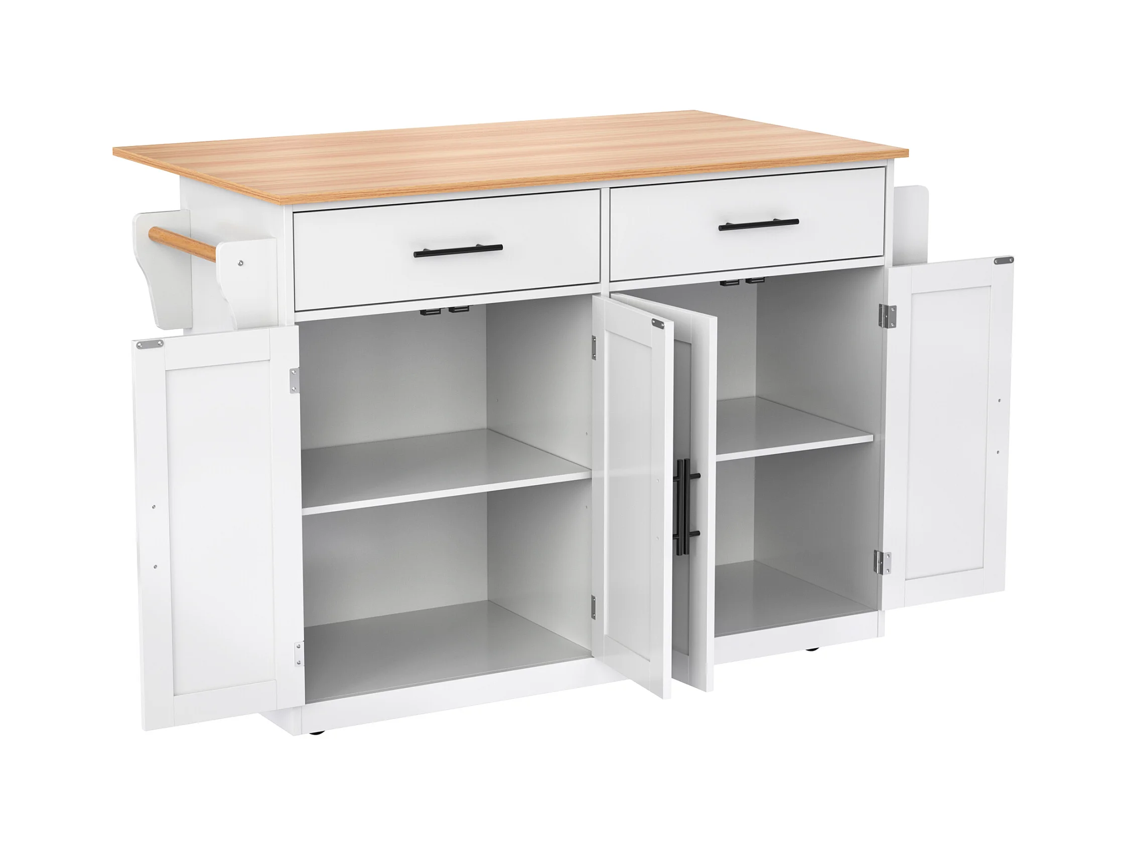 Mobiele centrale keukeneiland - Uitklapbaar bord - 2 lades + kastdeuren voor opslag - Wit