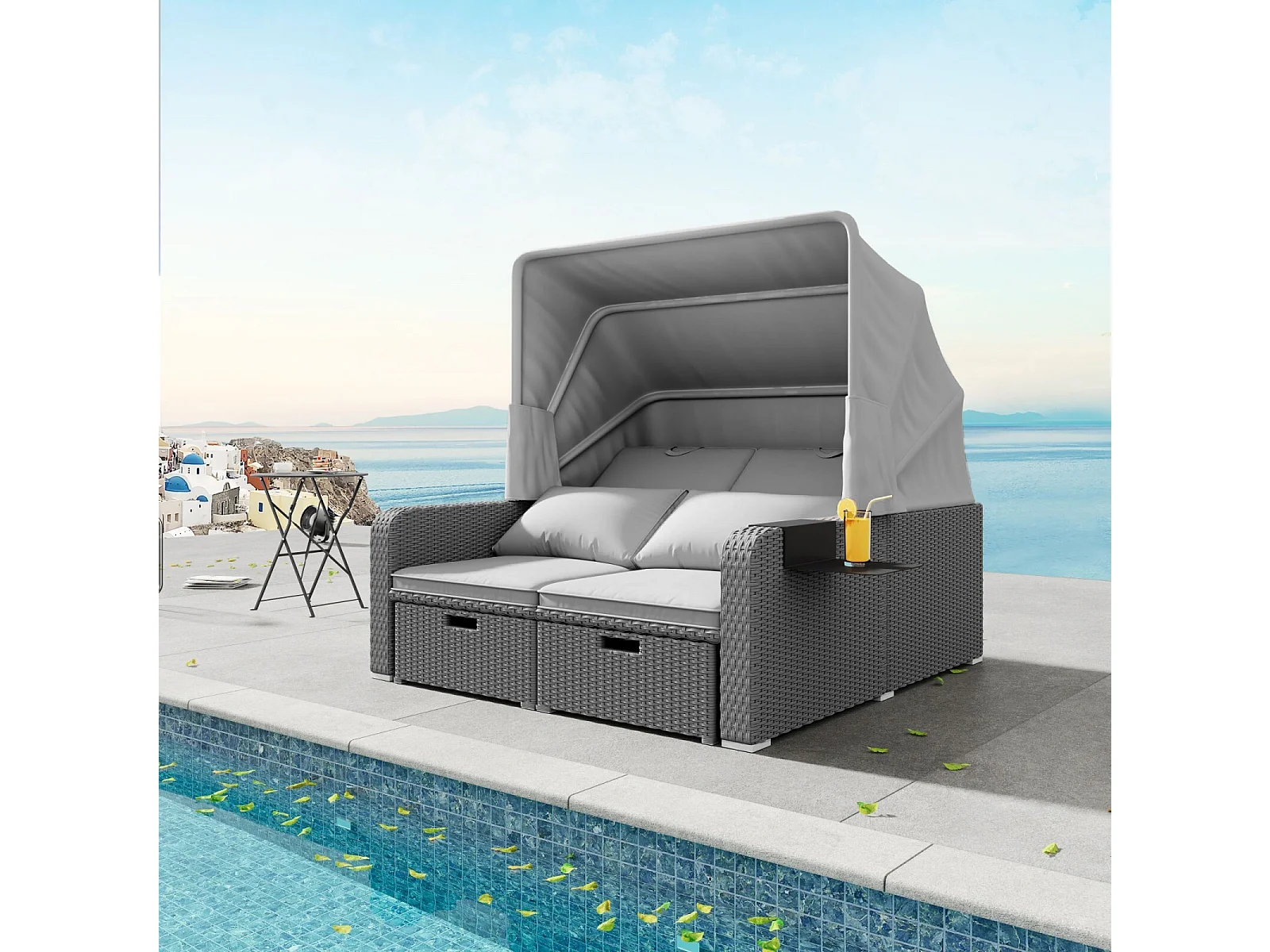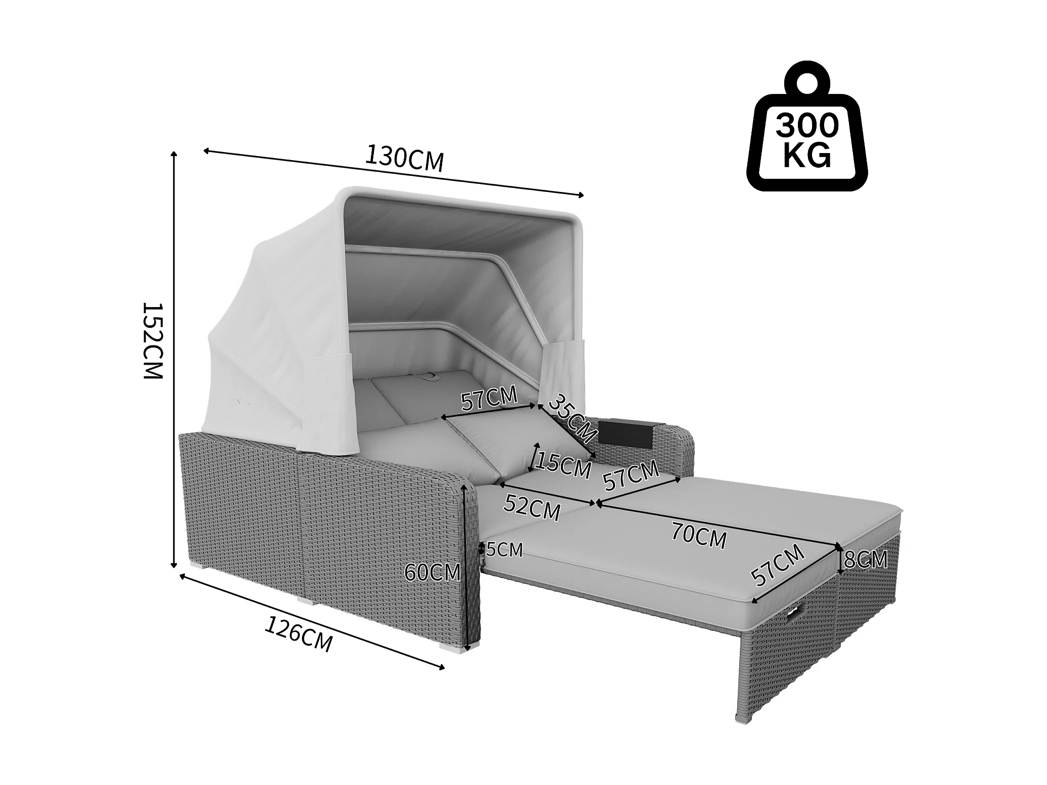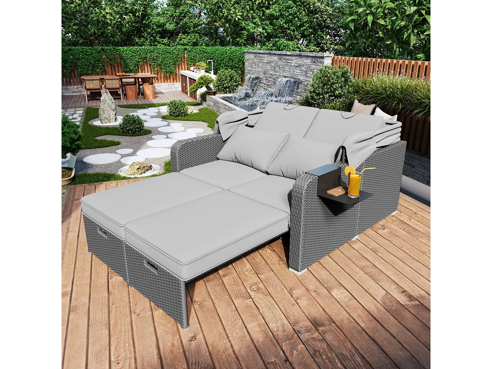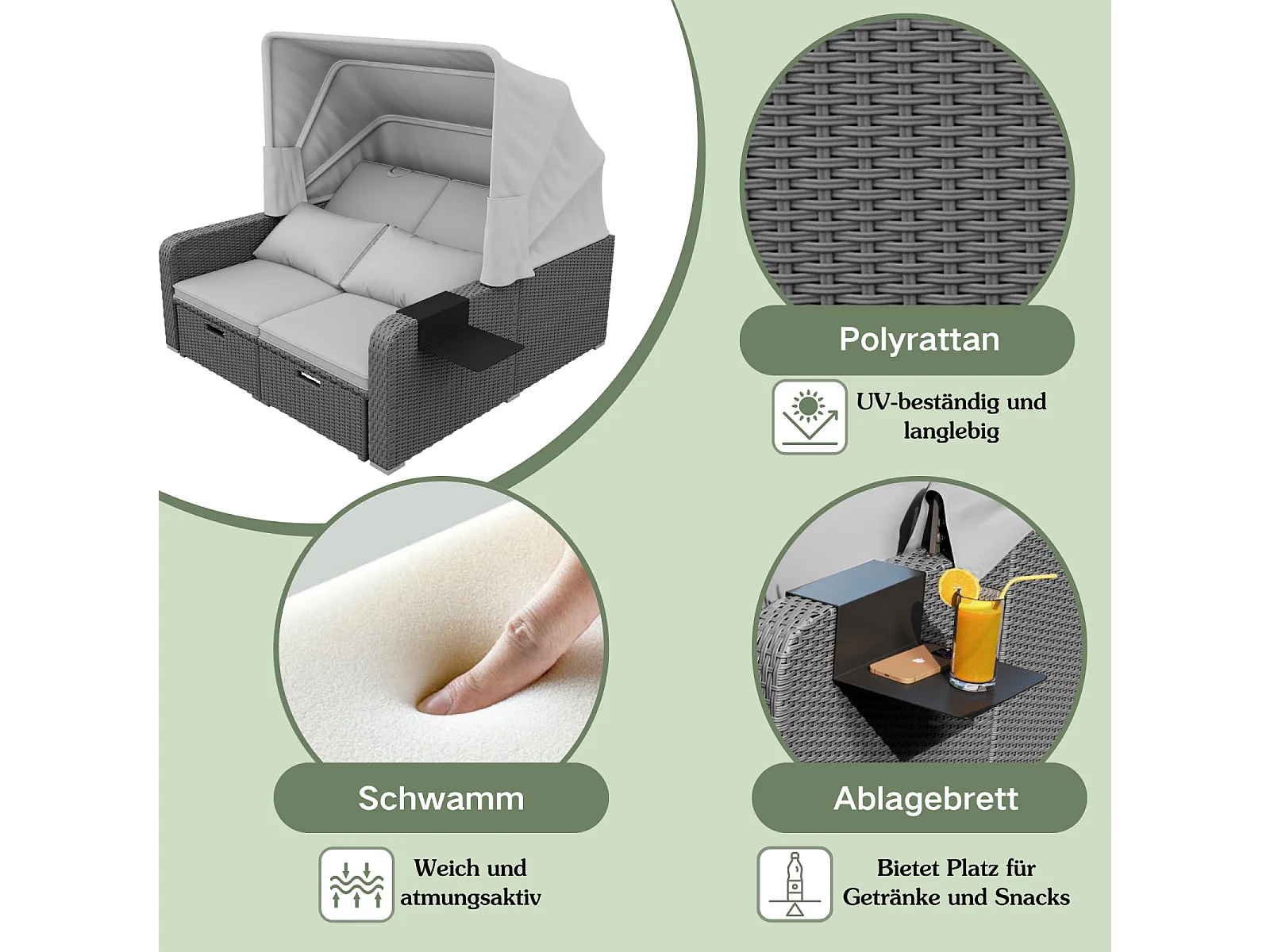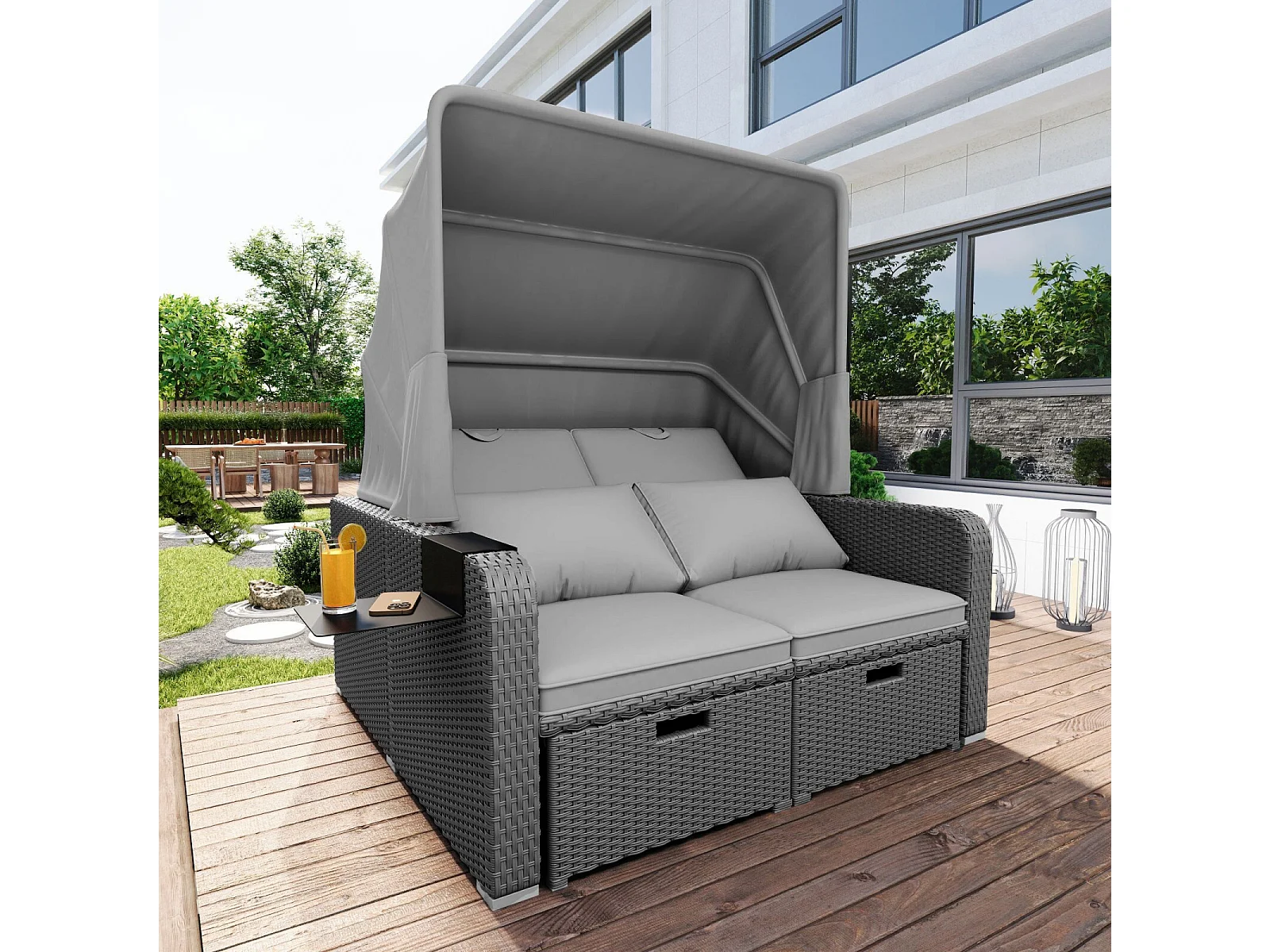 Tuinbank 2-zits, conversiebank, van poly riet en spons, met verwijderbaar zonnescherm, 126/196x130x152cm, Grijs