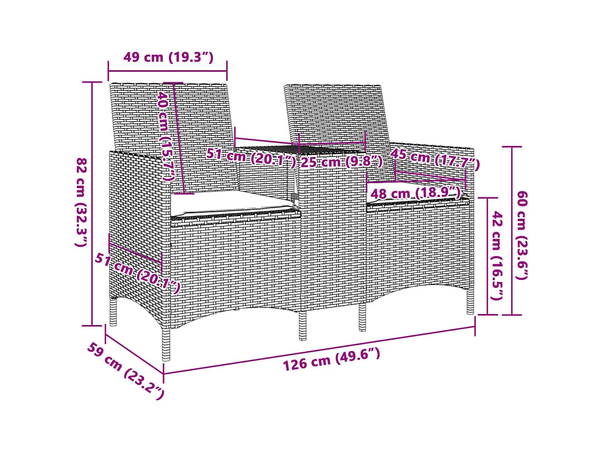 Tuinbank 2-zits met tafel en kussens poly rattan grijs