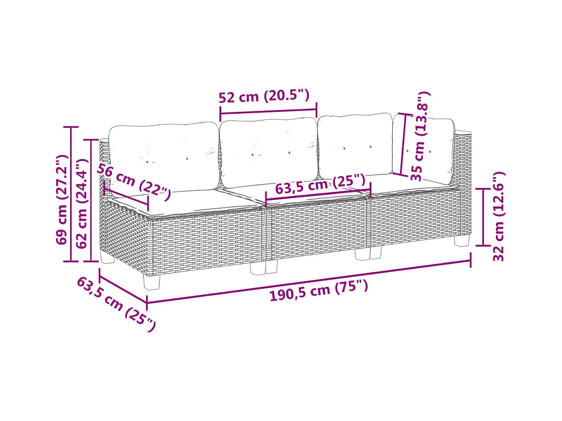 Tuinbank 3-zits met kussens poly rattan beige