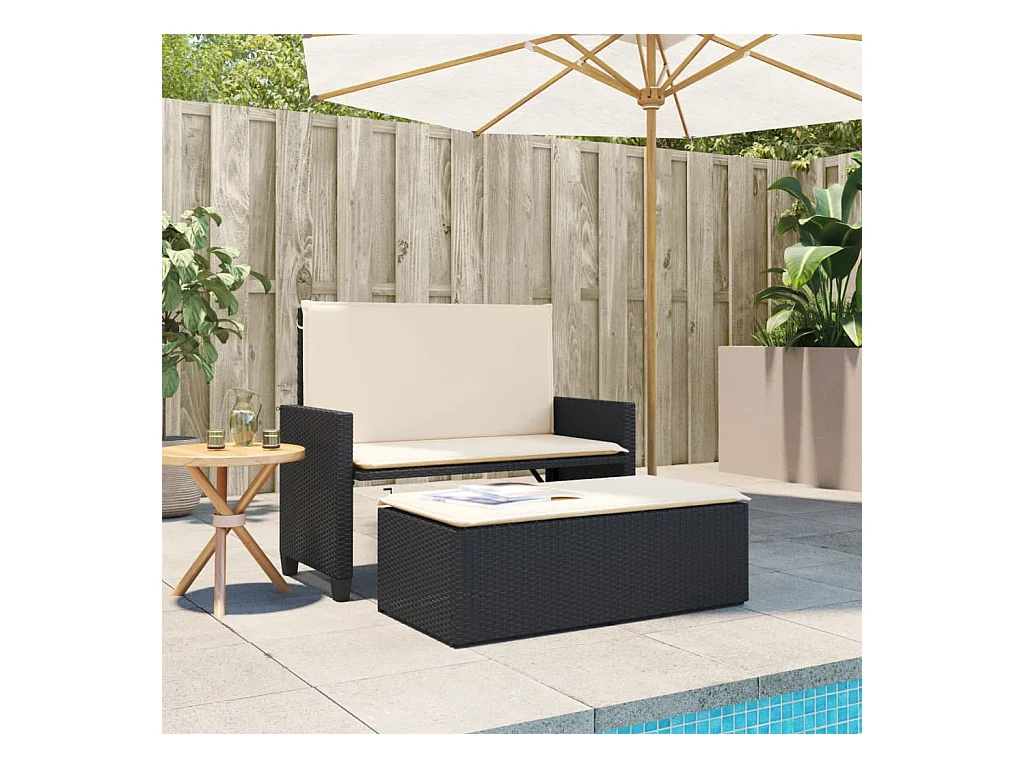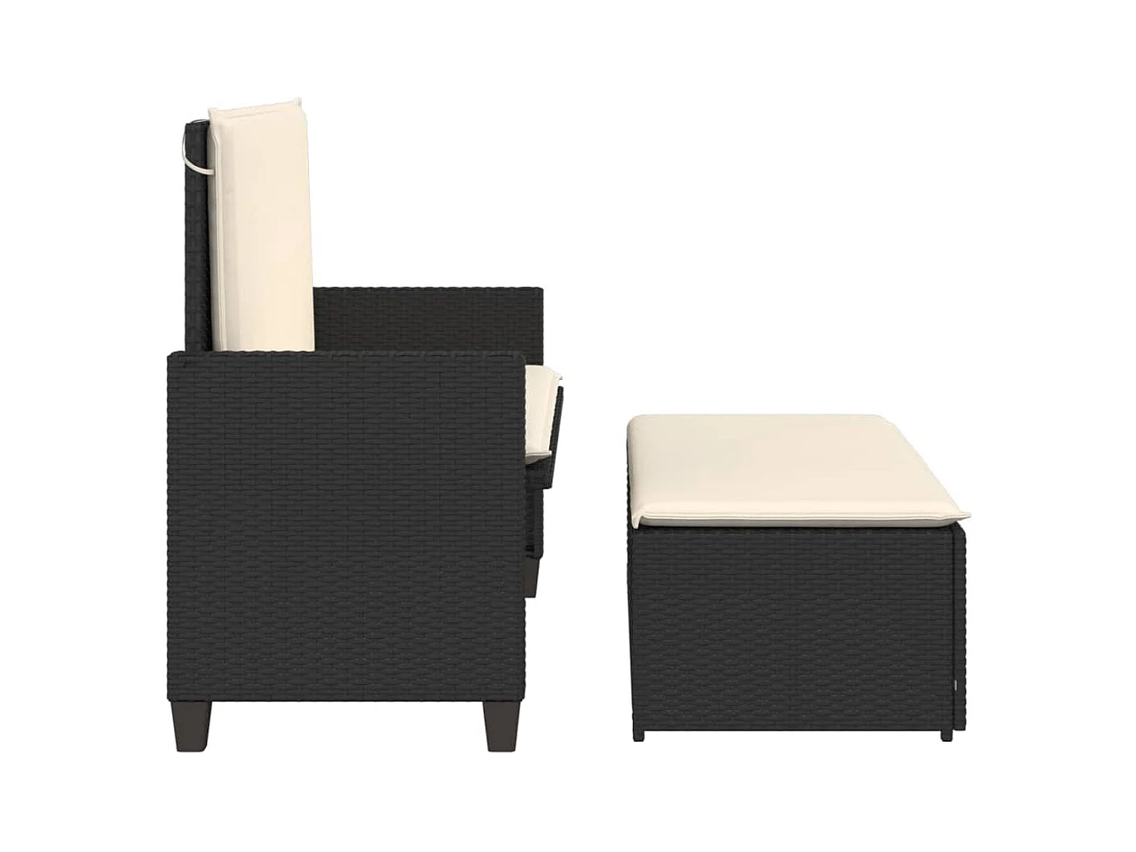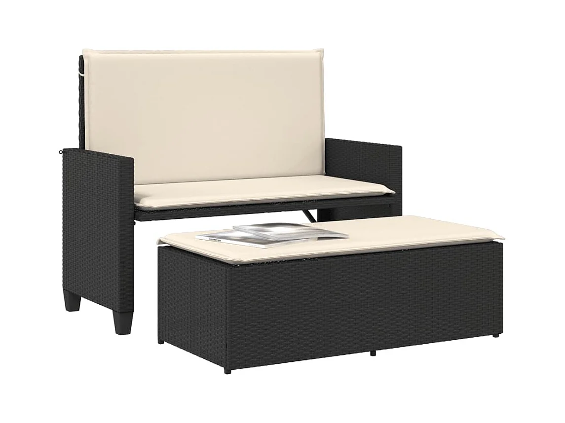 Tuinbank met kussens en zwarte voetenbank van gevlochten hars
