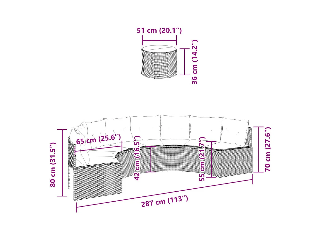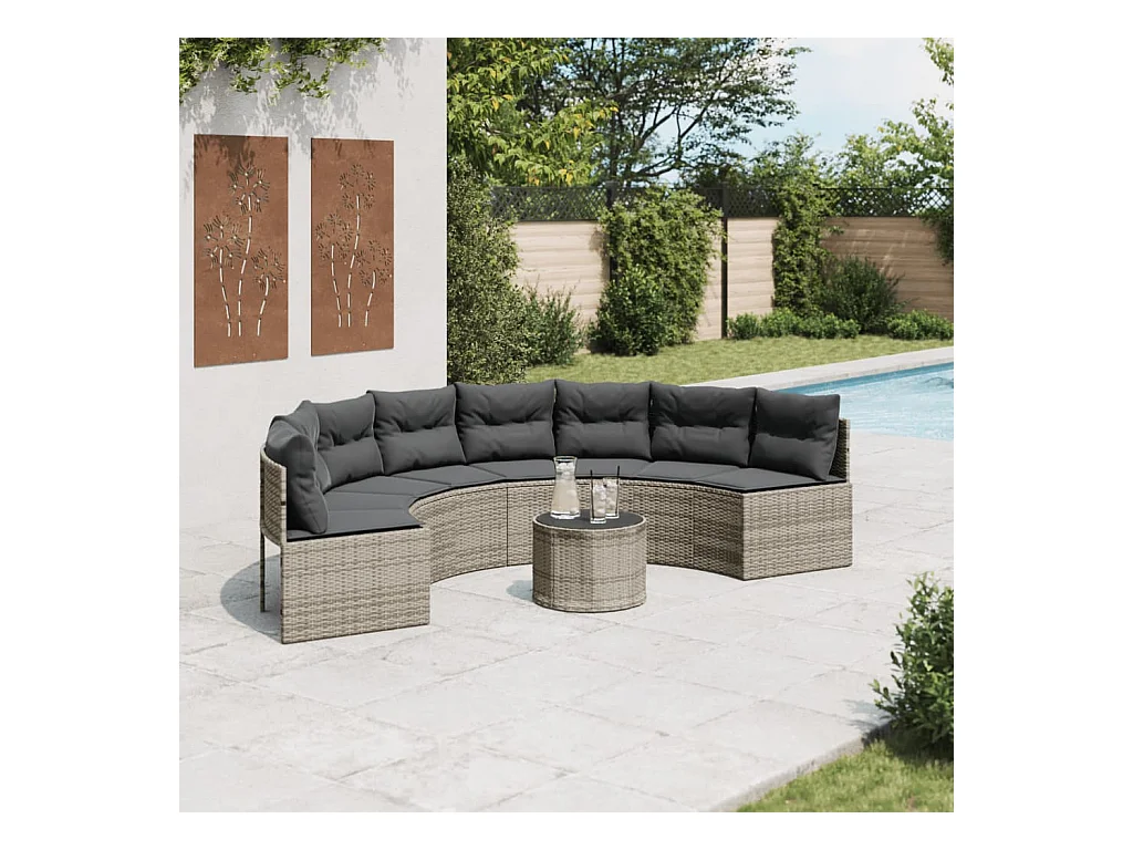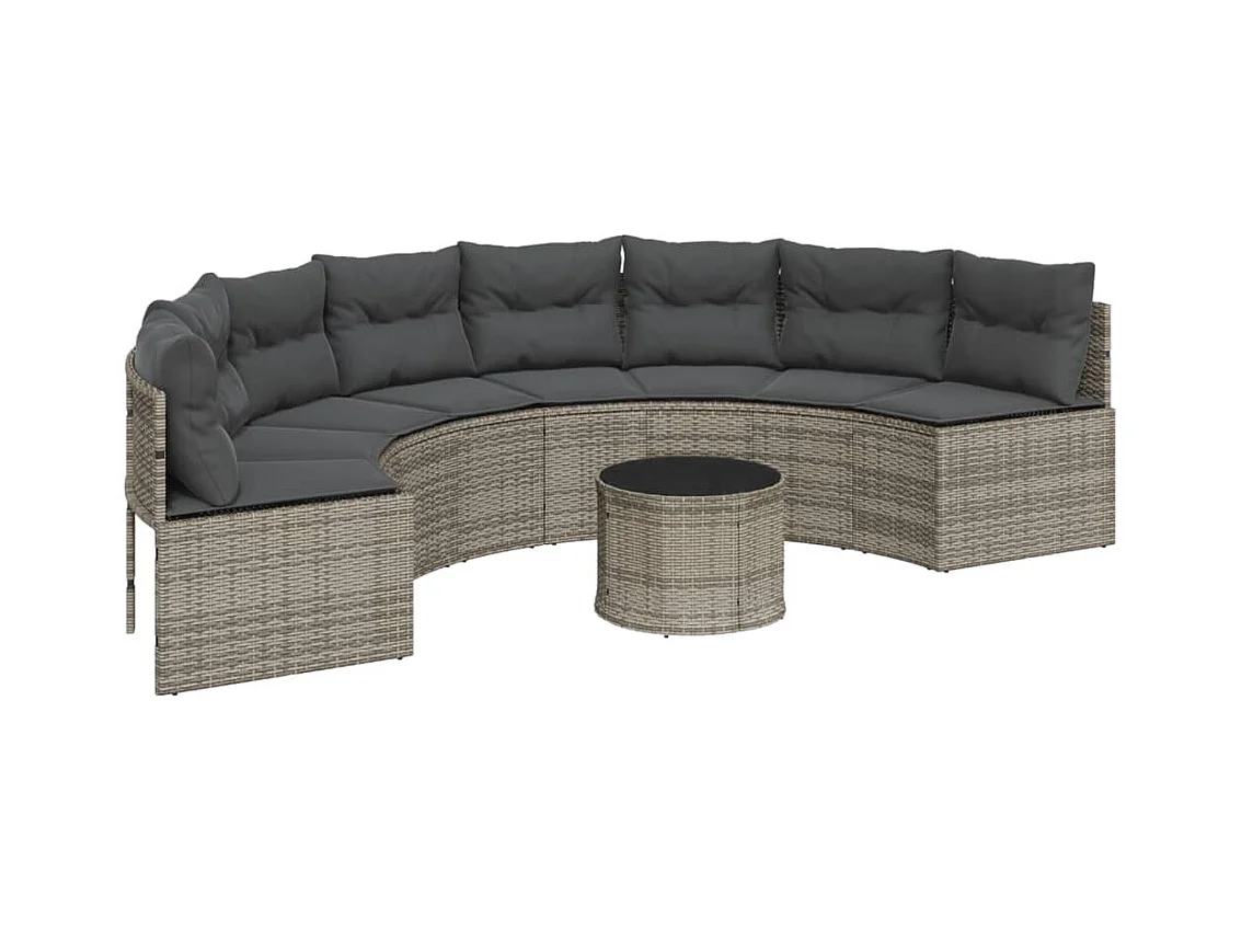 Tuinbank met tafel en kussens halfrond poly rattan grijs