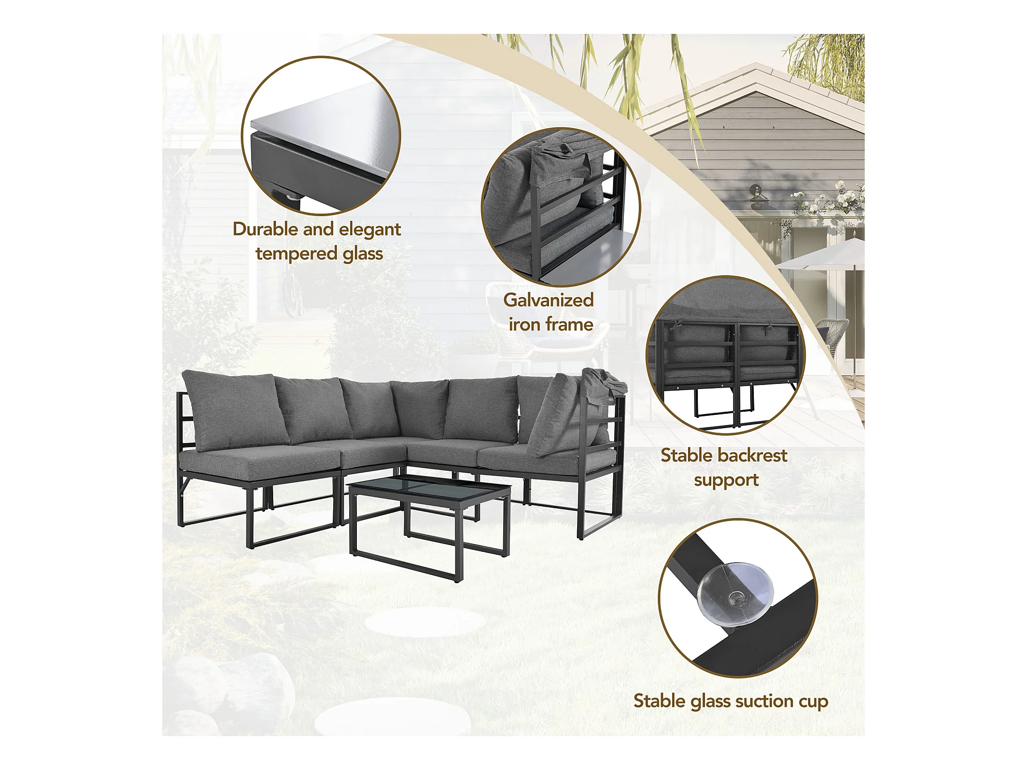 Modulaire tuin in metaal: 5-zits bank met grijze kussens, 2 glazen salontafels - verstelbare poten