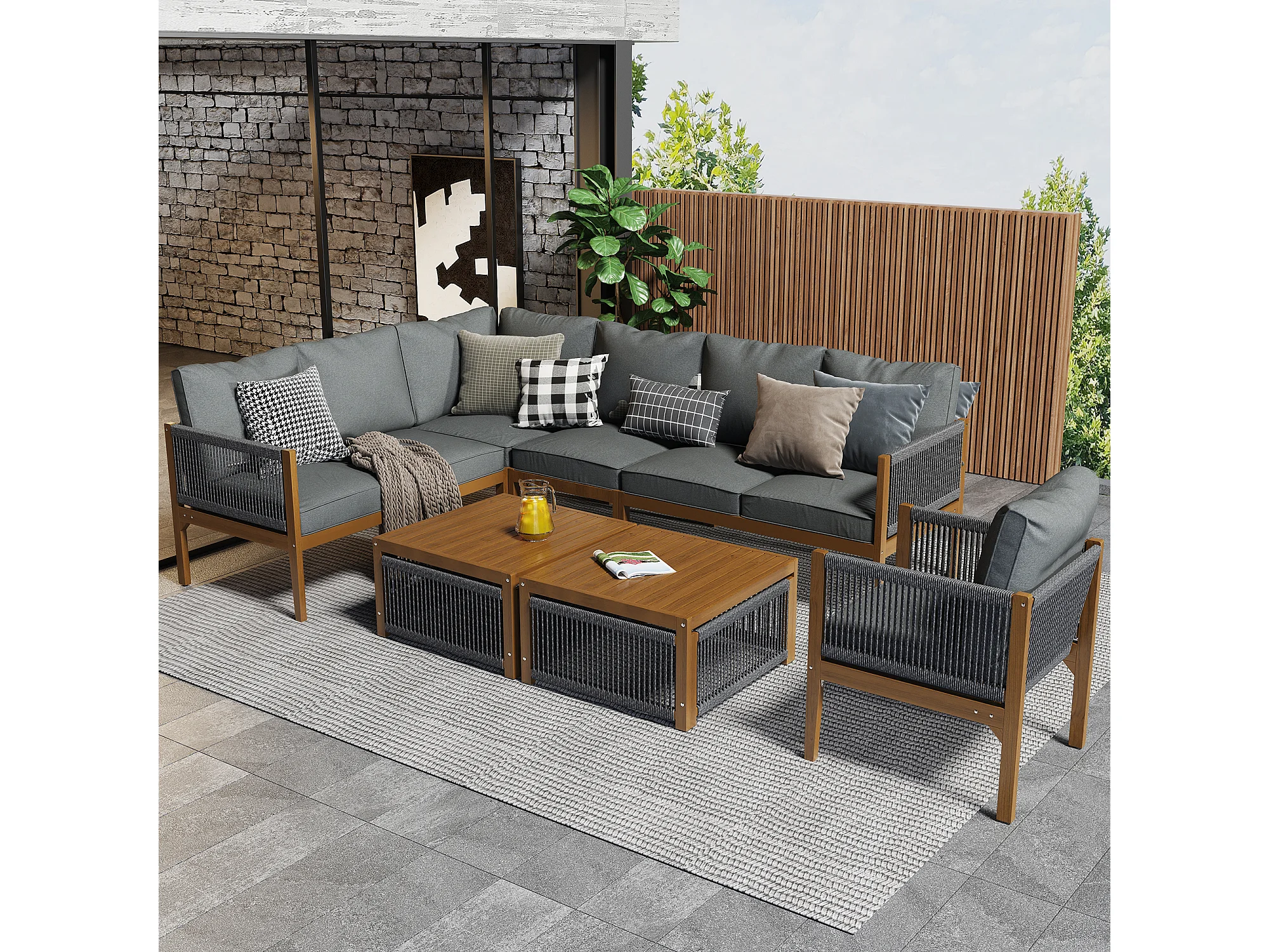 Tuinmeubelset, tuinloungeset voor 7-8 personen, frame van acaciahout, afneembare stoffen hoes, naturel & grijs (lengte: 200x100x75 cm)