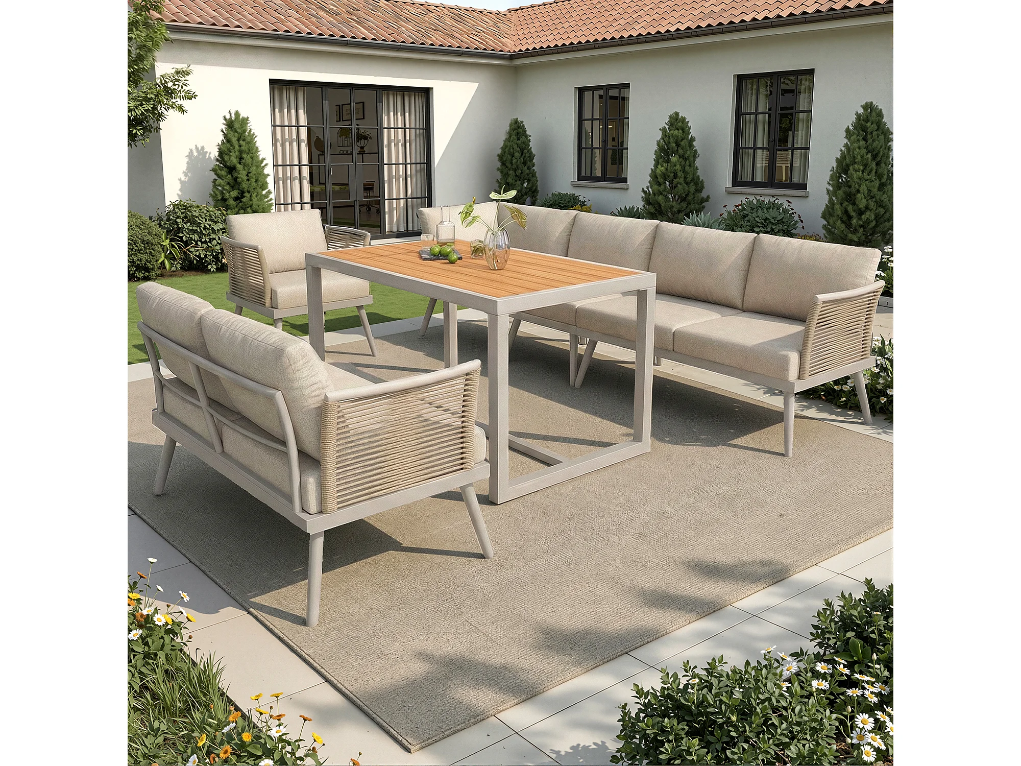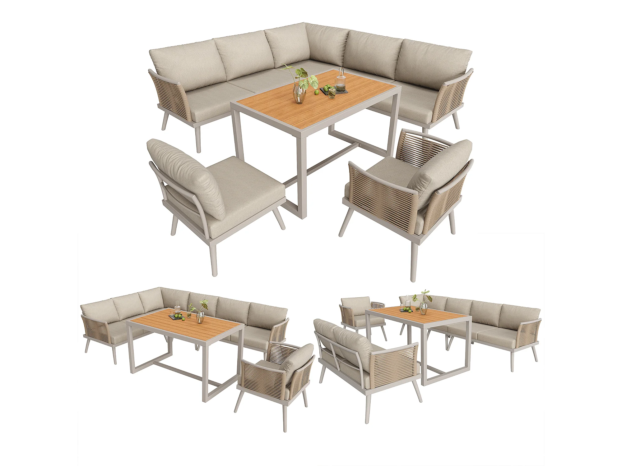 Tuinsalon, meubelset, voor 6-7 personen - hoekbank - 2 fauteuils - tafel - touwwerk - van gegalvaniseerd ijzer, Beige