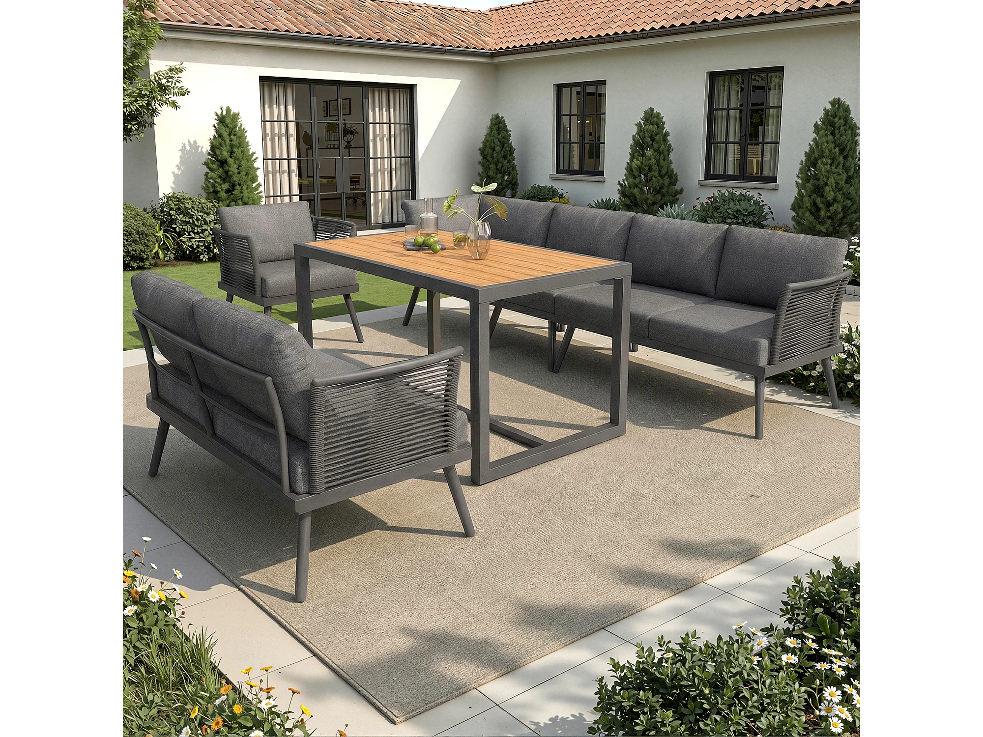 Tuinsalon, meubelset, voor 6-7 personen - hoekbank - 2 fauteuils - tafel - touwwerk - van gegalvaniseerd ijzer, Grijs