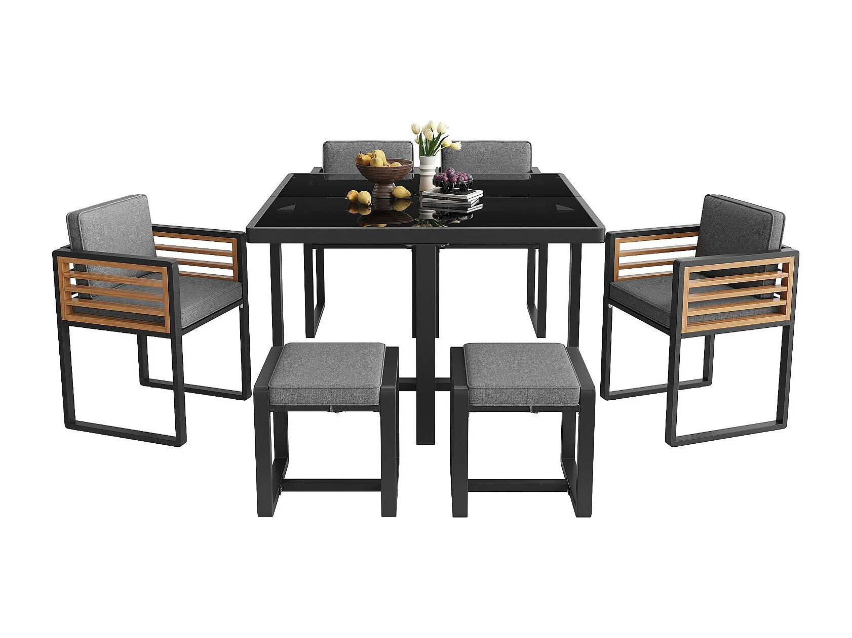 Tuinset, bestaande uit zes stoelen en een tafel voor zes personen, met glazen blad, grijs.