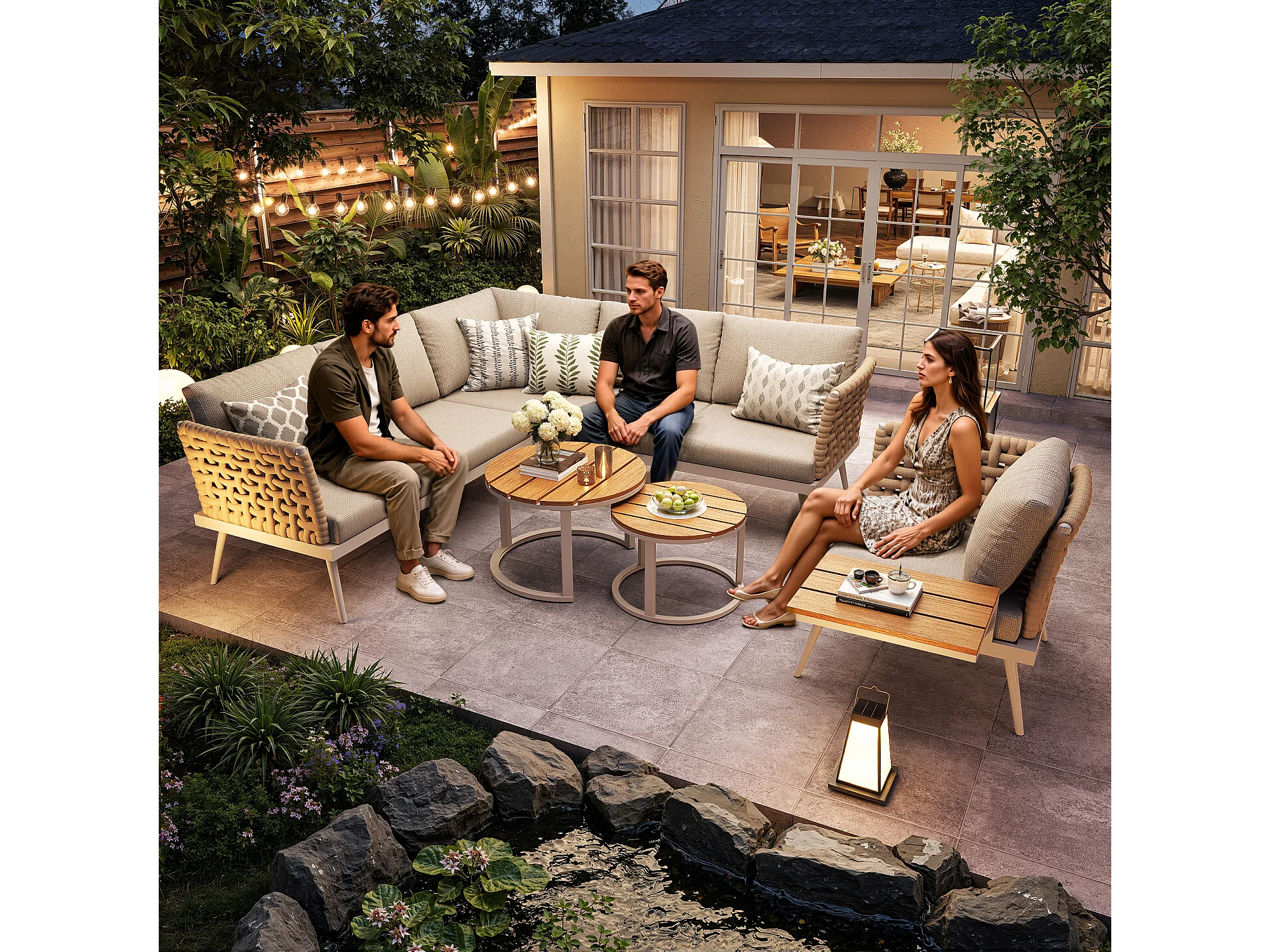 Tuinset voor 6 personen - bank met handgeweven armleuningen + fauteuil + 2 tafels + kussens - metaal - beige