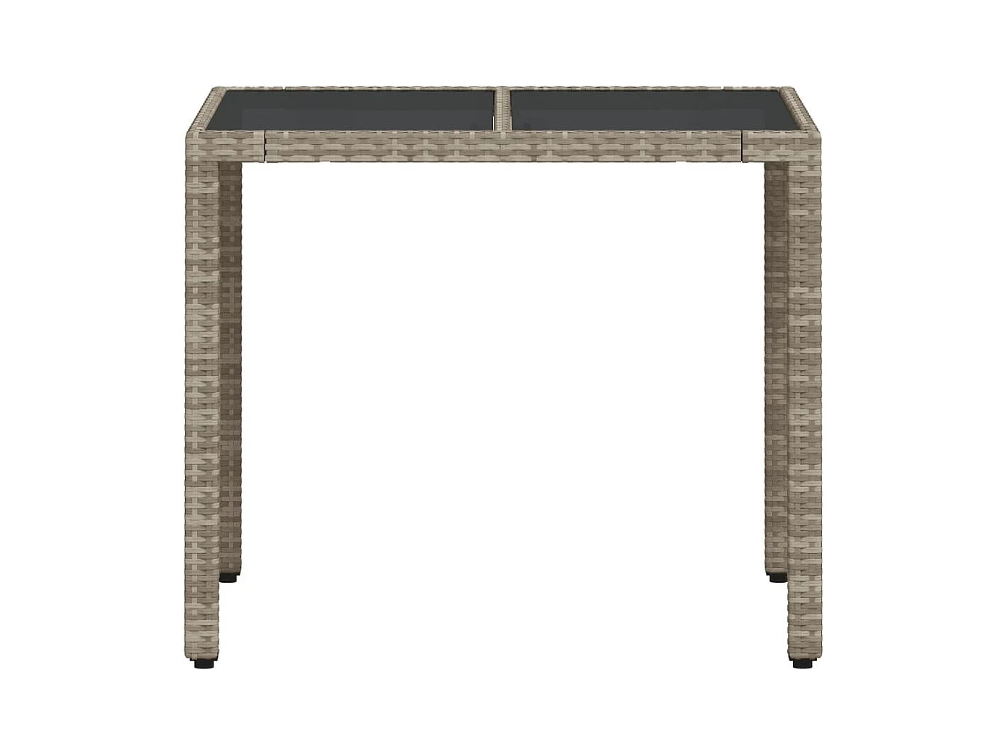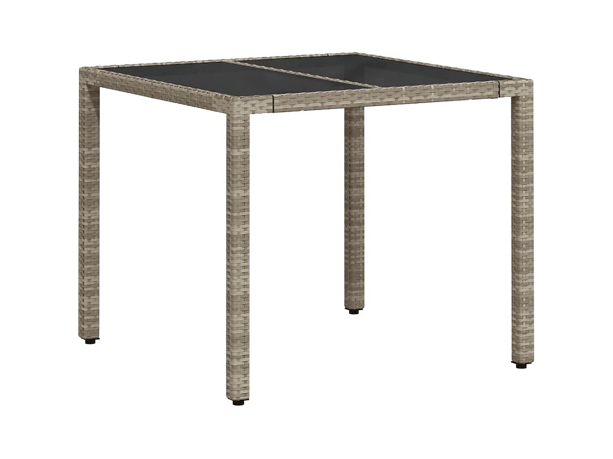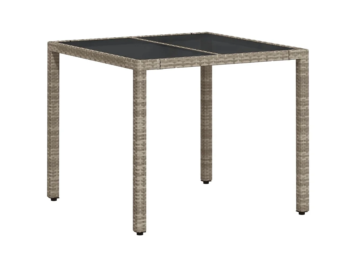 Tuintafel met glazen blad, grijs, 90x90x75 cm, gevlochten hars