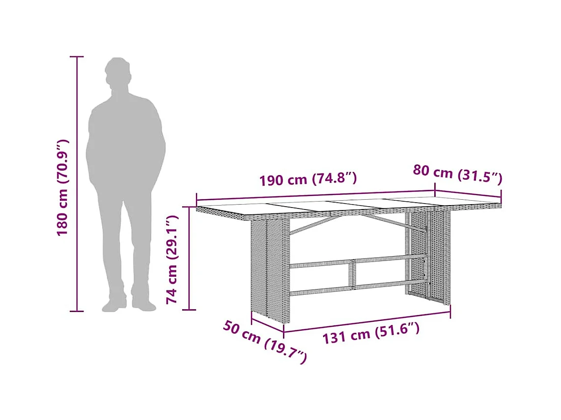 Tuintafel met zwart glazen blad 190x80x74cm gevlochten hars