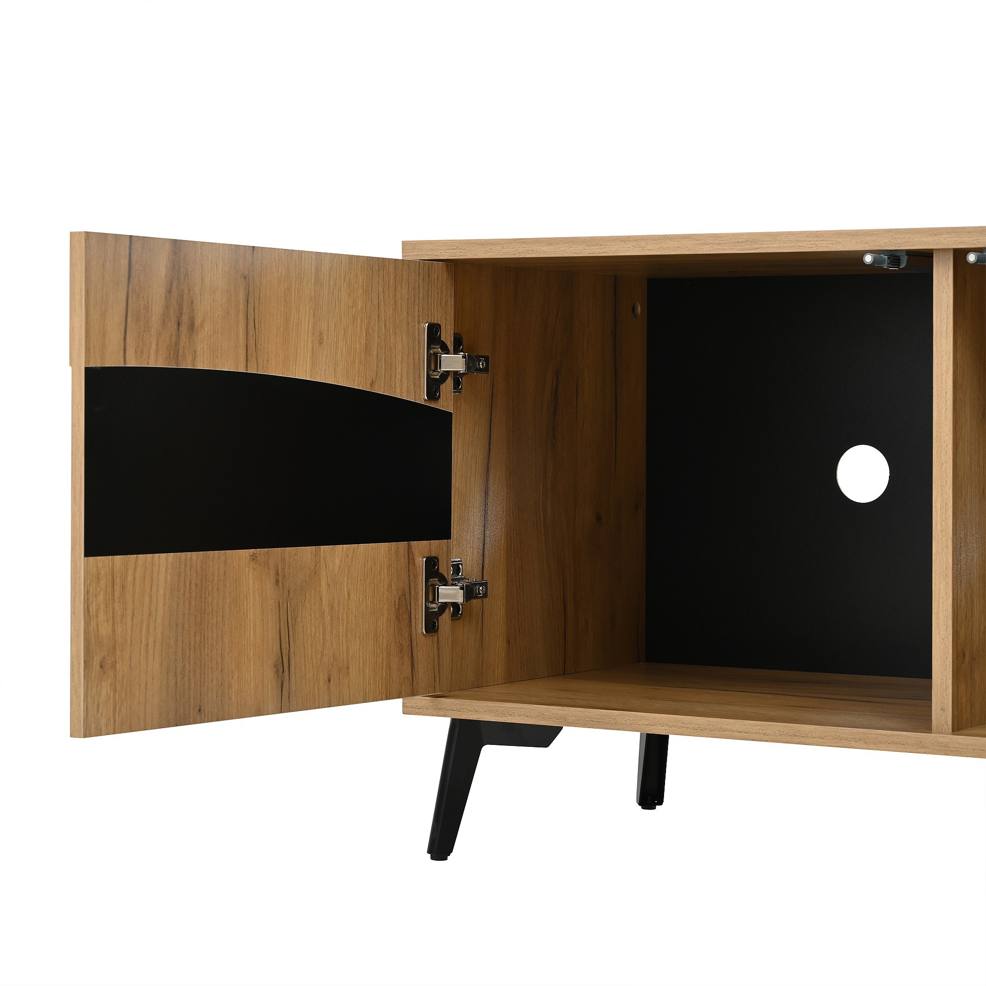 TV-meubel met 2 deuren, 2 lades en 2 nissen, in zwart en natuurlijk houtfineer