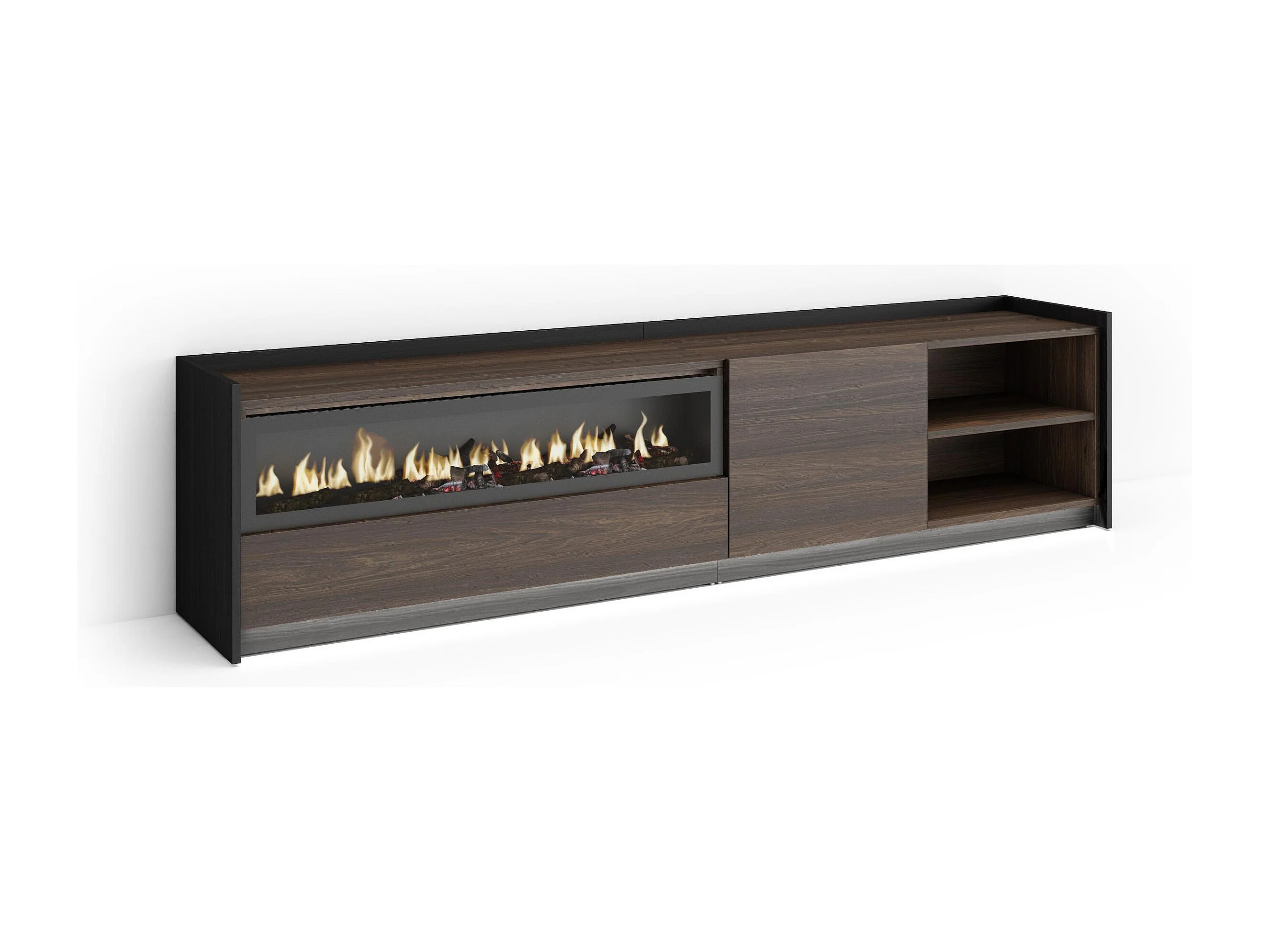 TV-Meubel, Lowboard, 207x50x37 cm, Voor tv's tot 80", Elektrische haard, LED, Donkere eik en Zwart