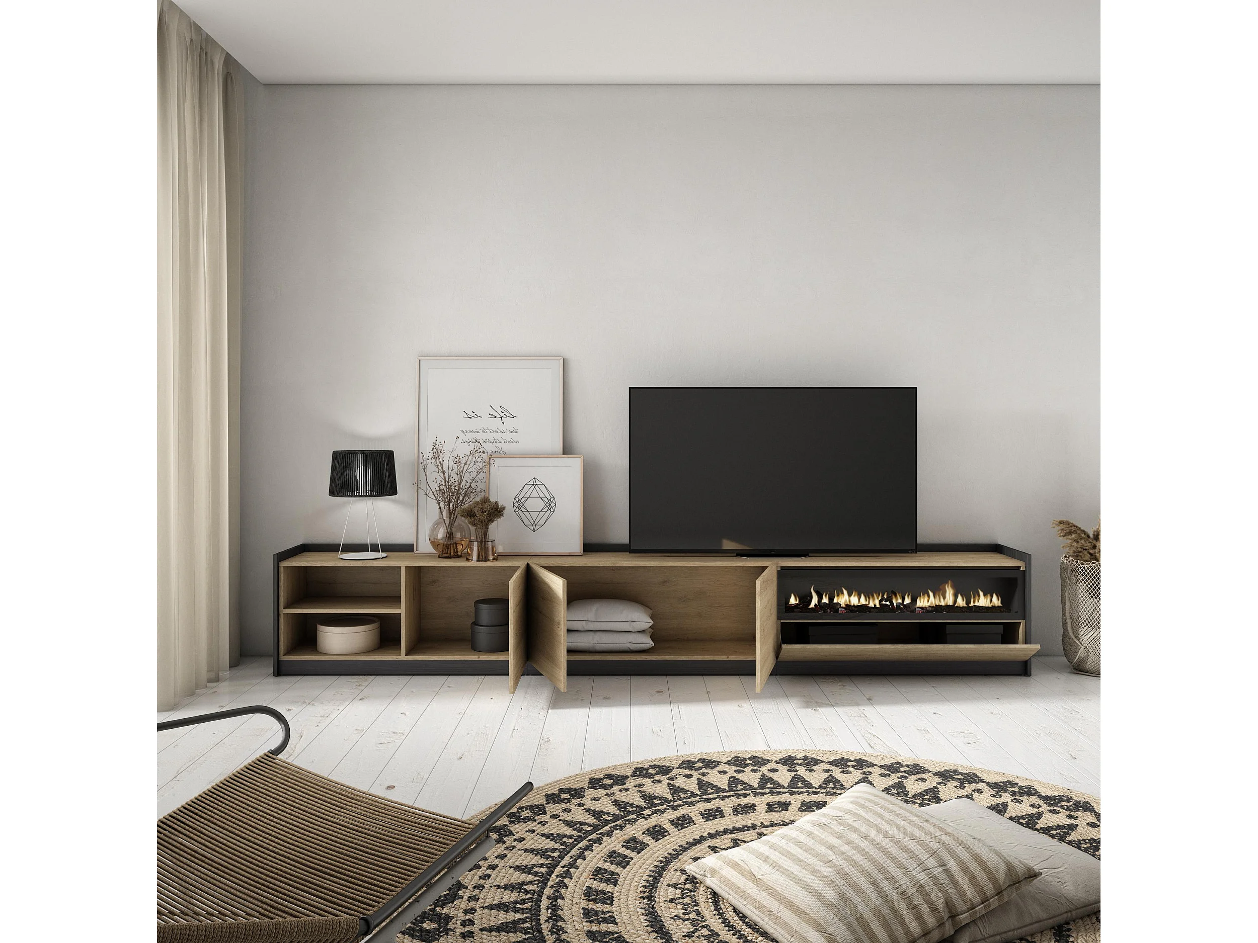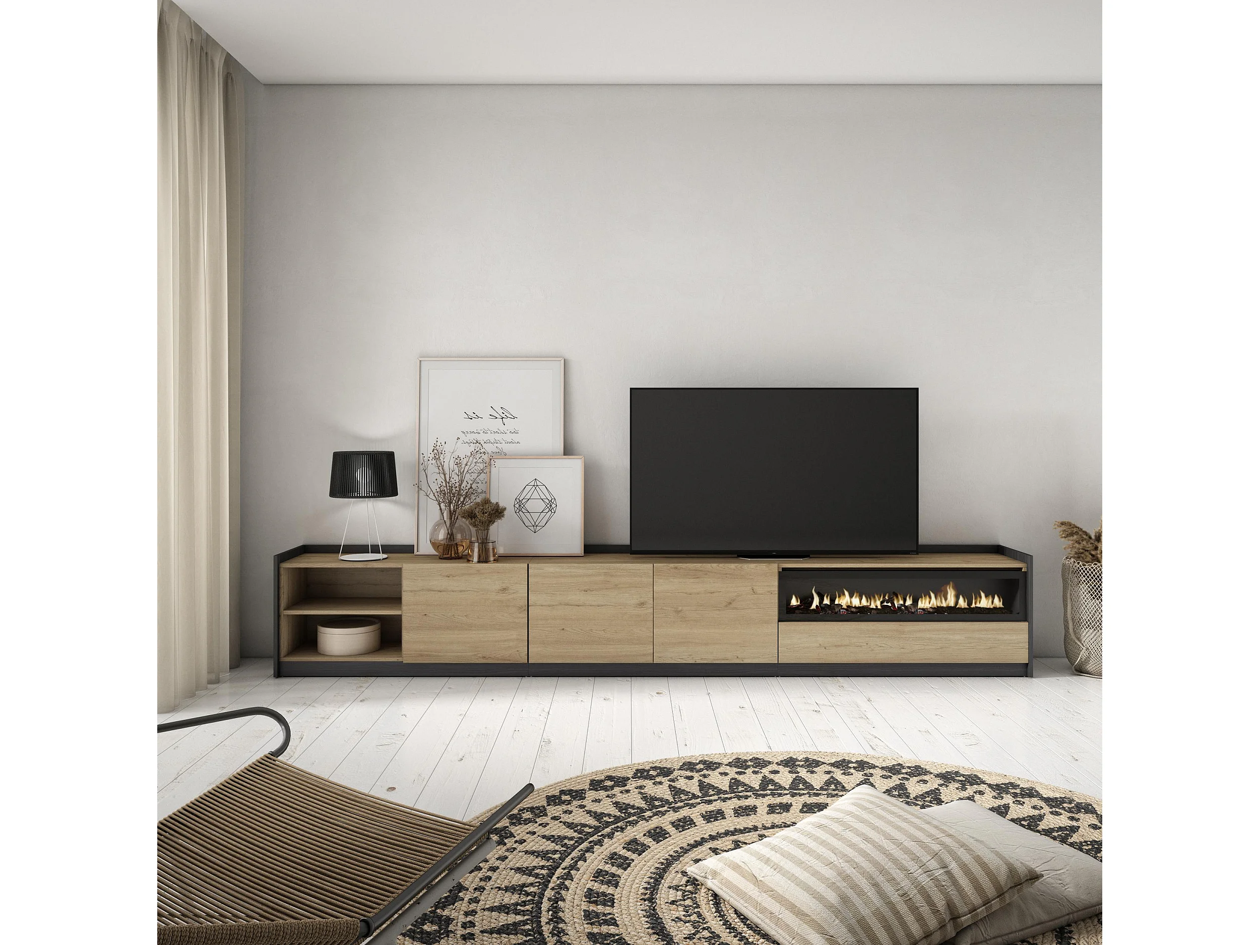 TV-Meubel, Lowboard, 310x50x37 cm, Voor tv's tot 80", Elektrische haard, Eiken/Zwart
